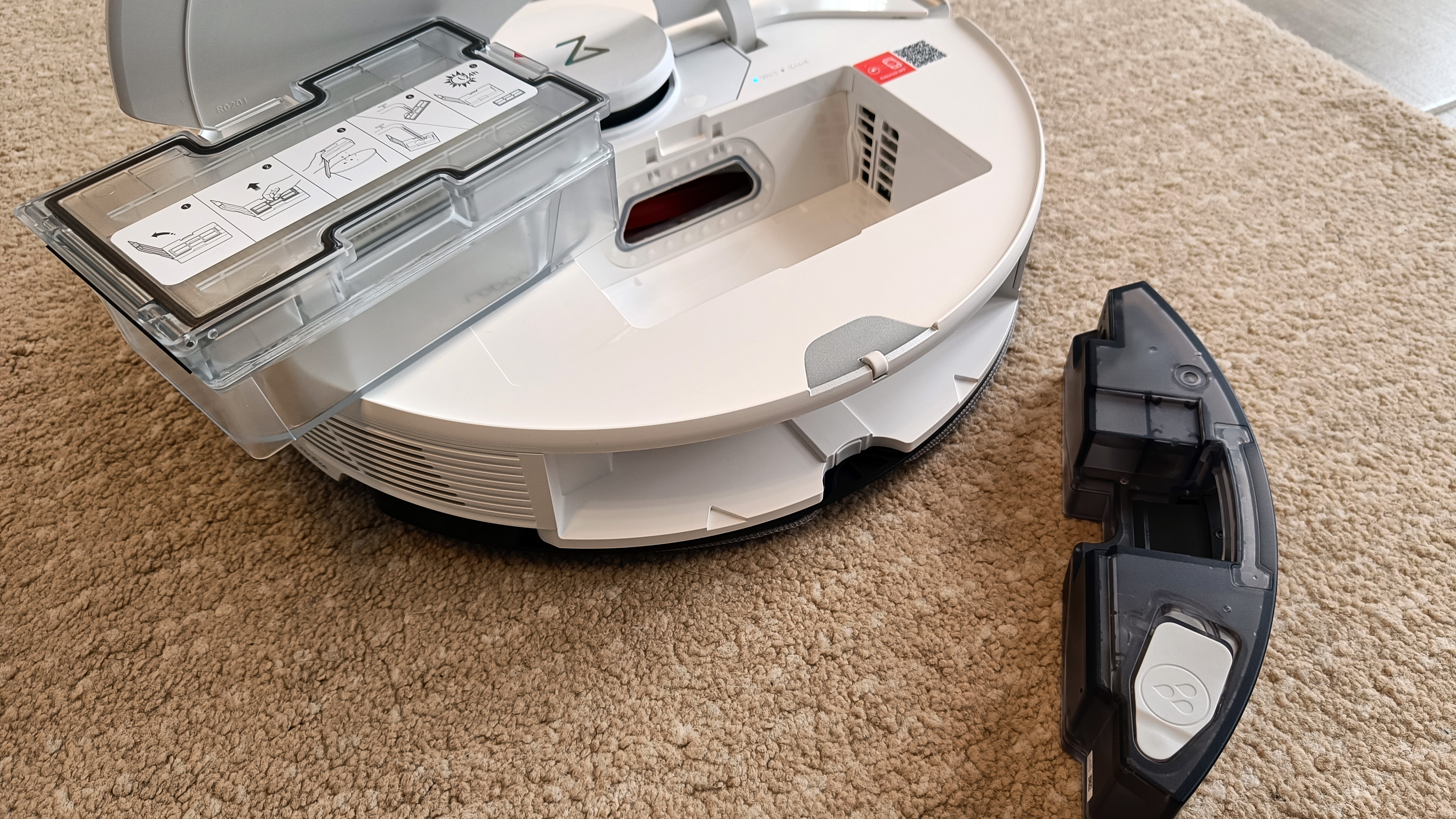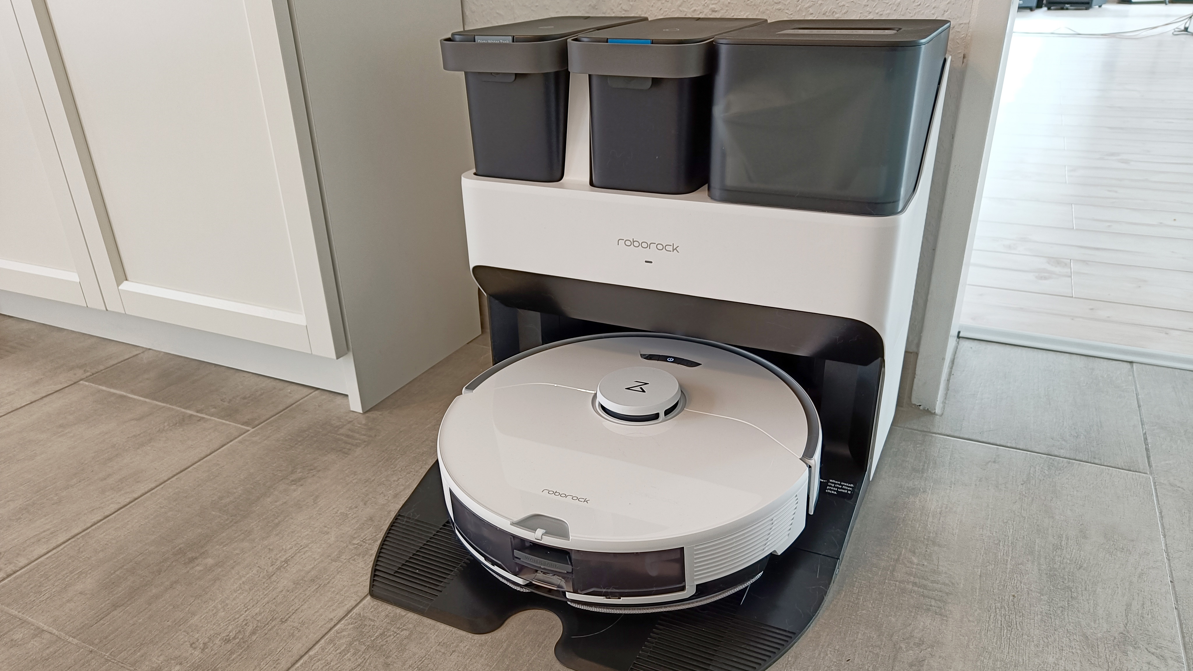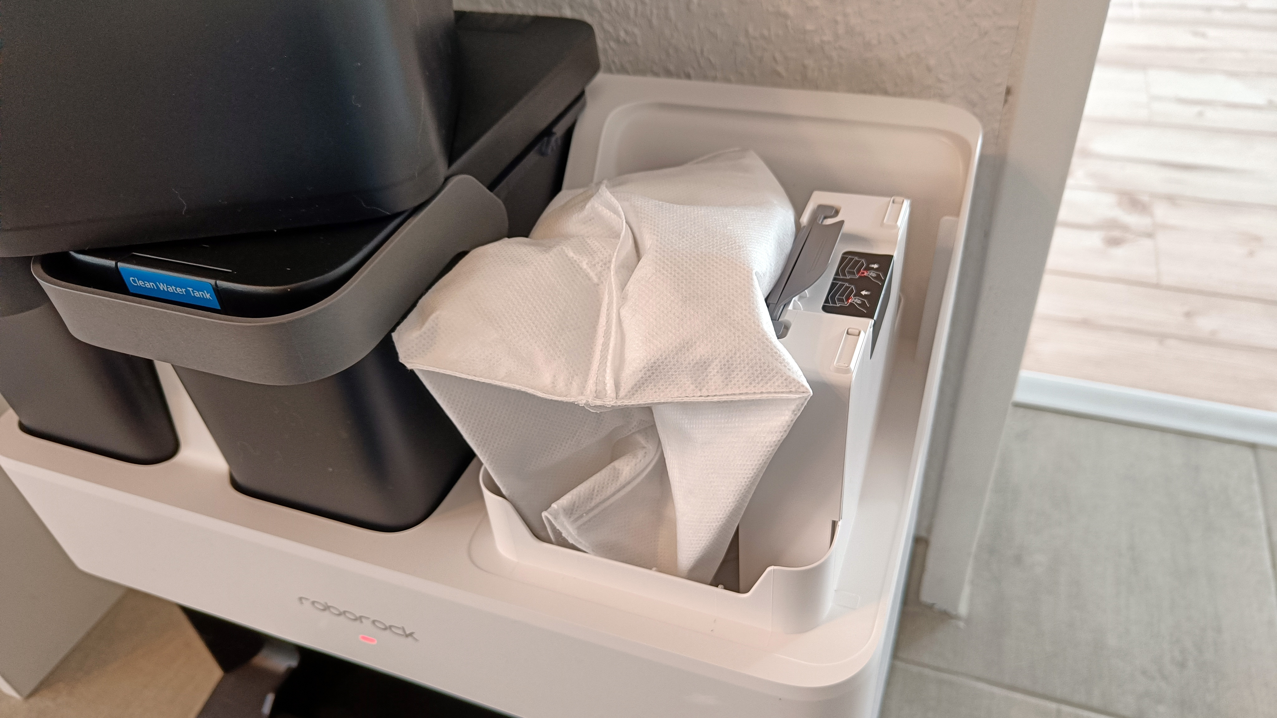 Der Lieferumfang ist bei Roborock-Modellen schnell abgehandelt: Es gibt natürlich Roboter und Reinigungsstation mit Kabelmanagement, ansonsten nur noch einen zweiten Staubbeutel für die Station. Die muss mit der Rampe, die separat im Lieferkarton liegt, vervollständigt werden – das ist alles.