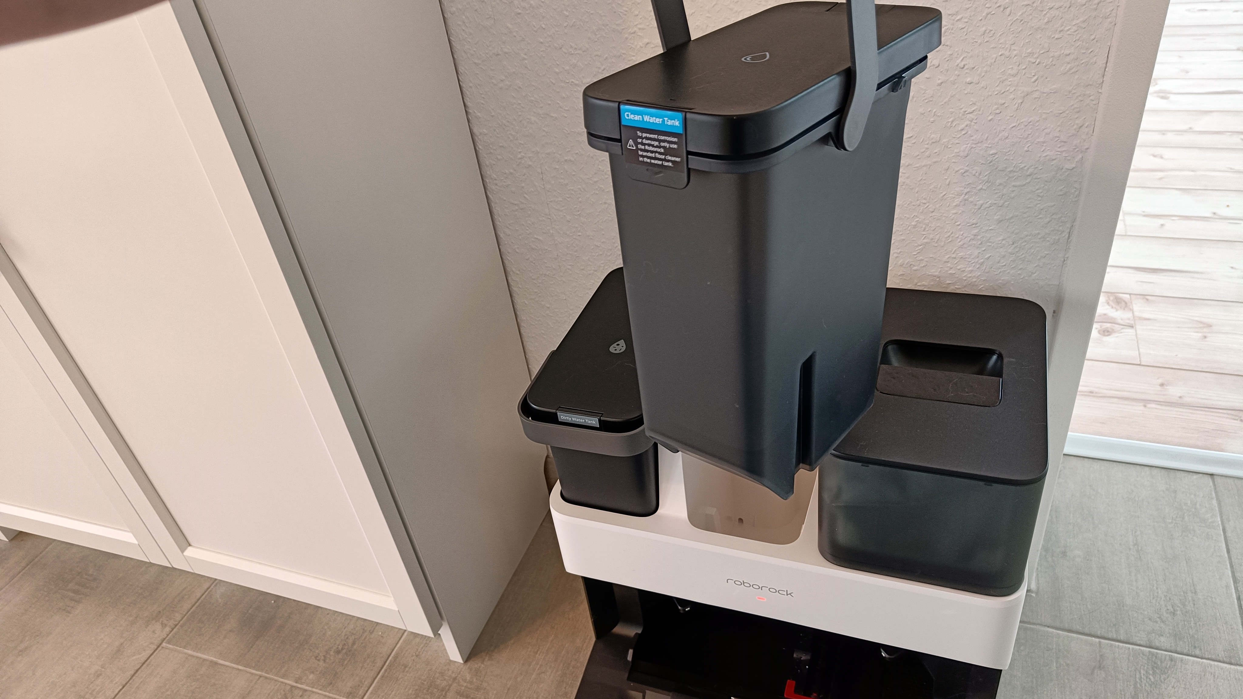 Das Schwarz-Weiß-Design setzt sich auch bei der Ultra-Station fort. Sie ist bei Form und Funktion identisch mit der beim MaxV Ultra, kommt also wieder mit den drei deutlich getrennten Behältern für Frisch- und Abwasser sowie der Absaugung für den Staubbehälter des Roboters. Hauptunterschied: das Korpus der Station ist nun Weiß. Trotz gleicher Form und Größe wirkt die neue Station dadurch etwas größer, aber auch freundlicher und nicht so düster.