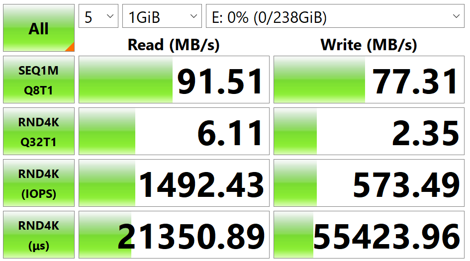 Im Crystal Disk Mark liest und schreibt die Samsung Evo Plus 1 GByte Datenpakete. Die durchschnittliche Schreibgeschwindigkeit liegt bei 88,16 MByte/s, die Lesegeschwindigkeit bei 75,11 MByte/s. Zum Vergleich: Die PNY Pro Elite (Testbericht) kommt auf 86,21 MByte/s Schreiben und 71,53 MByte/s Lesen, eine Adata Premier Pro auf 87,82 MByte/s Lesen und 71,31 MByte/s Schreiben. Somit erfüllt die Samsung-Karte die Herstellerangaben (100/90) deutlich besser und eignet sich für das schnelle Schreiben von hochauflösenden Serienbildaufnahmen, die in kurzer Zeit hohe Datenmengen produzieren.