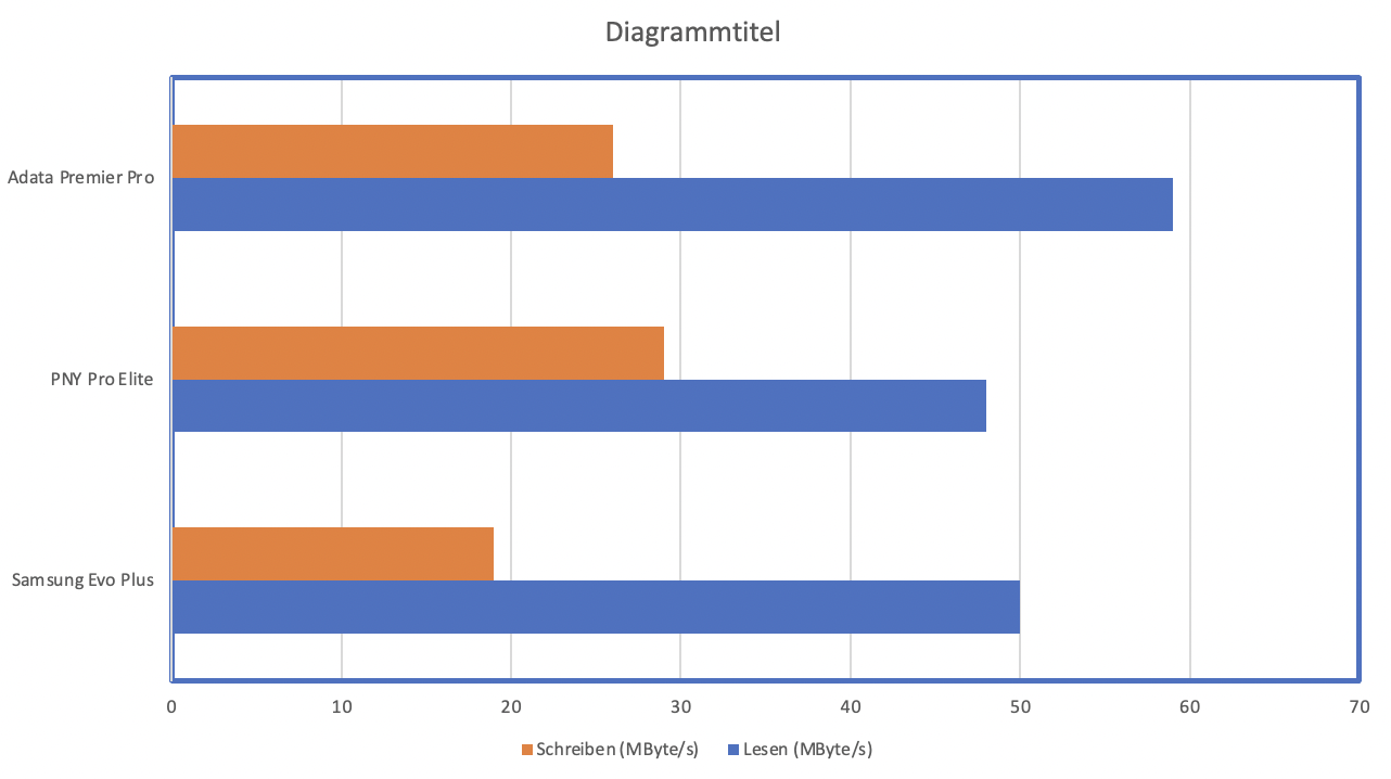 Der letzte Test ist der Disk Speed Test für Android-Smartphones. Hier prüfen wir, was die Karte als erweiterter Smartphone-Speicher leistet. Die Werte der Samsung Evo Plus stellen wir mit denen der PNY Pro Elite und Adata Premier Pro gegenüber: