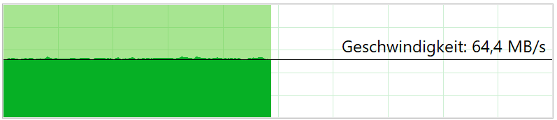 Im praxisnahen Kopiertest ziehen wir ein Video mit einer Größe von 1,37 GByte auf die Samsung Evo Plus. Das Video ist eine 5 Minuten lange 4K-Aufnahme mit 60 fps eines iPhone 12 Mini. Hier liegt die durchschnittliche Schreibgeschwindigkeit bei 67 MByte/s; das reicht aus, um das Datenpaket innerhalb von rund 20 Sekunden zu übertragen. Eine Stunde 4K-Material braucht bei dieser Geschwindigkeit entsprechend knapp 4 Minuten. Testweise haben wir zudem eine größere Datenmenge mit jeweils 50 GByte pro Durchlauf kopiert. Hier liegt die Schreibgeschwindigkeit ebenfalls bei durchschnittlich 67 MByte/s, die Übertragung dauert knapp 12 Minuten. Besonders erwähnenswert ist, dass die Samsung-Karte nahezu konstant schreibt. Selbst bei 50-GByte-Paketen schwankt der Wert maximal zwischen 65 und 68 MByte/s. Das schaffen die bisher getesteten Wettbewerber nicht.