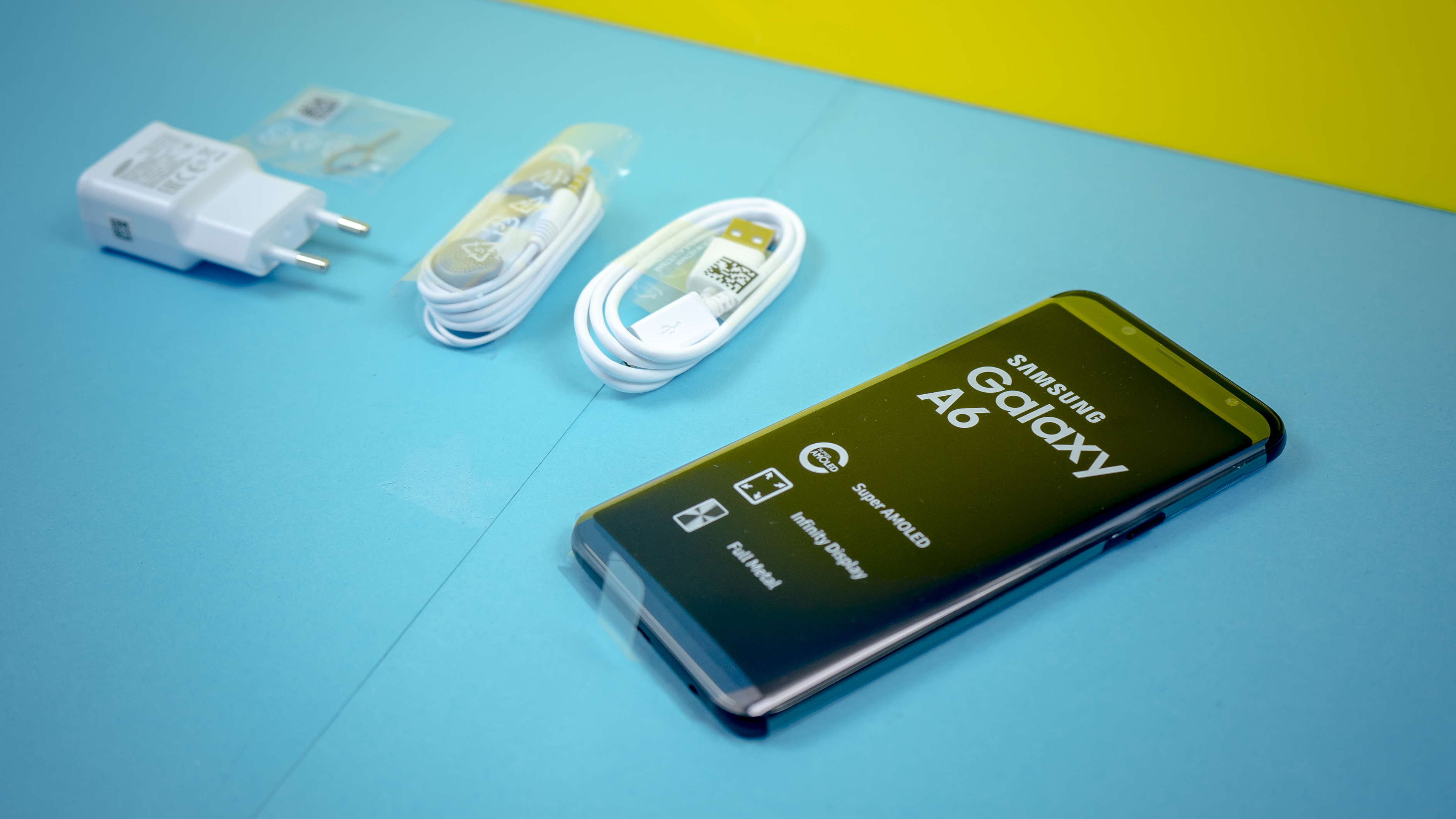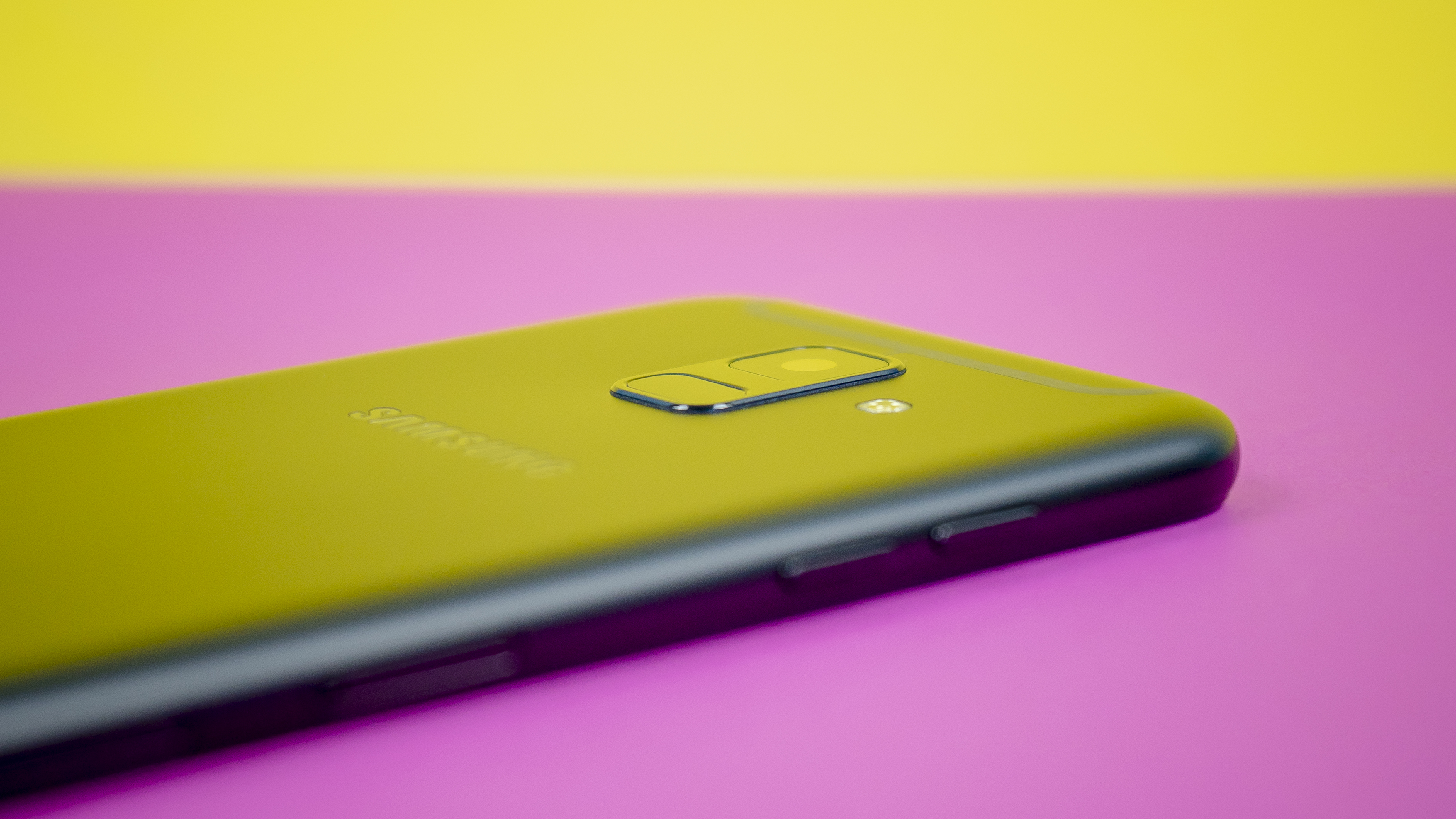 Genau wie sein großer Bruder Galaxy A6+, ist auch das kleinere Modell hauptsächlich aus einem Metallgehäuse gefertigt. Die vordere Seite besteht aus widerstandsfähigem Glas. Der Korpus lässt sich nicht verbiegen und wirkt solide. Auch andere Dinge stimmen, wie die seitlich angebrachten Tasten mit ihrem festen Druckpunkt oder die insgesamt komfortable Haptik.