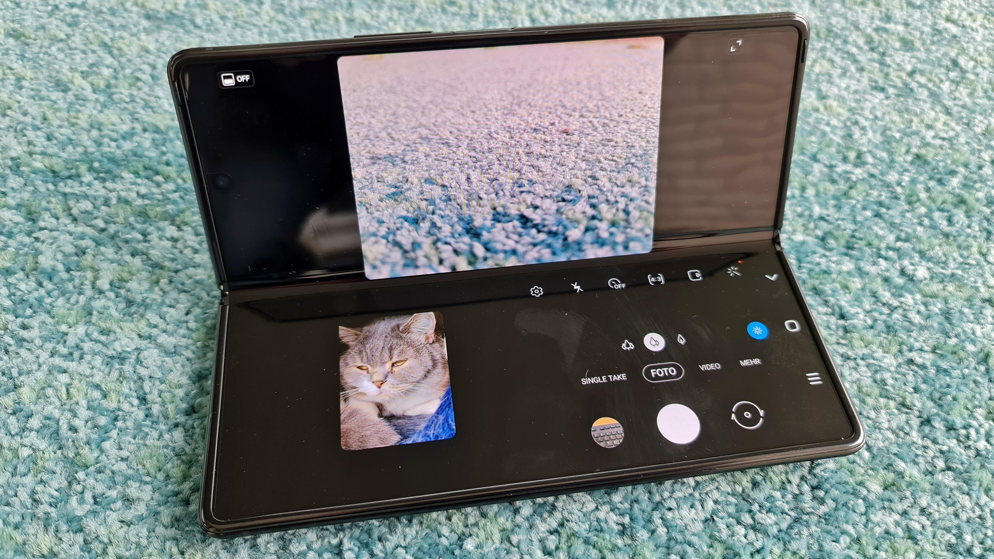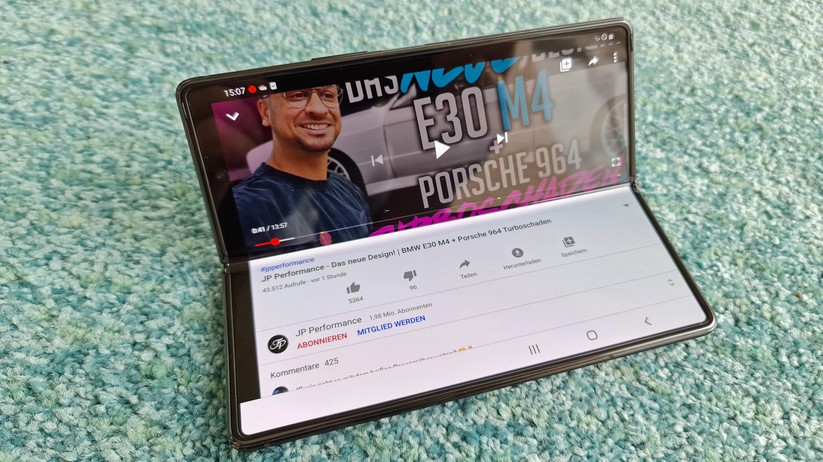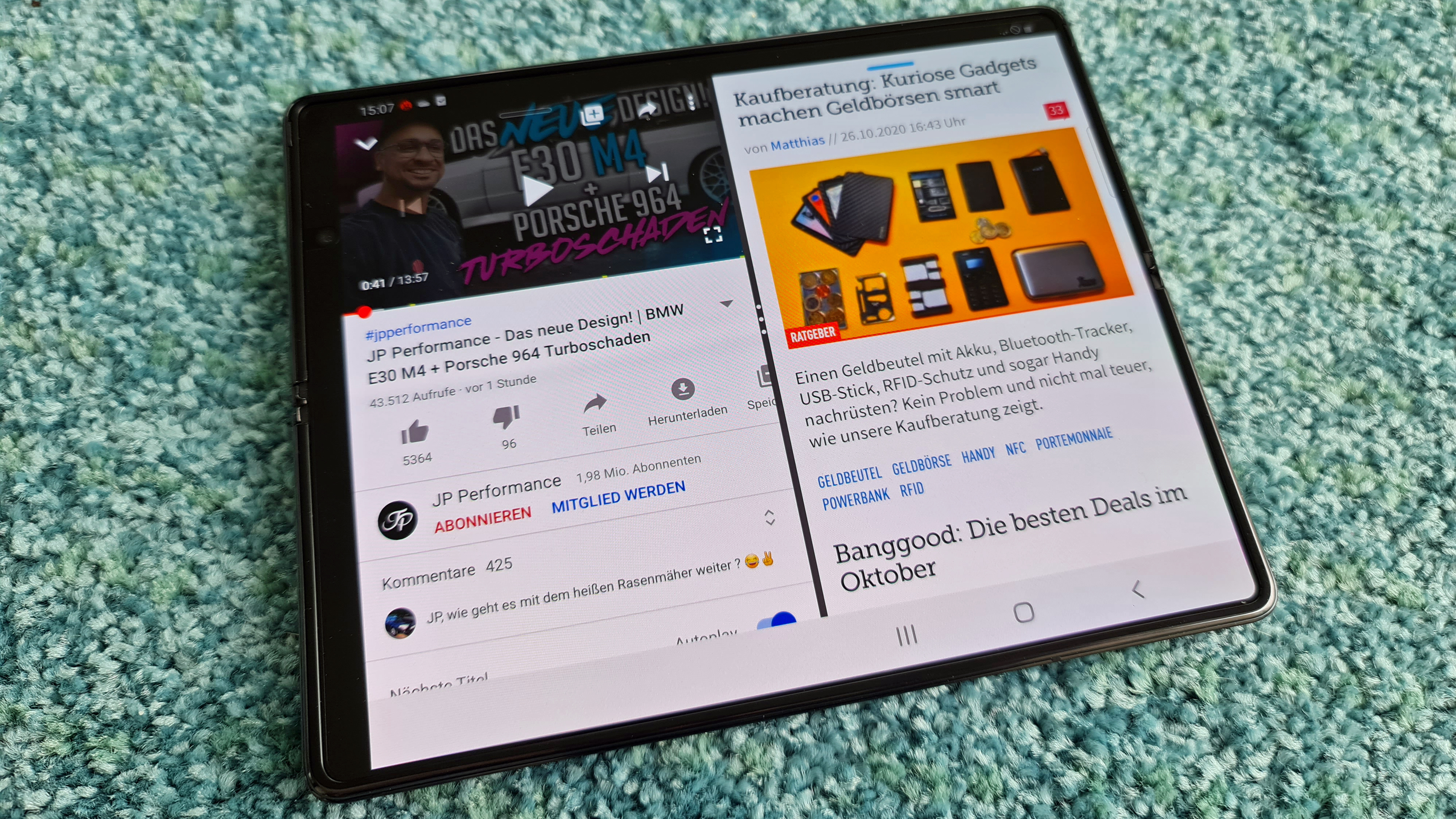 Zusätzlich zur neuen Hardware spendiert Samsung dem Fold 2 auch tolle, an das große und faltbare Display angepasste, Software. Die Hardware schafft wie angedeutet auch intensives Multitasking spielend, die Nutzeroberfläche erlaubt dafür die gleichzeitige Anzeige mehrerer Apps, die ganz einfach per Drag&Drop verschoben werden dürfen. Zusätzlich reagiert die Software darauf, wenn das Display in beliebigem Winkel geöffnet ist – etwa, um es wie einen kleinen Laptop vor sich auf den Tisch zu stellen. Dann wechseln Programme wie Youtube oder die Kamera-App in eine zweigeteilte Ansicht, die zusätzliche Optionen bietet. In den genannten Beispielen können Nutzer dann etwa das gewünschte Video schauen und gleichzeitig nach weiteren Videos suchen oder in den Kommentaren blättern. In der Kamera-App wird oben weiterhin der Sucher gezeigt, unten sieht man die letzten Aufnahmen in größerer Ansicht – praktisch.