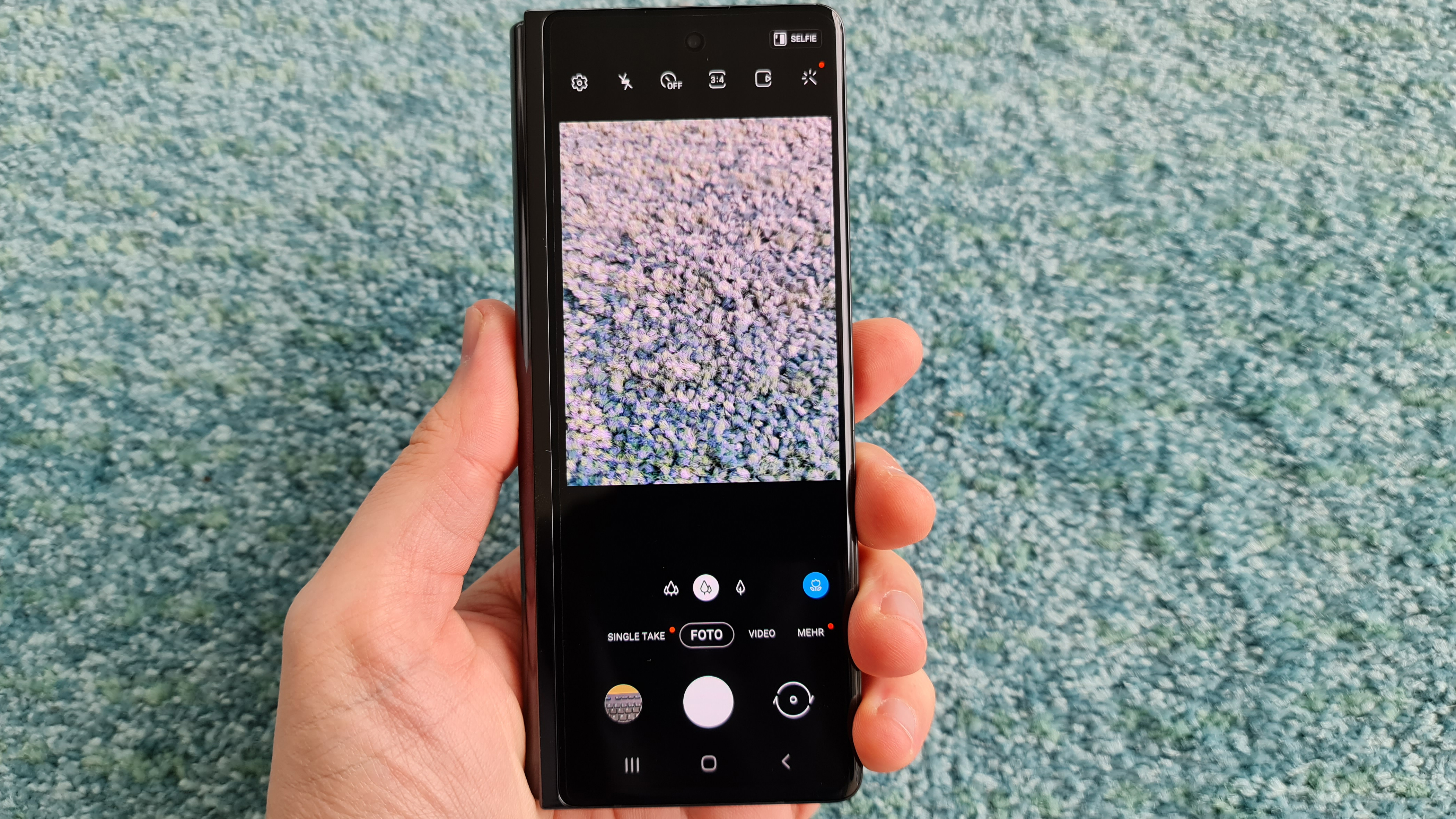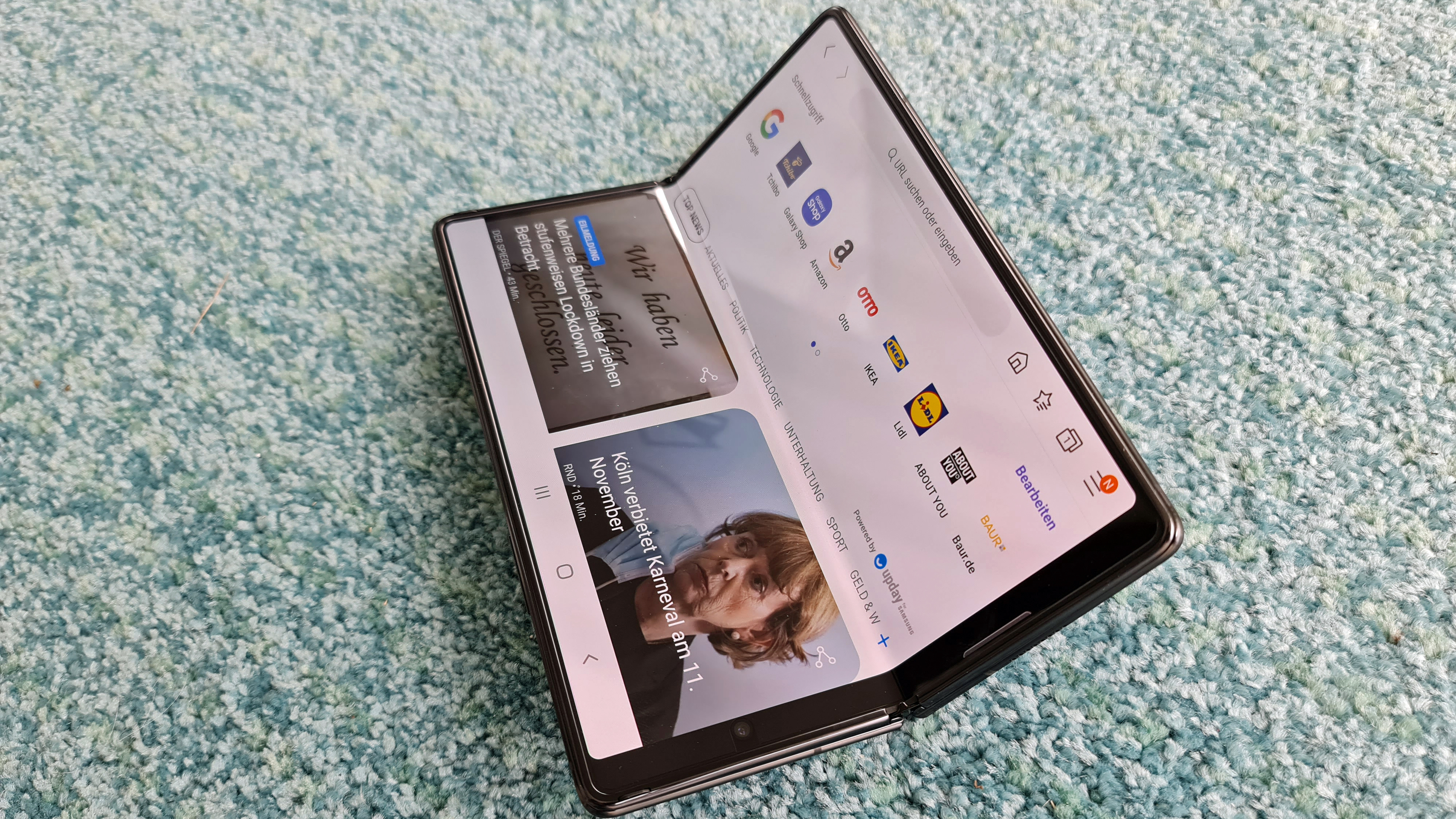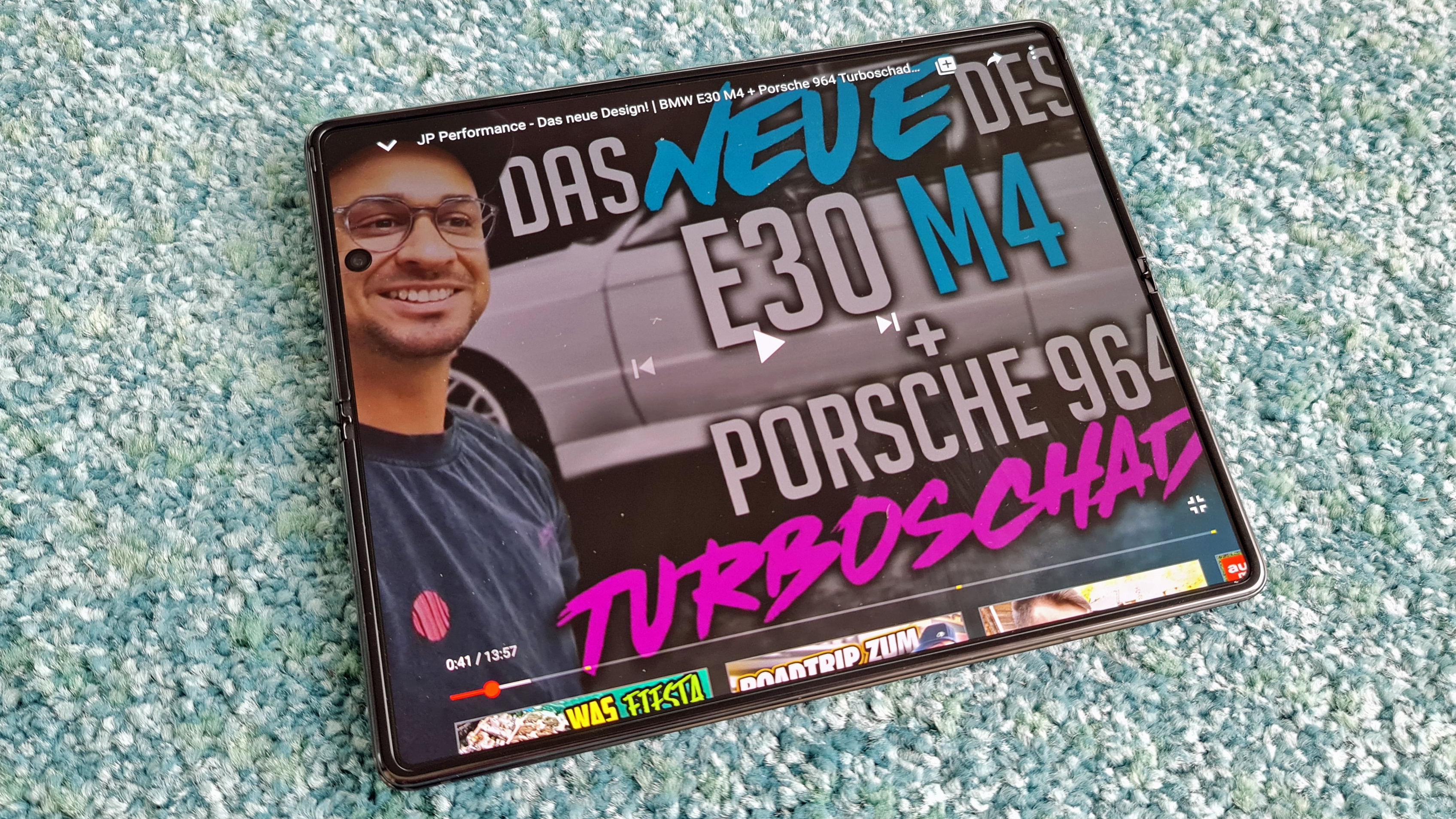 Zusätzlich zur neuen Hardware spendiert Samsung dem Fold 2 auch tolle, an das große und faltbare Display angepasste, Software. Die Hardware schafft wie angedeutet auch intensives Multitasking spielend, die Nutzeroberfläche erlaubt dafür die gleichzeitige Anzeige mehrerer Apps, die ganz einfach per Drag&Drop verschoben werden dürfen. Zusätzlich reagiert die Software darauf, wenn das Display in beliebigem Winkel geöffnet ist – etwa, um es wie einen kleinen Laptop vor sich auf den Tisch zu stellen. Dann wechseln Programme wie Youtube oder die Kamera-App in eine zweigeteilte Ansicht, die zusätzliche Optionen bietet. In den genannten Beispielen können Nutzer dann etwa das gewünschte Video schauen und gleichzeitig nach weiteren Videos suchen oder in den Kommentaren blättern. In der Kamera-App wird oben weiterhin der Sucher gezeigt, unten sieht man die letzten Aufnahmen in größerer Ansicht – praktisch.