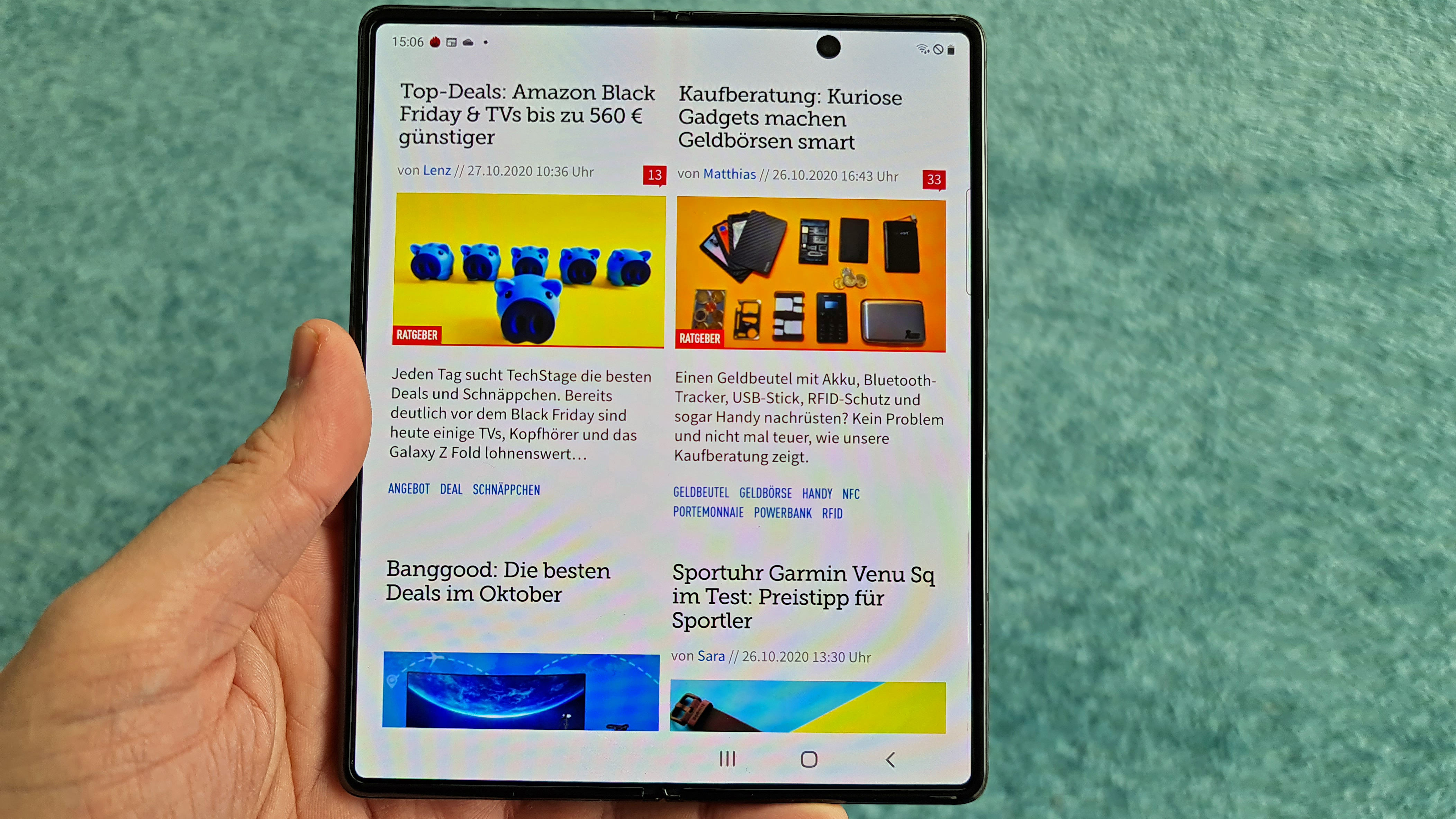 Besonders beeindruckend ist das aufgeklappte Innen-Display, das neben den oben beschrieben Qualitäten außerdem mit der schieren Größe punktet. Bei sehr ähnlichen Gehäusemaßen im Vergleich zum Vorgänger ist die Display-Diagonale von 7,3 auf 7,6 Zoll gewachsen, den größten Fortschritt macht Samsung dabei bei der Platzierung der Frontkamera. Während der Hersteller die beim ersten Galaxy Fold (Testbericht) noch in einer ausladenden Riesen-Notch untergebracht hat, die den Gesamteindruck vor allem bei formatfüllenden Inhalten wie Videos gestört hat, setzt Samsung beim neuen Modell auf eine zeitgemäße Punchhole-Notch. Das wirkt nicht nur viel moderner, sondern stört auch bei der Nutzung wesentlich weniger. Außerdem ist der Screen dadurch jetzt komplett rechteckig ohne Einbuchtung.