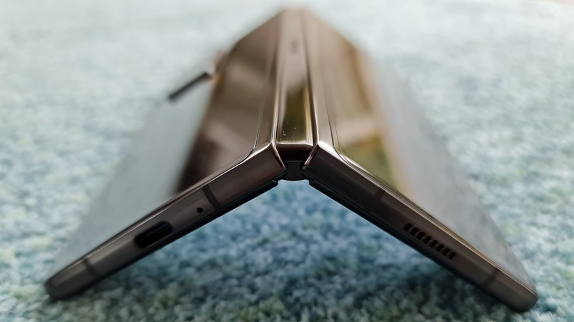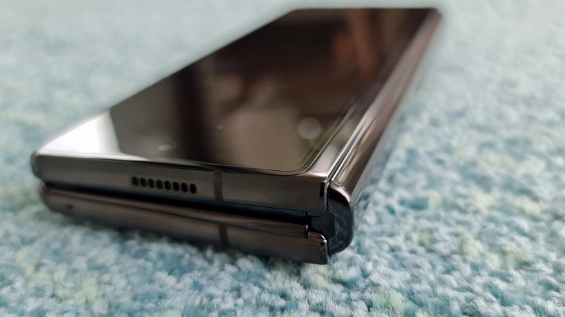 Zwar ist die Bautiefe von 17,1 Millimeter beim Samsung Galaxy Fold 5G (Testbericht) auf 16,8 Millimeter geschrumpft, allerdings ist dieser Fortschritt eher zu vernachlässigen. An der Tatsache, dass das Gerät zusammengefaltet immer noch ziemlich dick ist und damit in jeder Hosentasche auffällt, ändert das nichts. Ebenfalls nicht so schön, auch wenn gerade bei teuren Topsmartphones immer mehr verbreitet: Die Kameraeinheit des Fold 2 steht wie bei den Modellen der S- und Note-Reihe deutlich aus dem ansonsten edlen Glasgehäuse (Invictus-Glas aka Gorilla Glas 6) hervor. Das auffällige Scharnier, mit dessen Hilfe das Fold 2 auf- und zugeklappt wird, sieht zwar auf den ersten Blick wie beim Vorgänger aus, tatsächlich hat Samsung hier aber stark Hand angelegt. Auch wenn an der grundsätzlichen Funktionsweise keine Änderungen zu sehen sind (unter anderem schließen die beiden Display-Innenseiten zum Schutz gegen Zerkratzen immer noch nicht plan und durch die Form des Scharniers erinnert das Smartphone insgesamt nach wie vor an eine Mundharmonika) gibt es sehr wohl Neuerungen. So lässt sich das Fold 2 nun in jedem beliebigen Winkel aufklappen, um es etwa wie einen kleinen Laptop vor sich auf den Tisch zu stellen. Dank angepasster Software wird das erkannt und entsprechend ausgenutzt – mehr dazu im Kapitel Ausstattung.