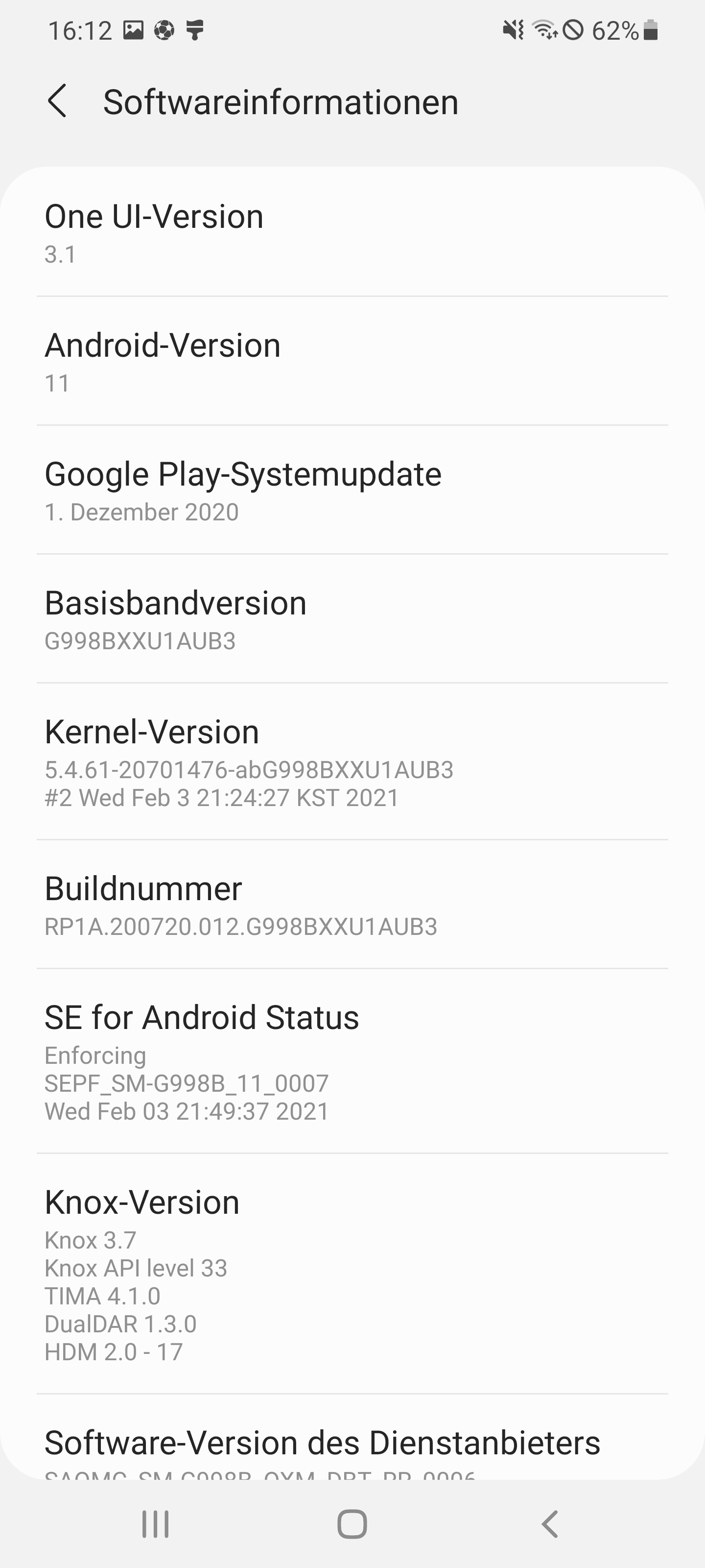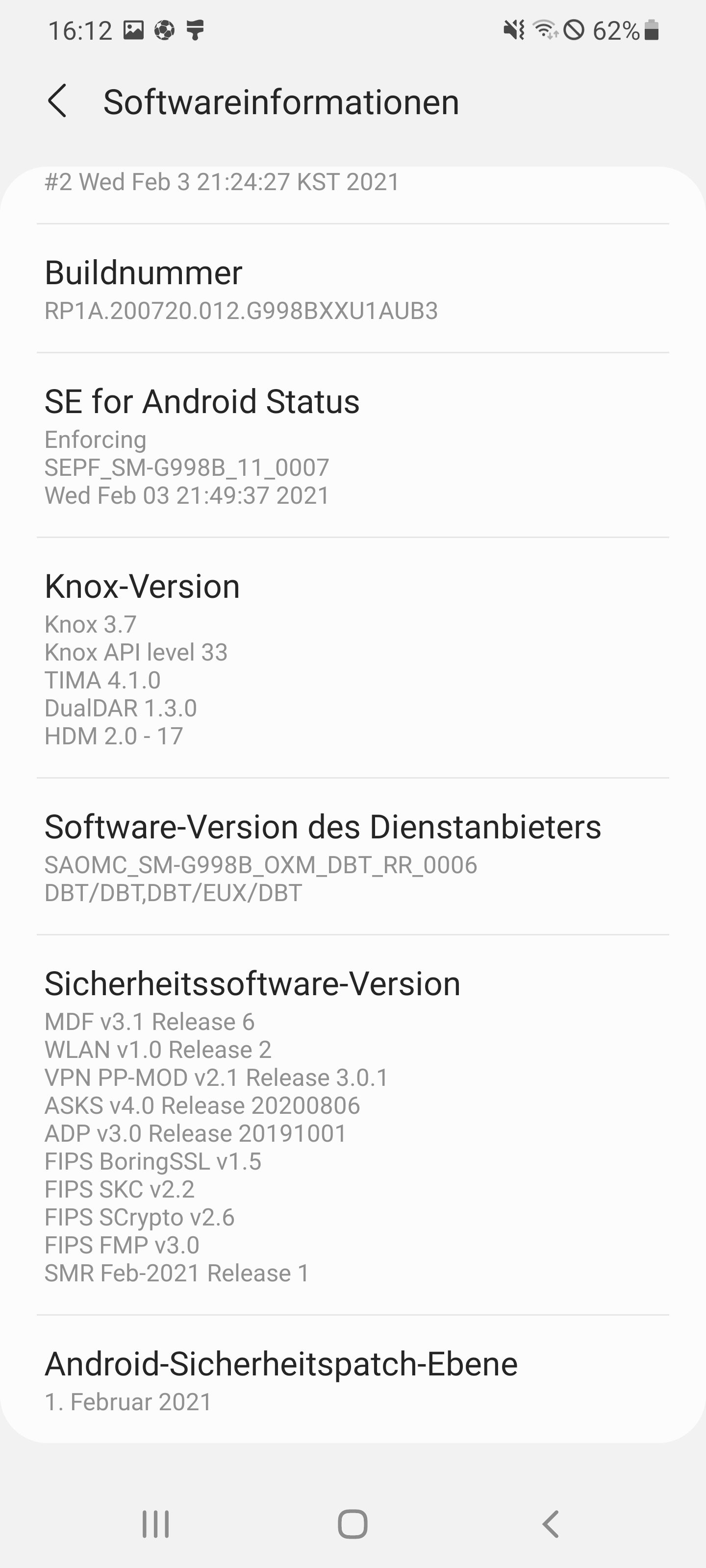 Samsung setzt bei der Software auf Android 11 mit One UI 3.0. Dabei bewegt sich der Hersteller immer mehr in Richtung Stock-Android. Zwar gibt es weiterhin eine Menge an Zusatz-Software (Bloatware) durch diverse Office-Anwendungen und Samsung-eigene-Apps, die sich teilweise auch nicht komplett deinstallieren lassen. Den Versuch, seinen eigenen Sprachassistenten Bixby und damit verbundene Newsfeeds und andere Zusatzdienste auch europäischen Käufern aufzuzwingen, gibt es aber auf dem S21 Ultra kaum noch. Als Newsfeed kommt jetzt sogar voreingestellt Google News zum Einsatz. Außerdem erreichte uns nicht einmal eine Woche nach Monatsbeginn ein Update, das neben Leistungs- und Qualitätsverbesserungen der Kamera auch den Sicherheits-Patch von Februar brachte – sehr löblich und ein Hinweis darauf, dass Samsung sein 3-Jahres-Versprechen für Updates ernst meint und weiterhin schnell liefern will.