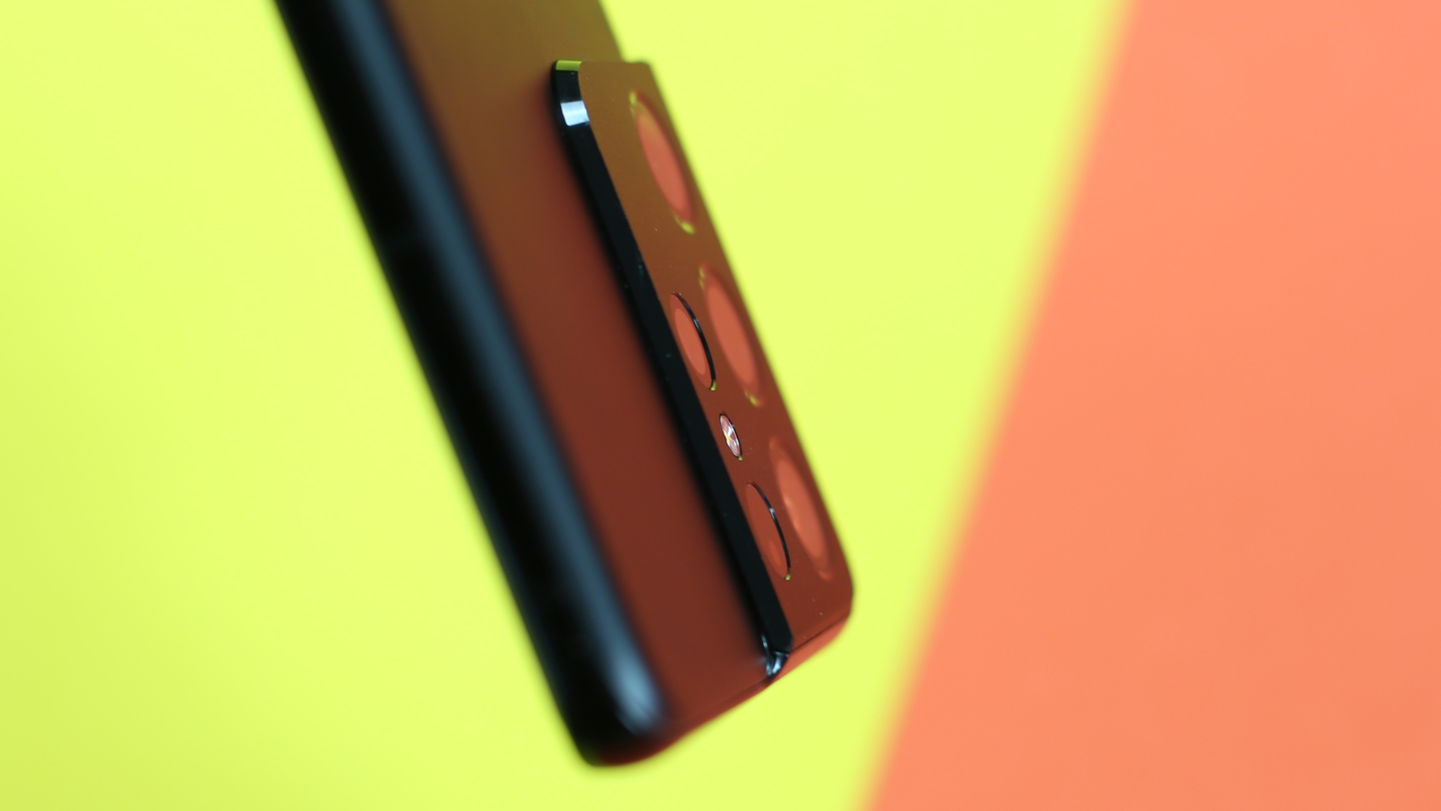 Neu erfunden hat Samsung das Design-Rad beim Galaxy S21 Ultra nicht. Das ist aber auch nicht nötig. Denn mit den bewährten Zutaten Curved-Display, Glas auf Front und Rücken sowie Metall für den Rahmen zaubert der Hersteller wieder ein Smartphone, dass sowohl beim Aussehen, als auch bei Verarbeitungsqualität und Materialanmutung ganz weit oben mitspielt. Im Vergleich zum Vorgänger setzt Samsung nun auf eine matte Rückseite und eine überarbeitete Kamerapartie. Sie wird nun nahtlos vom Rahmen im oberen linken Eck eingefasst, dadurch wirkt das Modul nicht mehr so aufgesetzt wie beim Samsung Galaxy S20 Ultra (Testbericht) , obwohl es erneut stark aus dem Gehäuse hervorsteht. Aus technophiler Sicht wirkt die Kameraeinheit beeindruckend: Die Linsen wirken riesig und glitzern geheimnisvoll teils bläulich, teils rötlich. Da auch die Kameraeinfassung bei unserem Testmodell schwarz-matt gehalten ist, verstärkt sich der ansonsten unauffällige, aber hochwertige Eindruck noch mehr.