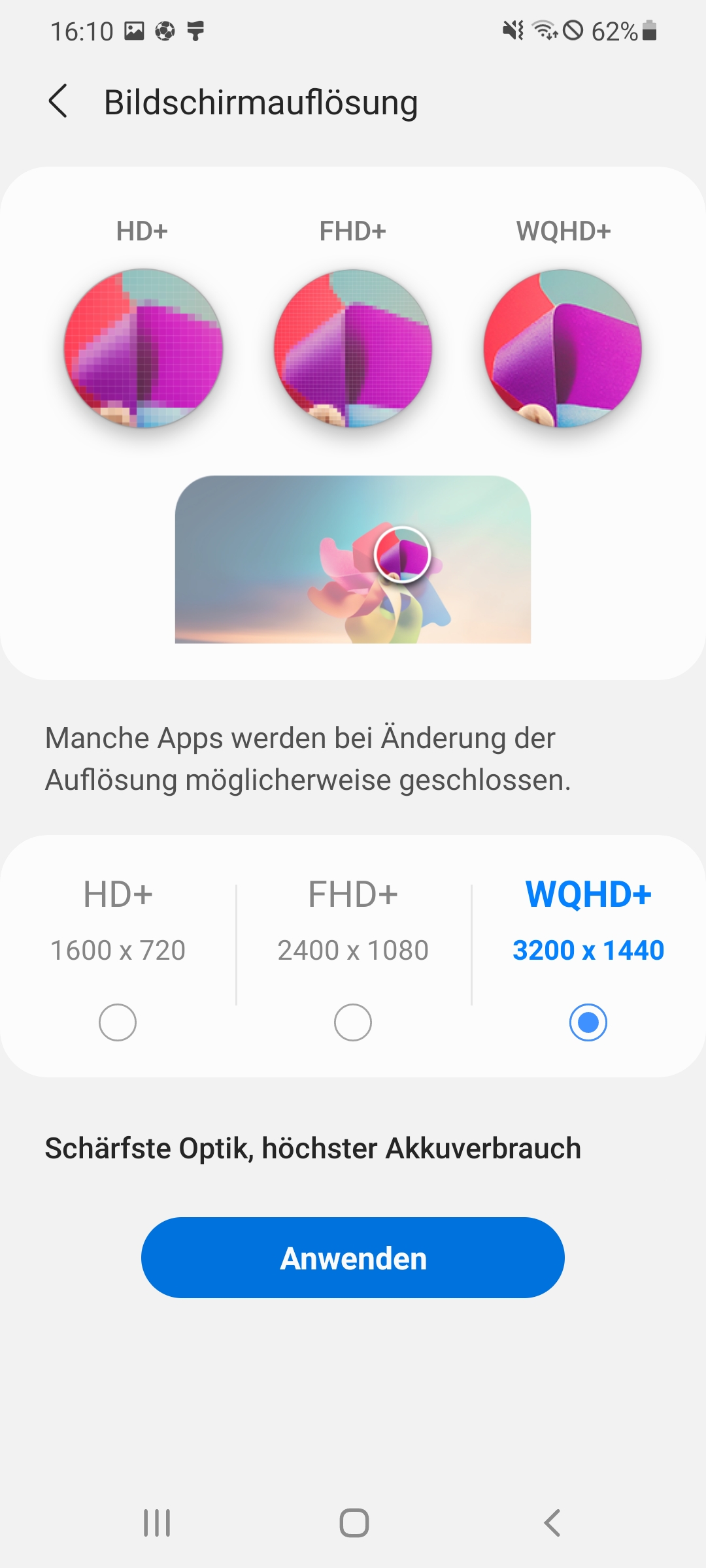 Das Display des Samsung Galaxy S21 Ultra misst stolze 6,8 Zoll (ca. 17 Zentimeter) – der Unterschied zum S21+ beträgt damit allerdings gerade einmal 0,1 Zoll. Dafür ist die Auflösung höher, denn während dort nur FHD+ zum Einsatz kommt, liegt das Ultra bei WQHD, also 3200 × 1440 Pixel. 120 Hz schafft es außerdem, im Gegensatz zum S20 Ultra aus 2020 auch bei voller Auflösung. Die adaptive Verteilung bewegt sich mit 10 bis 120 Hz dabei in einem weiteren Spektrum als beim S21+ mit 60 bis 120 Hz. Das sorgt etwa bei Bildbetrachtung für weniger Stromverbrauch, im Alltag bemerkt man vom Wechsel der Bildwiederholungsfrequenz nichts.