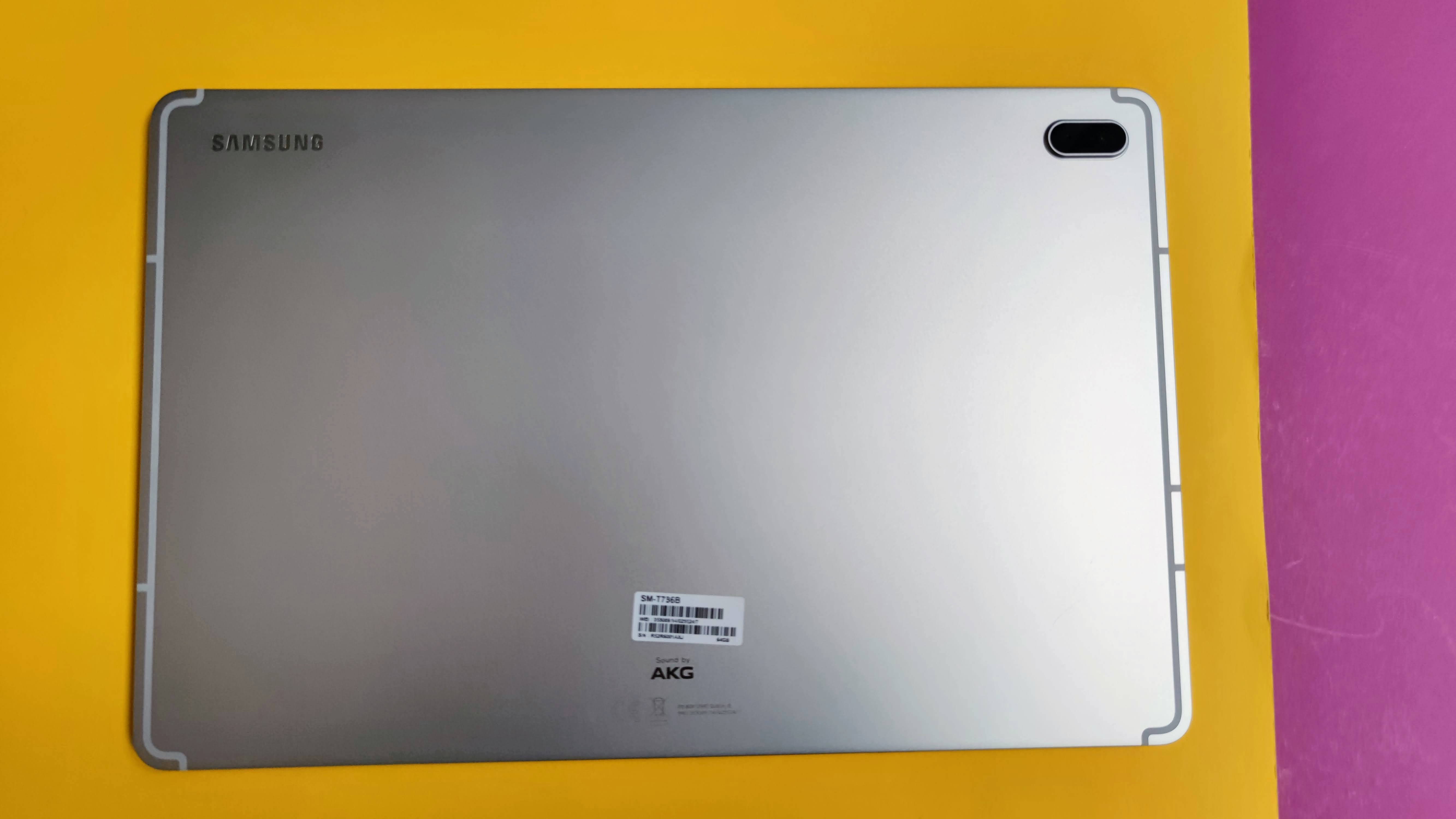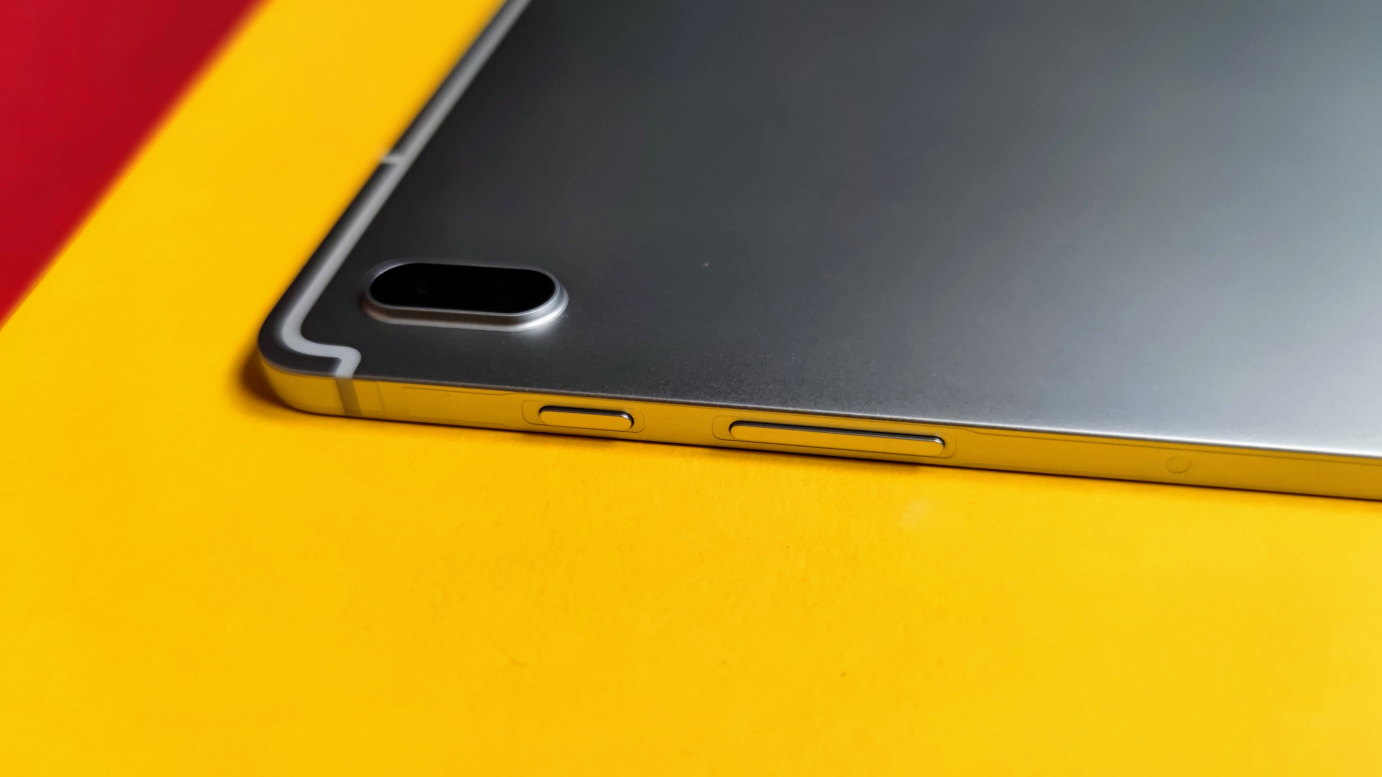 Die Verarbeitung ist hochwertig, wie man es von Samsung gewohnt ist. Die komplette Rückseite besteht aus Aluminium. Zu den Seiten hin sind als Designmerkmal perfekt in das Metall integrierten Antennenstreifen erkennbar. Das Gehäuse weist nahezu keine Spaltmaße auf. Die Lautstärkewippe und der Power-Button bieten einen festen Druckpunkt. Beide Knöpfe befinden sich auf einer der langen Seiten. Hält man das Tablet im Querformat, kommt man so nicht ganz so gut an den Schalter. Eine elegantere Lösung bietet hier was das Lenovo Tab P11 Plus (Testbericht): Der An/Aus-Button befindet sich auf der kurzen Seite, ist damit im Querformat schneller erreichbar.