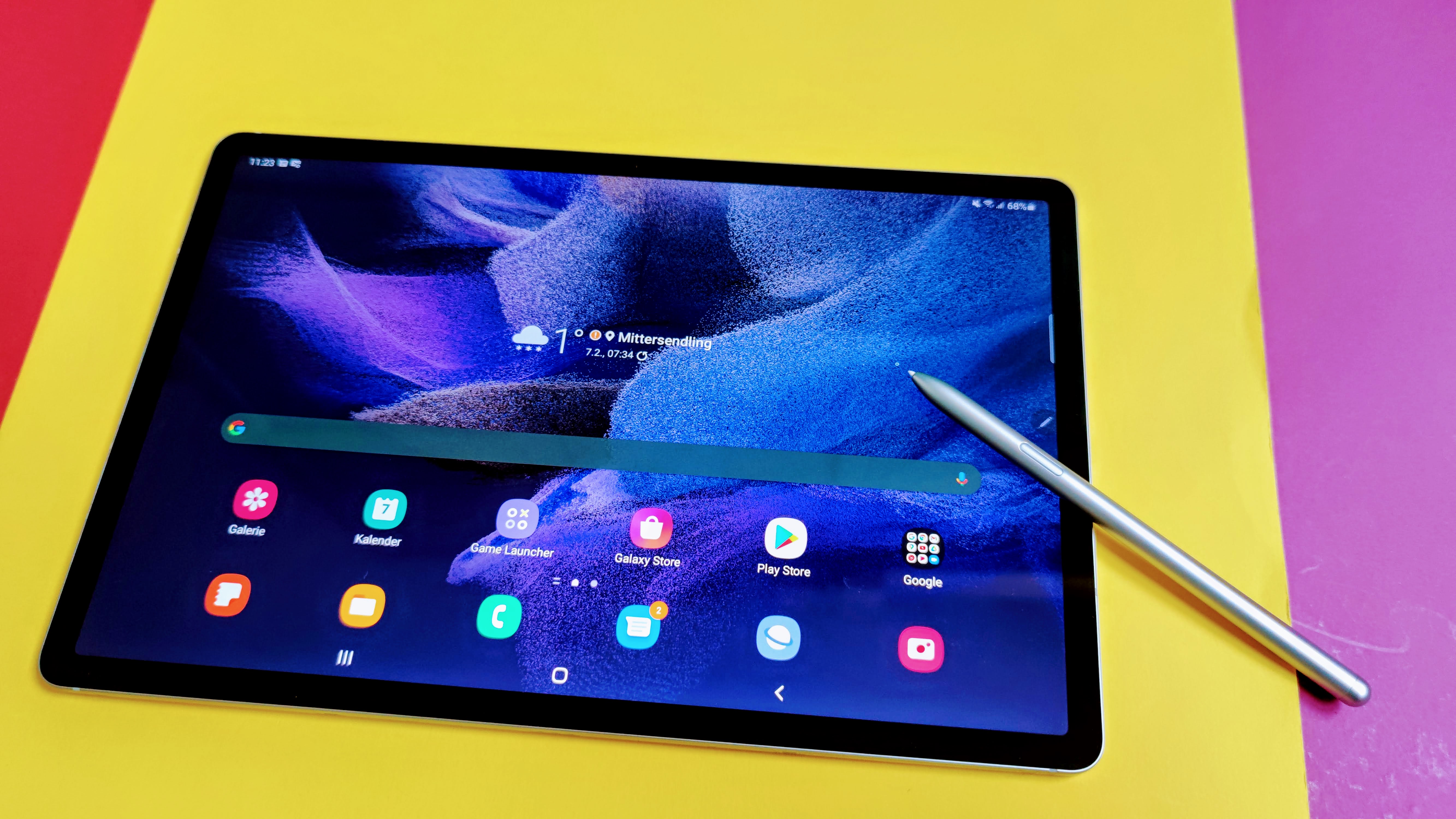Der Bedienstift S-Pen gehört zum Lieferumfang des Tablets. Einen Fingerabdrucksensor vermissen wir jedoch schmerzlich, zumal die Gesichtserkennung nicht immer auf Anhieb klappt. Besser sieht die Ausstattung bei den Ordnungsdiensten aus. Neben GPS bietet das Gerät auch Glonass, Beidou und Galileo. Das ist bei Tablets nicht selbstverständlich. Einen Klinkenanschluss gibt es nicht. Der USB-C-Port unterstützt USB 3.1 und Displayport. Ein Dockinganschluss für eine Tastatur zum Anstecken wie das vom Galaxy Tab S7+ bekannte Book Cover Keyboard Slim ist vorhanden. Zudem bietet das Tablet Lautsprecher von AKG mit Dolby Atmos, was für einen satten und räumlichen Klang sorgt. Das ist ideal für Filme oder Serien.