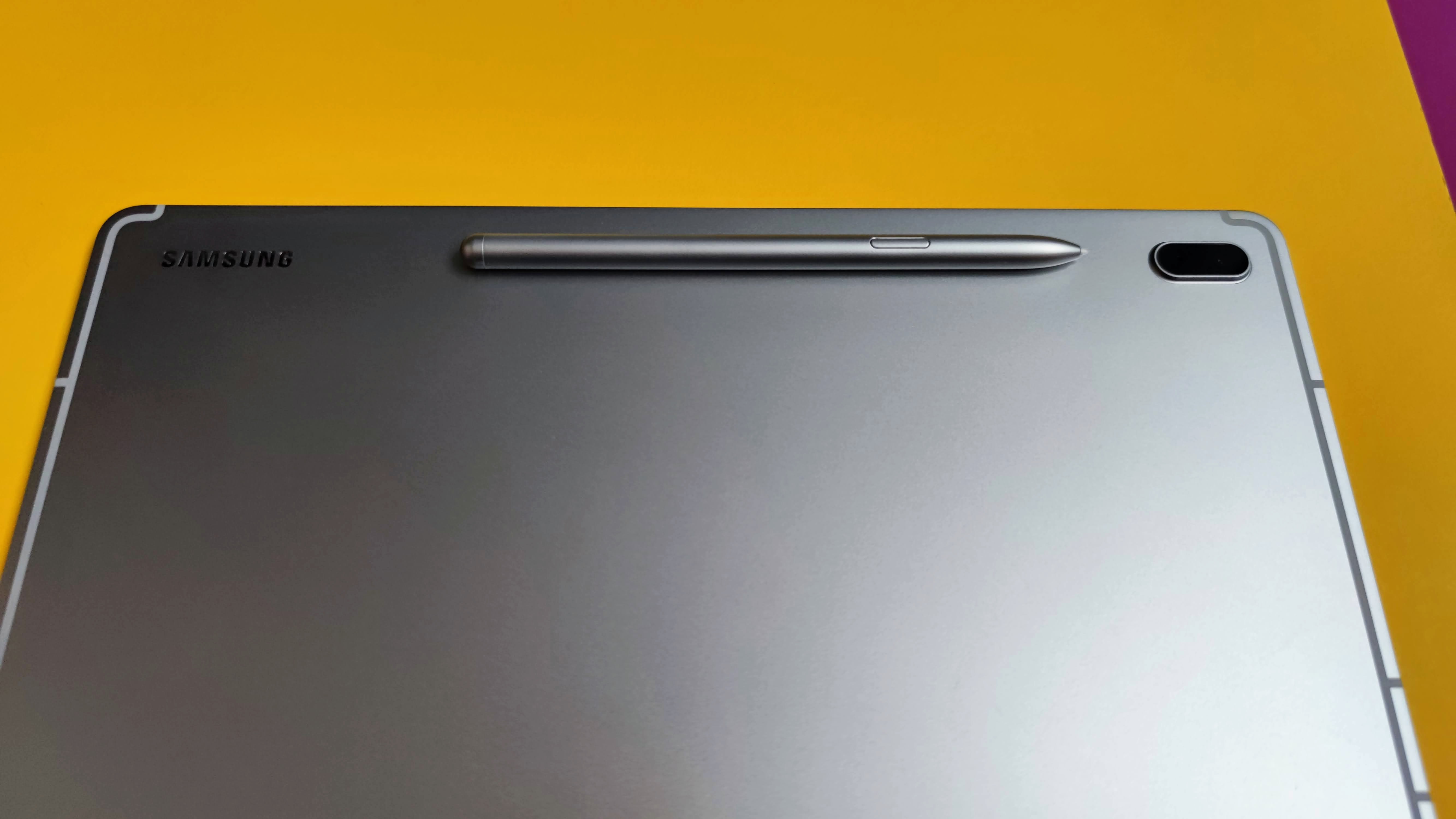 Die Kameraeinheit auf der Hinterseite ragt nur etwas mehr als zwei Millimeter heraus. Aufgrund der üppigen Abmessungen wackelt das Gerät so gut wie gar nicht, wenn es auf der Rückseite liegt. Weniger gelungen ist die Befestigung des beigelegten S-Pen. Wie schon beim Galaxy Tab S7 haftet der Stylus nur magnetisch auf der Rückseite zwischen dem Samsung-Schriftzug und der Kamera. Der Magnet hält den Stift zwar recht fest, dennoch geht dieser schnell verloren, wenn man das Tablet viel bewegt. Hier wäre eine feste Befestigung oder ähnliches schön gewesen. Einen zertifizierten Schutz vor Staub oder Wasser bietet das Gehäuse nicht.