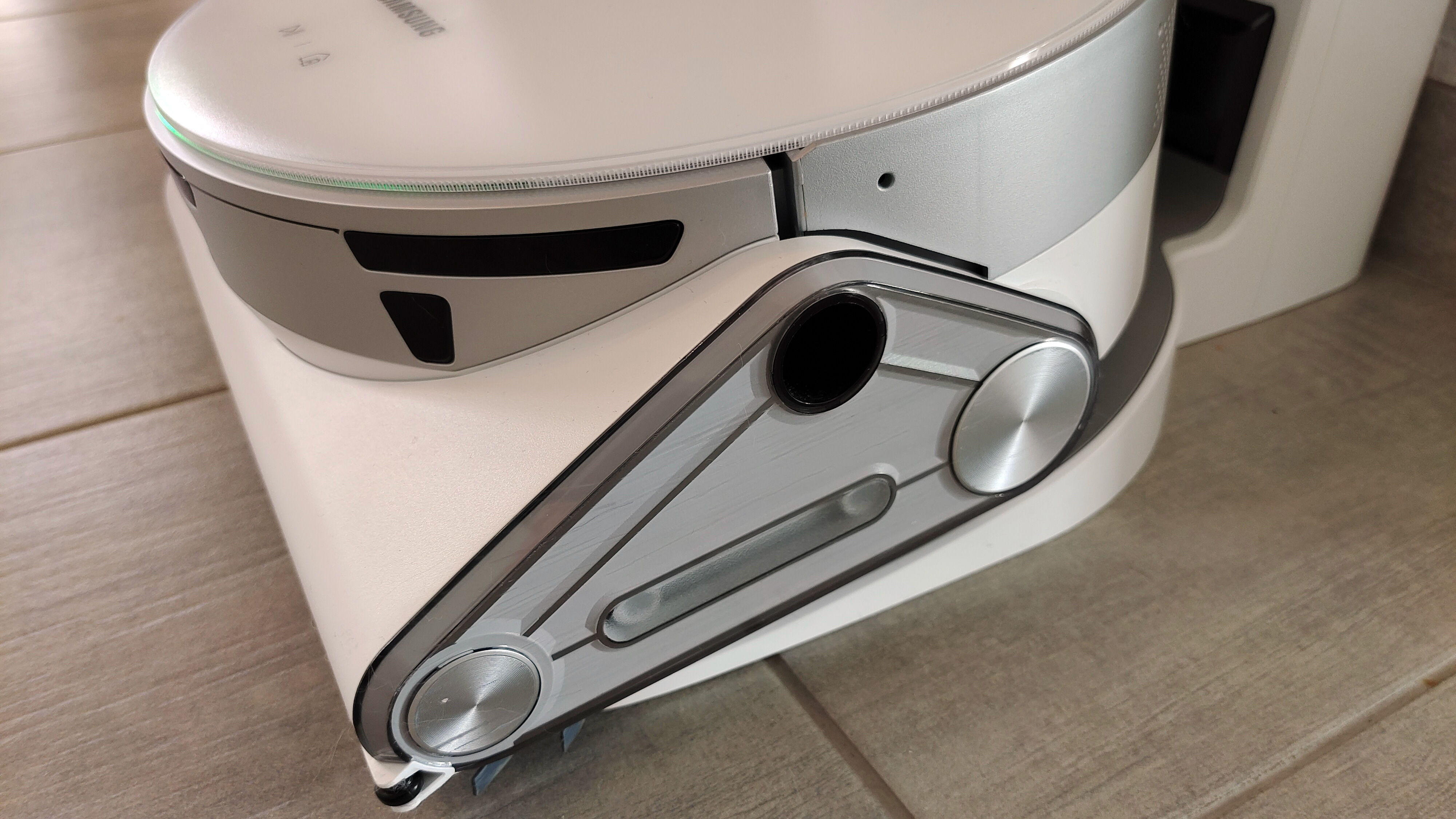 Um nicht mit der kantigen Front beim Navigieren hängenzubleiben, installiert Samsung an den vorderen Kanten kleine Rädchen. So schrammt der Roboter nicht an der Wand entlang, sondern rollt sich ab. Auffällig sind auch die zusätzlichen hinteren Sensoren die neben den vorderen Sensoren und der Kamera für verbesserte Orientierung sorgen. Das bietet sonst so gut wie kein anderer Saugroboter. Außerdem scheint der weiße Roboter gar nicht per Laser zu navigieren, zumindest ist in der Absaugstation und generell abseits der Arbeit kein Laser-Turm zu sehen. Tatsächlich fährt dieser zu Beginn einer Tour erst langsam und elegant aus – einzigartig!