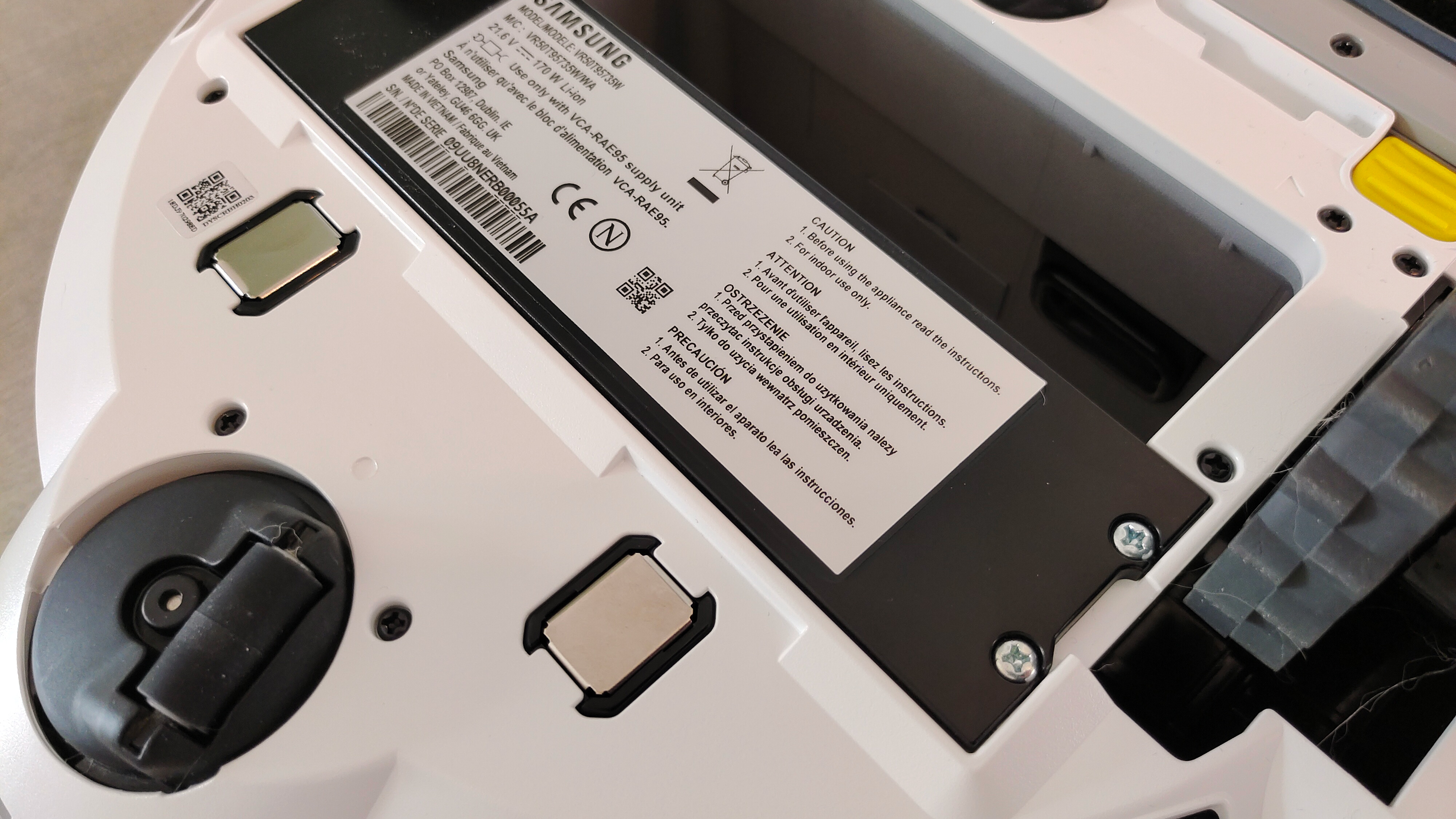 Zum restlichen, eher klotzigen Design, passt dieser elegante Vorgang nicht unbedingt. Samsung verwendet zwar hochwertig wirkenden, weißen Kunststoff mit silbernen Applikationen, insgesamt wirkt der Roboter aber eher wie ein Schwebepanzer oder ein Droide aus Star Wars, als dezent. Ein Blick unter den Roboter sorgt außerdem für Irritation: Statt Ketten kommen hier ganz normale Laufräder zum Einsatz. Im Gegensatz zu den meisten Konkurrenzprodukten gibt es nicht nur ein, sondern gleich zwei Stützräder.