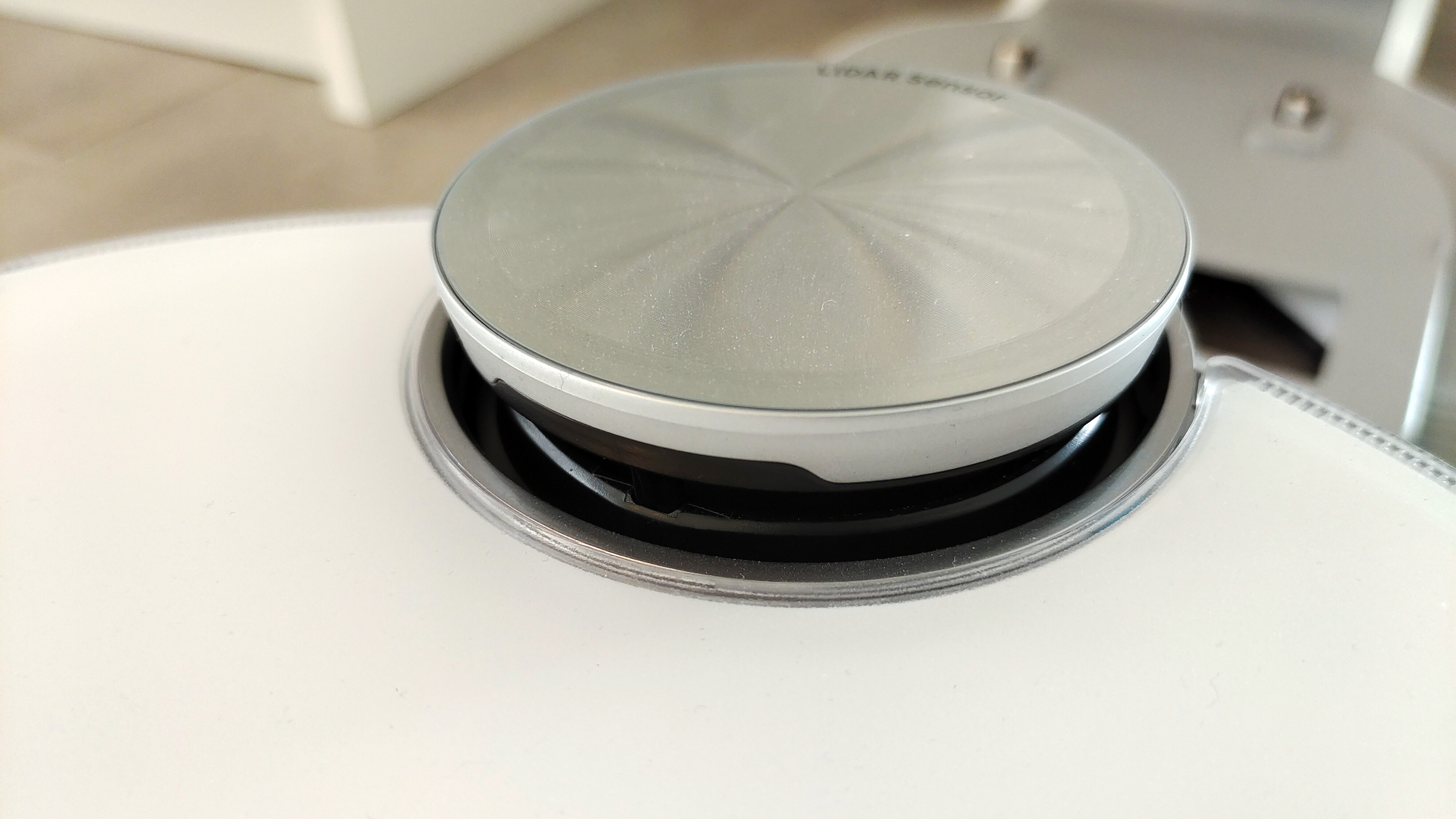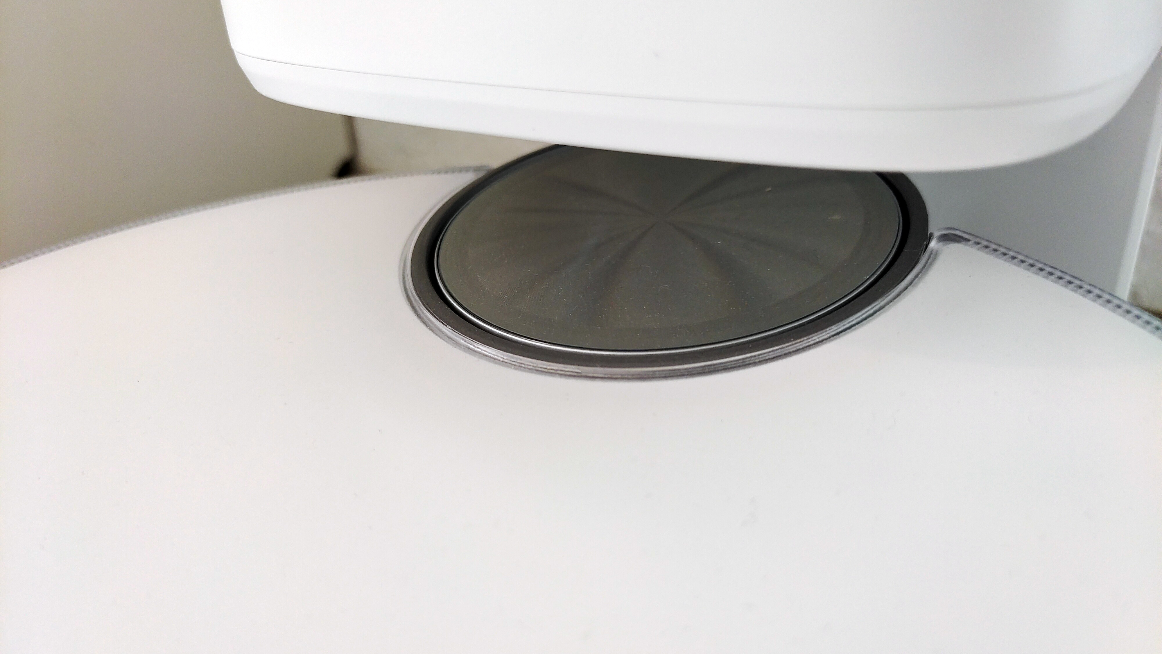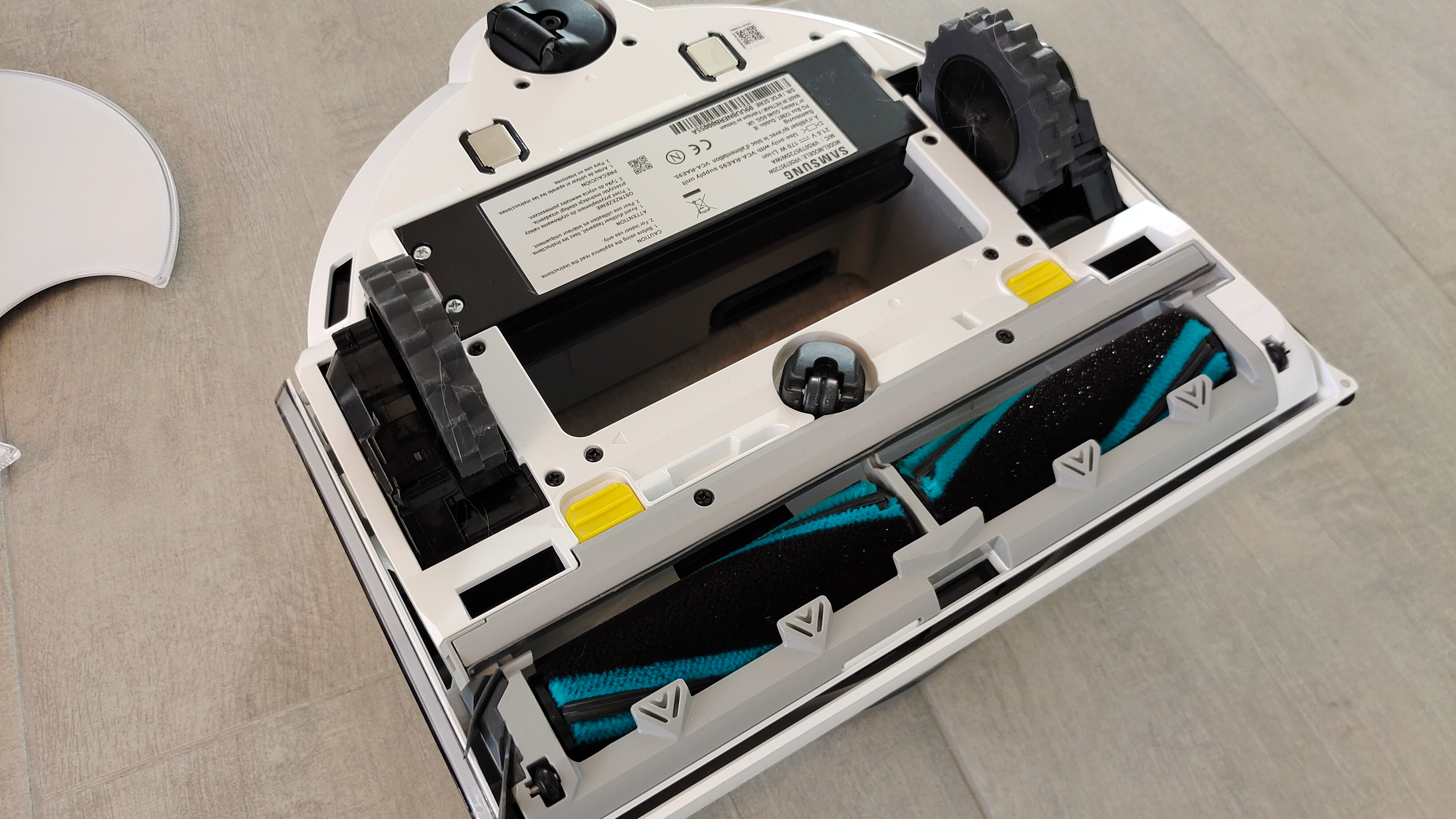 Auf der Oberseite gibt es zwei Sensortasten zur direkten Steuerung des Bots. Die komplette Oberseite lässt sie abnehmen, sie wird magnetisch gehalten. Darunter verbirgt sich nicht nur der große Schmutzbehälter, sondern auch ein Feinstaubfilter, der separat von oben in den Roboter eingesteckt wird. Ein weiterer Filter befindet sich im ausladenden Schmutzbehälter. Eine weitere Besonderheit: Entnimmt man den Schmutzbehälter, schaut man direkt auf den zu reinigenden Boden, auf dem der Roboter steht. Im Umkehrschluss schaut man von unten direkt auf den Staubbehälter – das ist sonst bei kaum einem anderen Saugroboter so. Ebenfalls anders: Unten am Gerät gibt es zwei Schrauben, die die Abdeckung für den Akku halten. Löst man sie, ist der Akkutausch kein Problem. Das ist bei der Konkurrenz weit schwieriger.