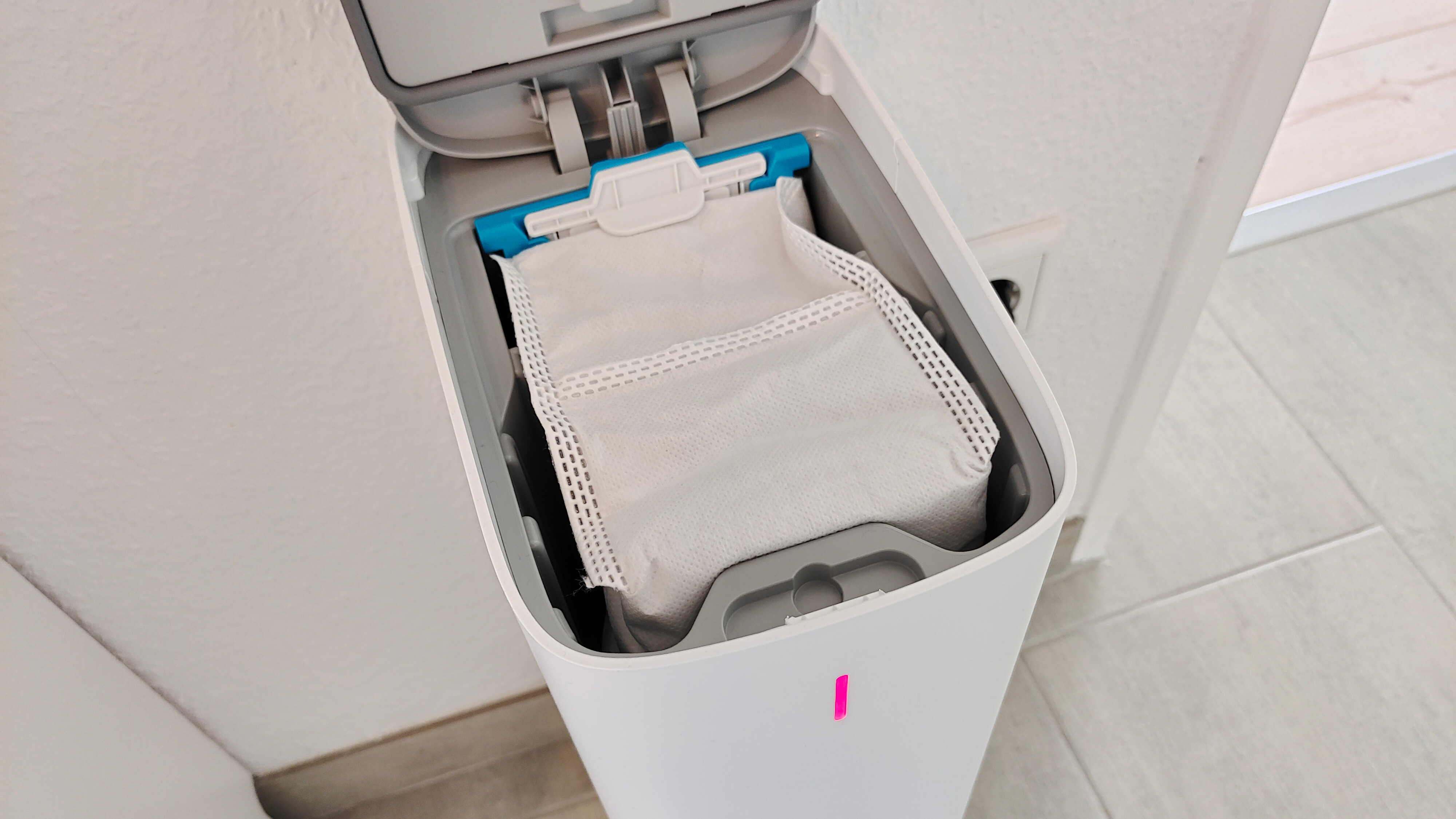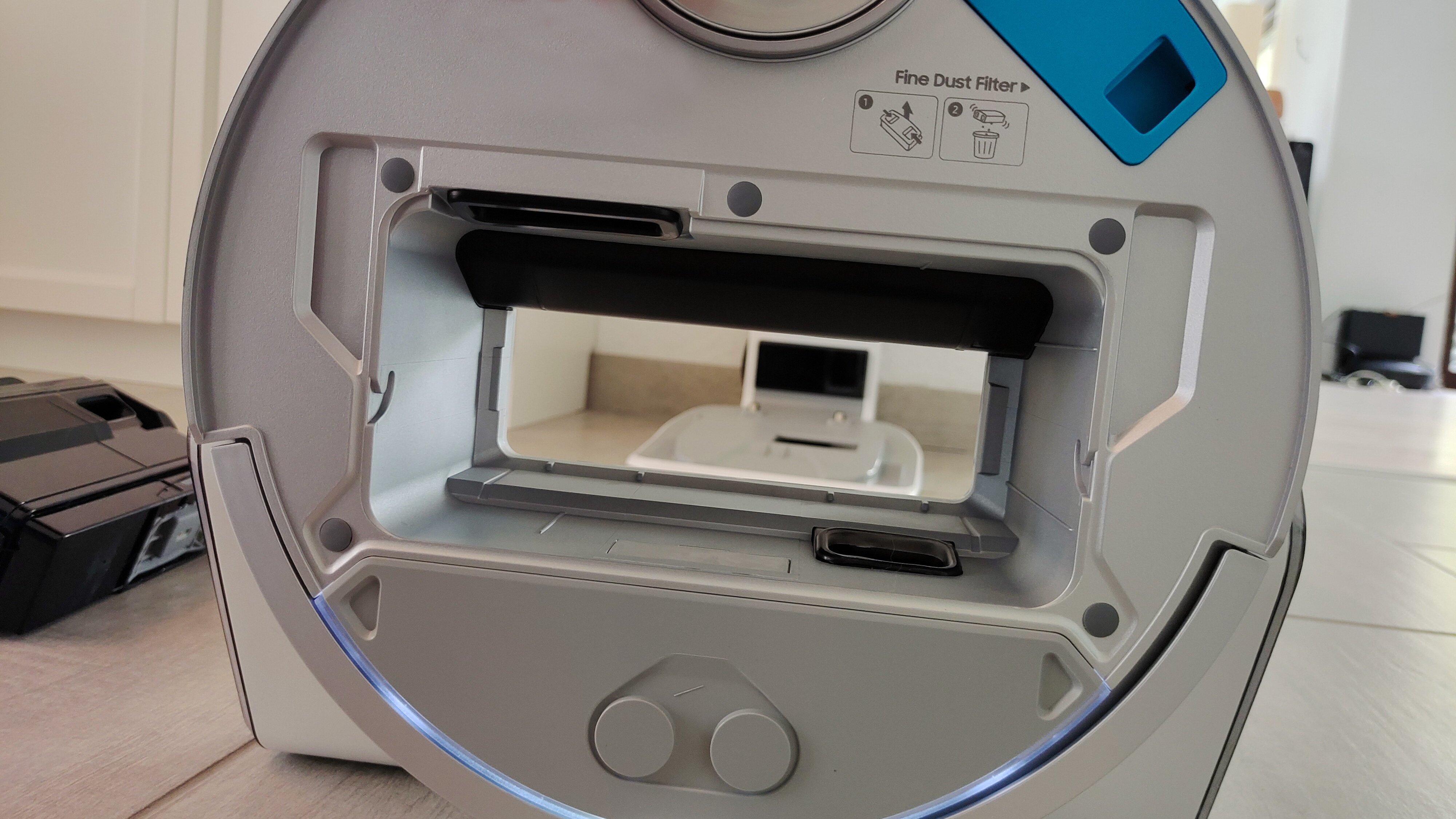 Die Absaugstation des Samsung Jet Bot AI+ ist recht schmal, dafür aber recht hoch. Sie bietet Kabelmanagement und vor allem weitere Filter. Wie bei anderen Produkten wie etwa dem Samsung Jet 90 (Testbericht) sorgt der Hersteller auch bei seinem Spitzen-Saugroboter wortwörtlich für gute Luft.