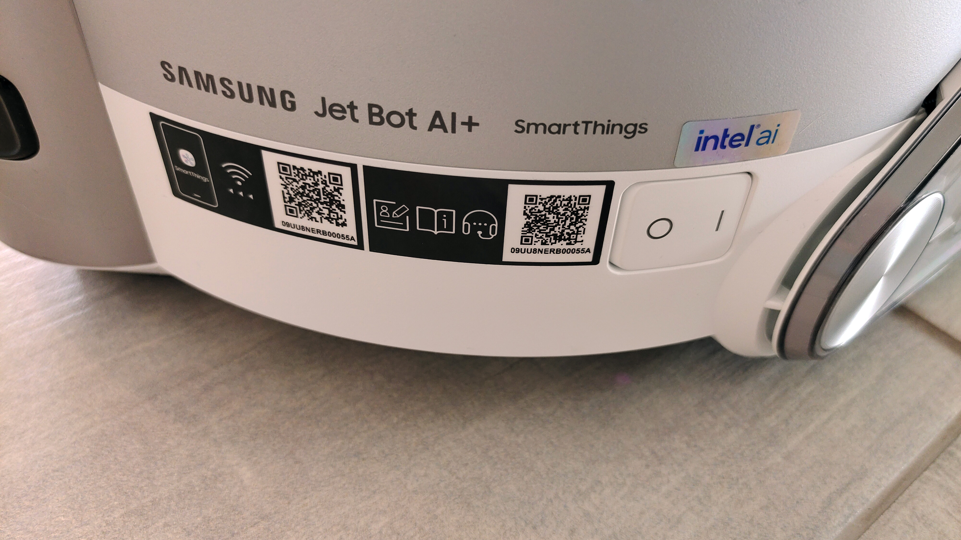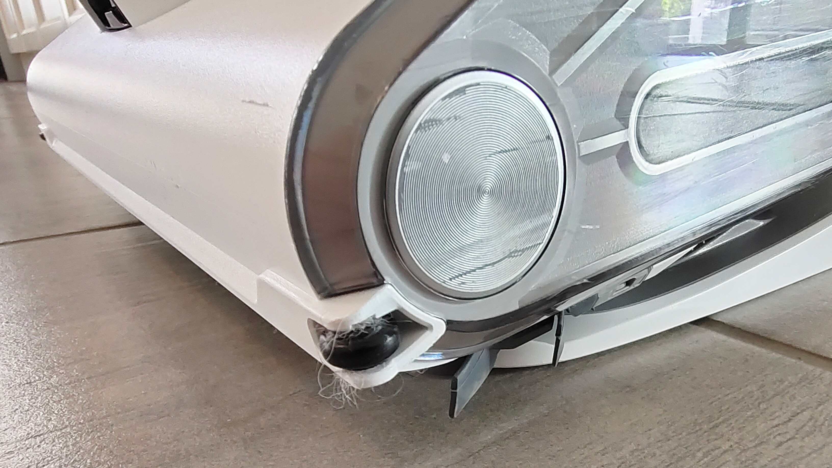 Schon beim Design macht Samsung einiges anders als die Wettbewerber. Der runde Korpus des Jet Bot AI+ ist höher als die Konkurrenz, daran angeflanscht ist allerdings ein Konstrukt, dass aussieht, als verberge es Ketten statt Räder – ähnlich den Dyson-Saugrobotern. Zudem bietet dieses Konstrukt die Möglichkeit, eines der größten Probleme von runden Saugrobotern zu beseitigen: die Eckenreinigung. Denn durch die runde Form kommen solche Sauger auch mit langer Seitenbürste nicht richtig in die Ecken eines Raumes, weshalb dort immer Schmutz zurückbleibt. Der Jet Bot von Samsung hat aber neben dem runden Gehäuse vorn ein eckiges Design, er ist also von oben betrachtet eigentlich nicht rund, sondern folgt der D-Form, der auch Anbieter wie Neato weiter folgen. Tatsächlich verzichtet Samsung dafür im Gegenzug auf eine Seitenbürste. Stattdessen gibt es nur zwei kurze Gummilamellen, die Schmutz an der linken Seite zur Hauptbürste leiten sollen.