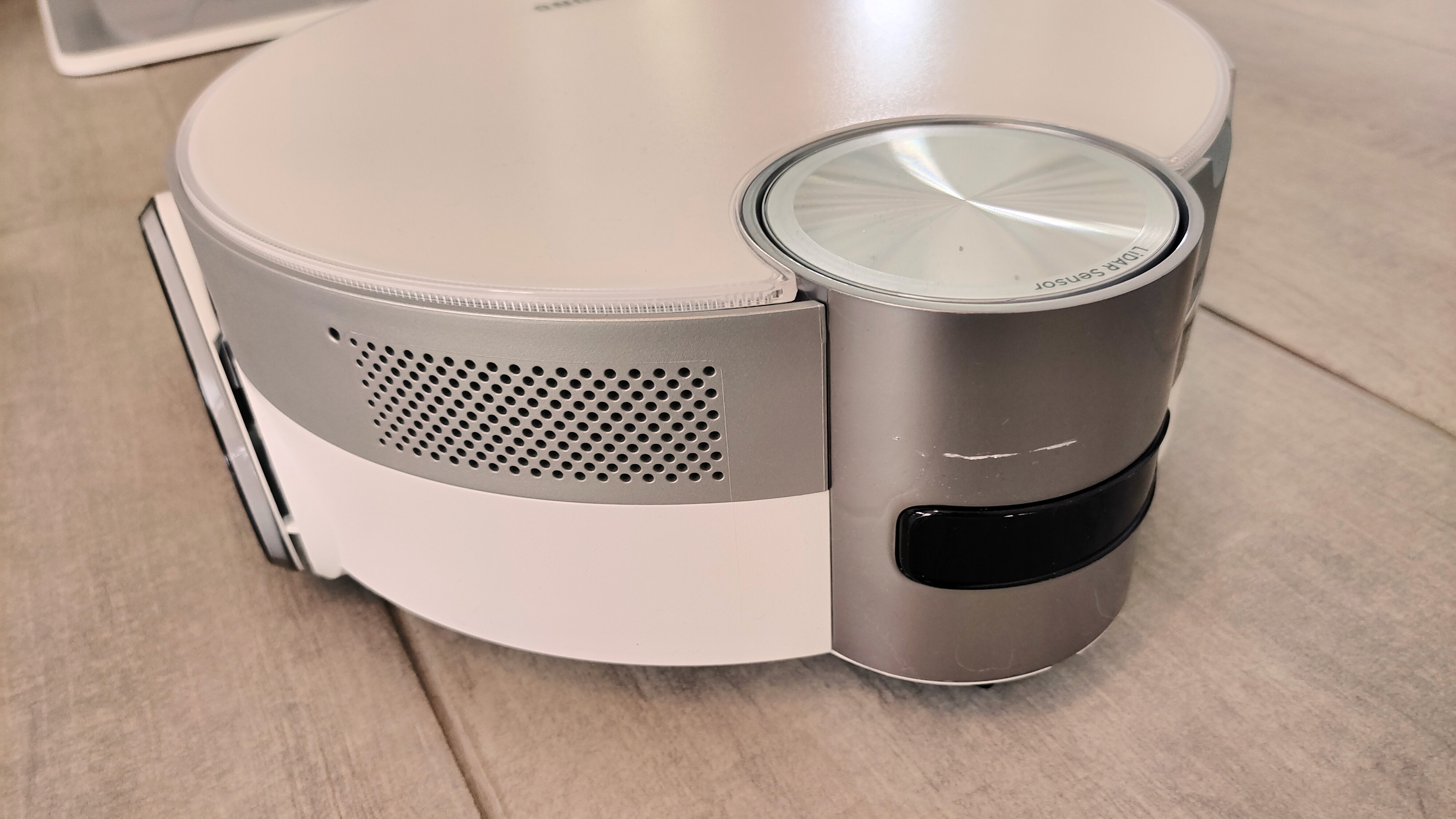 Die Navigation des Samsung Jet Bot AI+ ist teils erstaunlich gut, teils suboptimal. Fangen wir mit den nicht ganz gelungenen Dingen an. Der Roboter bewegt sich recht ruppig durch die Wohnung und schiebt und dreht sich trotz seiner zahlreichen Sensoren oftmals recht unbedarft durch die Gegend. Wenn er etwa mit einer vorderen Ecke an einem Möbelstück hängenbleibt, schiebt er immer noch etwas weiter und stellt sich dadurch leicht schräg. Das stört ihn zwar anschließend nicht und er setzt seine Arbeit direkt wieder unbekümmert fort, allerdings macht das keinen sehr professionellen Eindruck. Im Test hat er sich sogar einen kräftigen Kratzer auf der Rückseite eingefangen. Die generelle Navigation ist, was Wegfindung angeht, hingegen sehr gut. Festgefahren hat sich der Roboter während des Tests nicht, den Weg zurück zur Ladestation fand er ebenfalls immer. Gar nicht gefallen hat uns hingegen die „intelligente“ Saugkraftanhebung – die funktionierte bei uns auf Teppich kaum, dafür würde die Saugleistung an Stellen erhöht, an denen wir keinen Grund sahen. Und es gibt noch ein Problem: Der Jet Bot AI+ ist hoch – zu hoch. Er kommt auf fast 14 Zentimeter mit ausgefahrenem Laser-Turm – das ist zu hoch fürs Bett oder die meisten Couchen. Einen echten Grund, den Roboter so hoch zu bauen, konnten wir im Test nicht erkennen.
