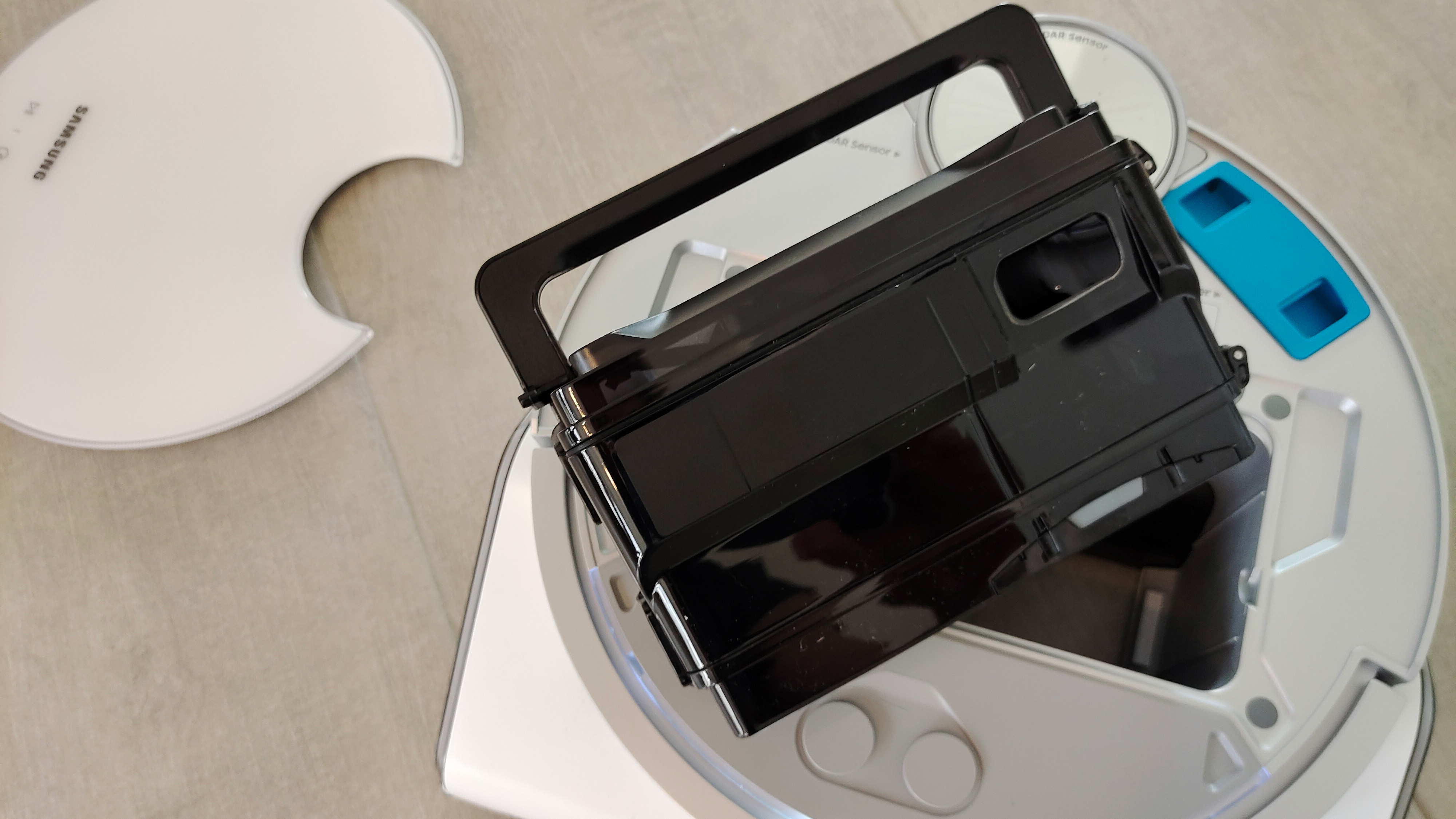 Positiv bei der Absaugstation ist die vergleichsweise geringe Lautstärke und die generelle Funktion, hier gab es im Test keinerlei Probleme. Erreicht der Sauger im Normalbetrieb 64 bis 72 Dezibel, so sind es bei der anschließenden Absaugung knapp 80 Dezibel – da ist mancher Konkurrent lauter. Nicht ganz gefallen hat uns der Umstand, dass zwar der Inhalt des Staubbehälters komplett ausgesaugt wurde, nicht aber feiner Staub am Filter und an der Zyklon-Box im Staubbehälter. Hier muss der Nutzer doch immer wieder manuell ran. Die maximale Reinigungszeit gibt Samsung mit 90 Minuten an, anschließend wird für rund 210 Minuten geladen. Damit ist der Sauger eher für mittelgroße Umgebungen um 80 Quadratmeter geeignet. Wischen kann der Roboter nicht.