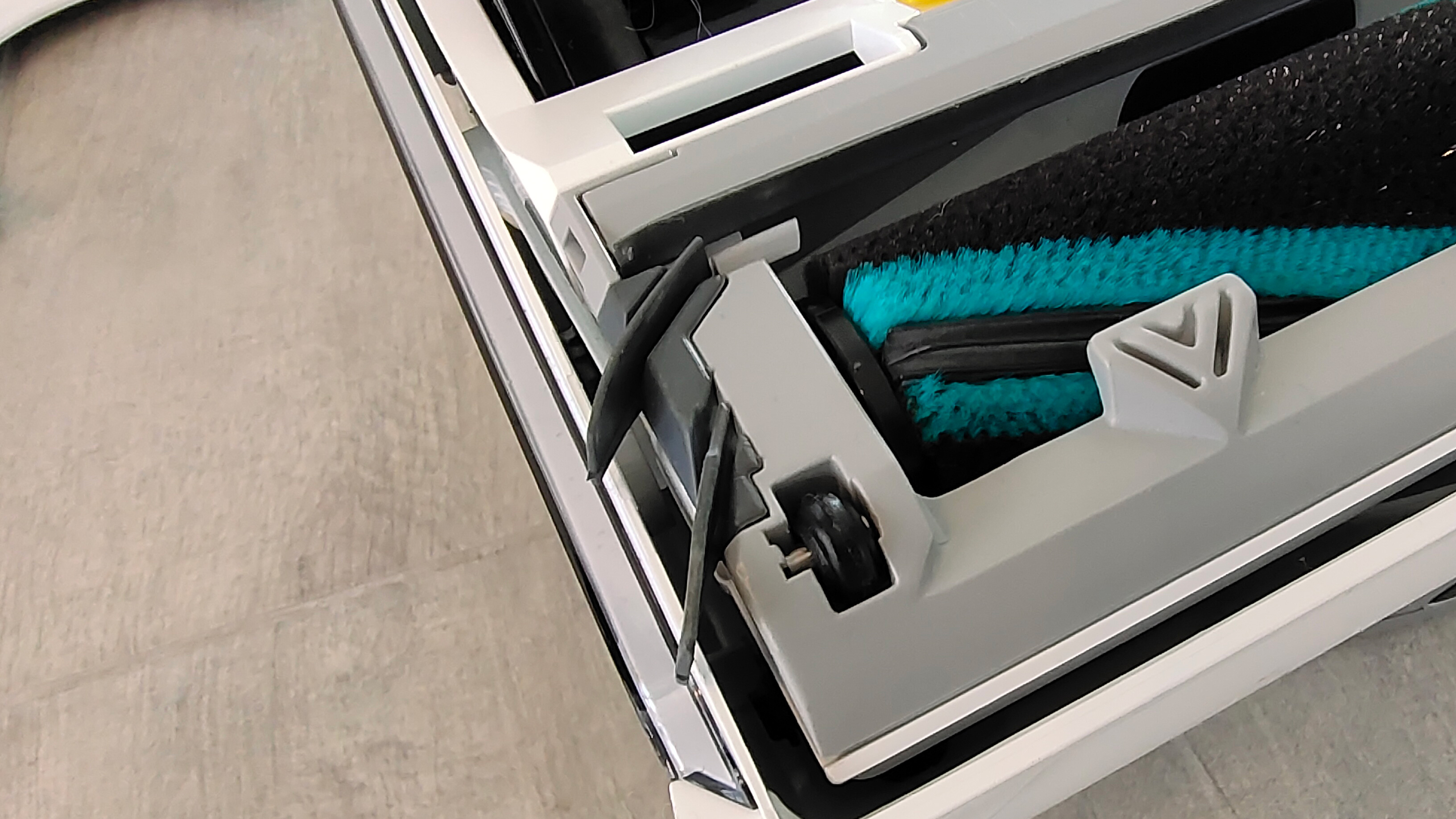 Kommen wir zur Reinigungsleistung. Ein erster Blick auf die Hauptbürste ließ uns zuerst an deren Effizienz zweifeln, denn sie besteht aus dem typischen Flauschematerial für Hartböden kombiniert mit einer spiralförmig umlaufenden Gummilamelle. Tatsächlich macht die ihre Arbeit aber ziemlich gut. So fand der Saugroboter in unserem Testparcours von 30 Gramm Sittichfutter und 20 Gramm feinem Vogelsand 25 Gramm und 11 Gramm – das ist eher Mittelmaß. Ein genauerer Blick offenbarte dann allerdings, dass das durchwachsene Ergebnis an der Materialbeschaffung des Untergrundes unserer Testumgebung lag. Denn im Alltagstest tat sich der Roboter durch hervorragende Saugleistung auf Hartboden hervor, auf Teppich lag die aber her im unteren Mittelfeld. Erschwerend kam hinzu, dass der Sauger trotz der für 90-Grad-Ecken positiven Form nicht wirklich bis in die Ecke hineinsäubert – zumindest nicht, wenn dort etwas schwererer Schmutz liegt. Hier fehlt letztendlich die Seitenbürste.