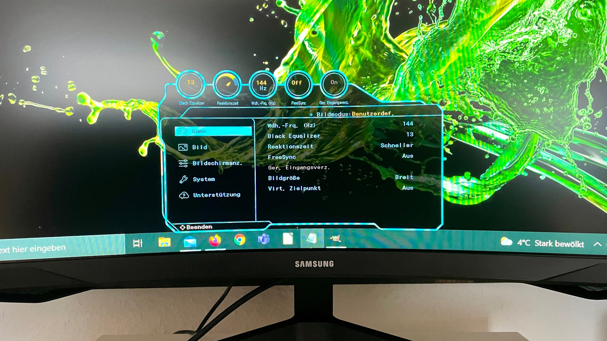 Der Odyssey G5 hat dasselbe On-Screen-Display (OSD) wie die anderen Monitore der G-Familie. Es wirkt aufgeräumt, sodass man schnell einen guten Überblick über die gesamten Einstellungsmöglichkeiten des Monitors erhält. Die wichtigsten Gaming-Einstellungen wie Black Equilizer, Reaktionszeit, Bildwiederholrate, FreeSync und Geringe Eingangverzögerung werden dem Gamer in runden Kacheln direkt angezeigt. Gamer sollten aber beachten, dass die Monitor-Anzeige im OSD nicht die aktive Bildwiederholrate der Grafikkarte anzeigt, sondern die eigens eingestellte Monitorfrequenz. Eingestellt wird der G5 über über einen kleinen Joystick, der mittig unter dem Monitor sitzt. Er ist auch gleichzeitig der Power-On-Button. Durch das Steuern links/rechts und vor/zurück navigiert man einfach durch die Untermenüs und kommt so zu allen Features, die einem der G5 bietet.