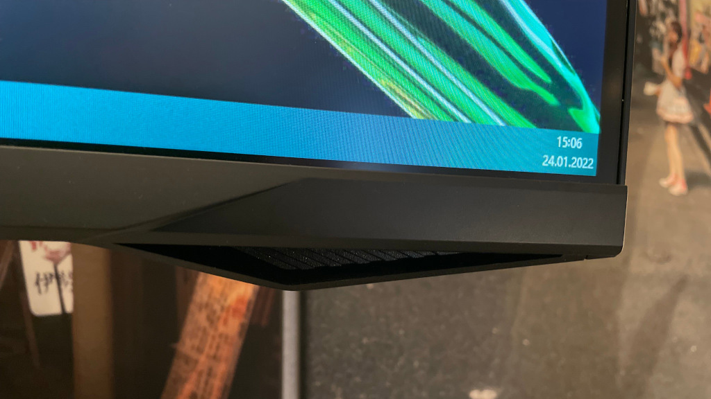 Der Samsung Odyssey G5 hat nur wenige zusätzliche Features. Nutzer können ein virtuelles Fadenkreuz hinzufügen und es gibt einen Eye-Saver-Modus sowie Flicker-Free-Darstellung, die helfen, die Belastung der Augen zu reduzieren. Auch wenn es so aussieht, verfügt der Gaming-Monitor über keine Lautsprecher. Auf der Rückseite des Monitors befinden sich 1x HDMI 2.0 und 1x DirectPort 1.2 sowie ein 3.5 Audio Jack für den Kopfhörer-Ausgang.