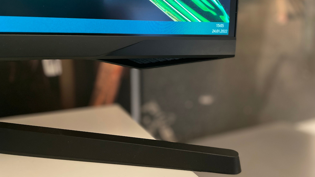 Die Rückseite des Monitors besteht aus strukturiertem Kunststoff, der in dieser Preisklasse üblich ist. Alle Eingänge sind nach unten gerichtet, am Standfuß befindet sich eine Lasche zur Kabelführung. Für den Aufbau benötigt man kein Werkzeug, der Fuß rastet an der Rückseite einfach ein.
