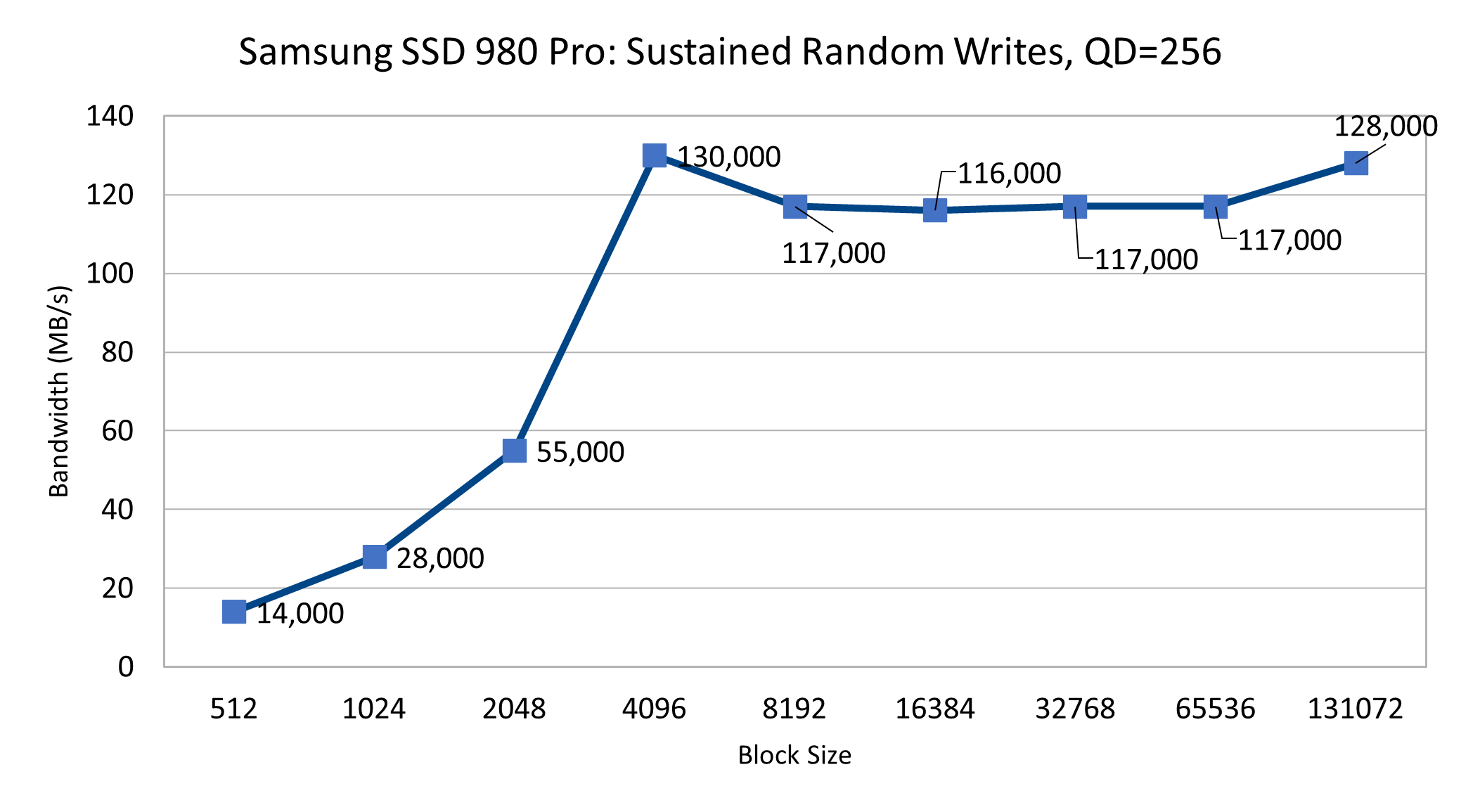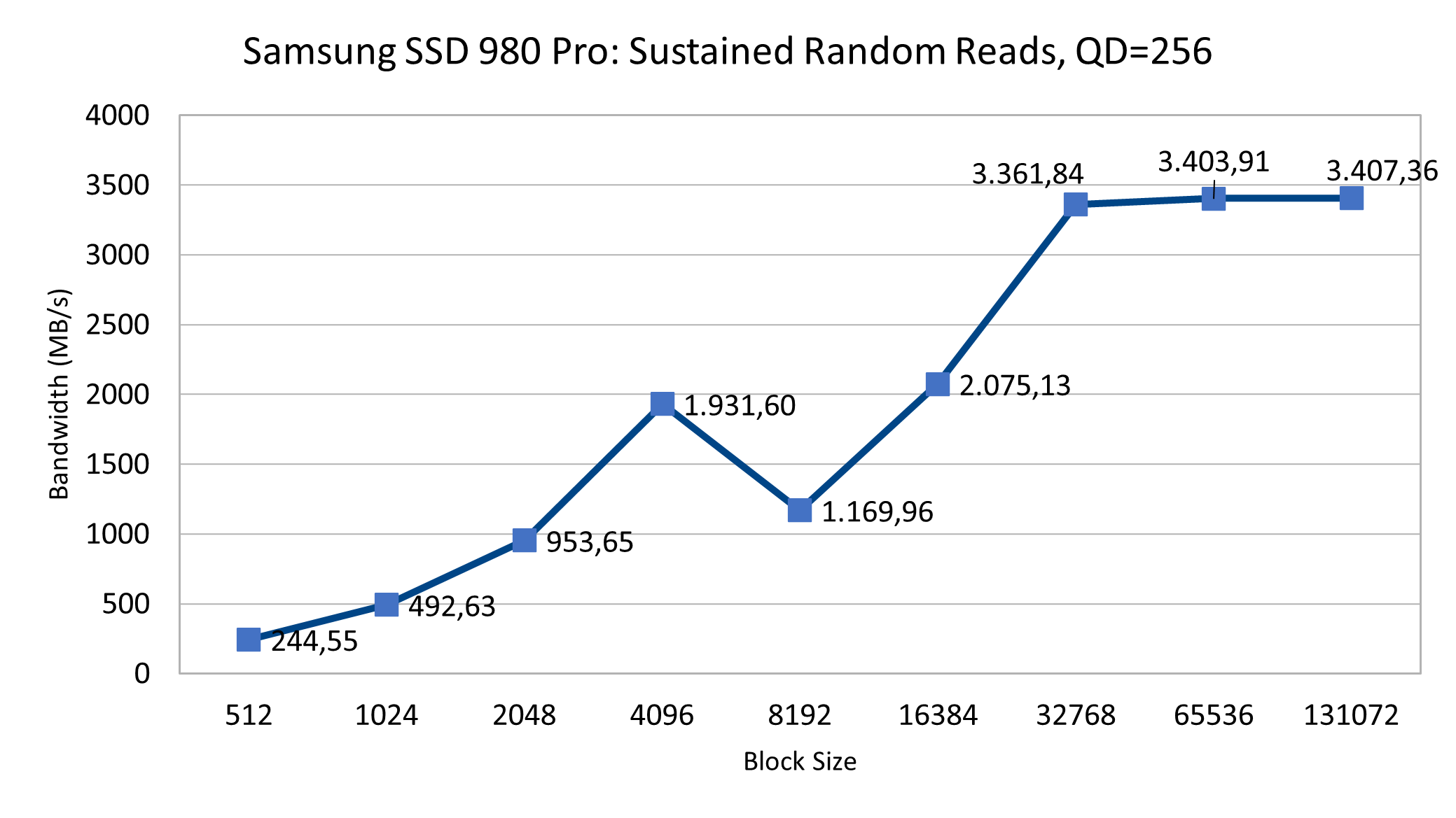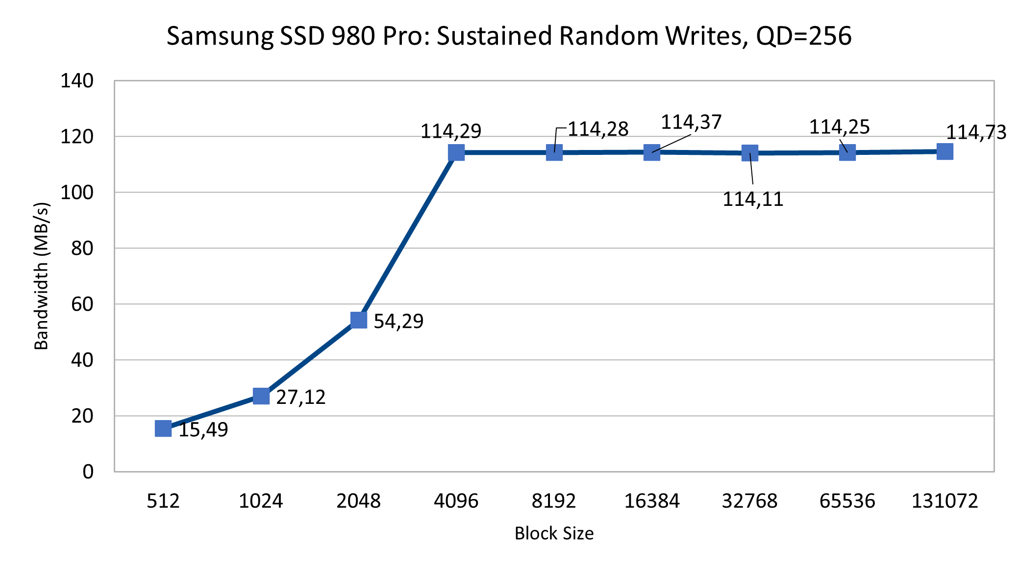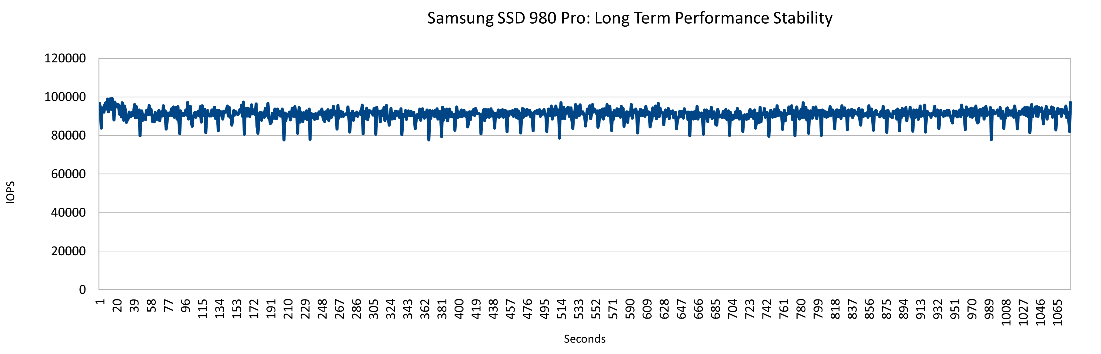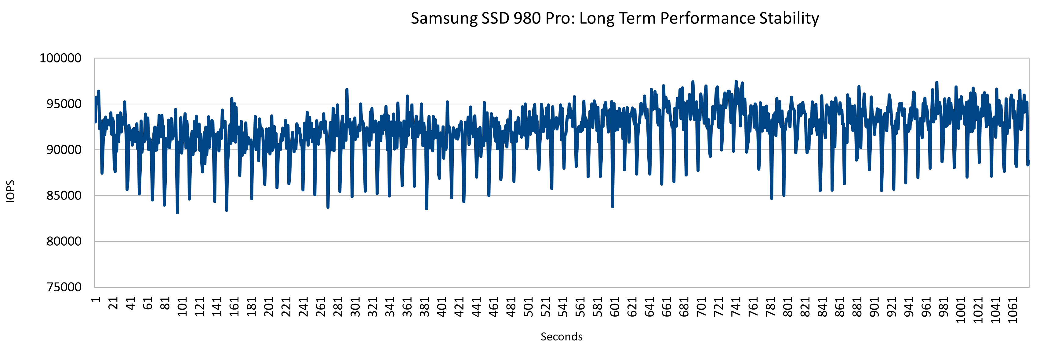 Beim ezFIO fällt zunächst auf, dass die M.2-NVMe unter Dauerlast deutlich stabiler agiert als die Samsung SSD 980 (Testbericht). Das gilt besonders für das PCIe-3.0-System. Hier merkt man, dass die SSD 980 Pro weit unterhalb ihrer Maximalleistung bleibt, es gibt kaum Ausschläge nach oben oder unten. Die IOPS-Zahl ist bei PCIe 4.0 etwas höher, das gilt allerdings auch für die Variation.