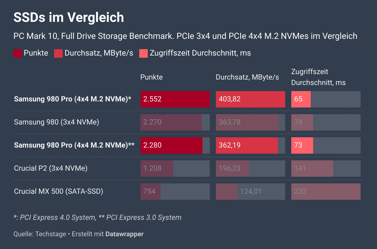 Beim Benchmark-Test von PCmark erkennt man gut, wie eng die Systeme bei Alltagsaufgaben beieinander liegen. Das zeigt außerdem schön, dass nicht nur die reine Leistung des Speichers wichtig ist, sondern dass man Flaschenhälse im kompletten System angehen muss. Beim Durchsatz in einem PCIe 3.0-Computer liegen die Samsung SSD 980 (PCIe 3.0) und Samsung SSD 980 Pro (PCIe 4.0) so nah zusammen, dass der Unterschied durch die allgemeine Ungenauigkeit bei Benchmarks erklärt werden kann.