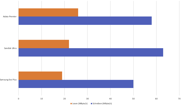 Darüber hinaus ist es wichtig, dass die Karte Aufnahmen konstant schreibt. Andernfalls kommt es zu Rucklern in Videos, wie beispielsweise bei der von uns getesteten PNY Pro Elite (Testbericht). Ob die Schreibgeschwindigkeit der Sandisk Ultra konstant hoch ist, zeigt unser Geschwindigkeitscheck.