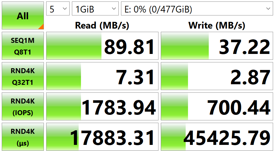 Im Crystal Disk Mark liest und schreibt die Sandisk Ultra 1 GByte große Datenpakete. Die durchschnittliche Lesegeschwindigkeit liegt bei 87 MByte/s, die Schreibgeschwindigkeit bei 37 MByte/s. Vor allem bei der Schreibgeschwindigkeit liegt die Sandisk Ultra damit deutlich unter dedizierten 4K-Karten wie der Samsung Evo Plus, die auf durchschnittlich 77 MByte/s kommt. Eine direkt vergleichbare Adata Premier kommt auf 58 MByte/s.