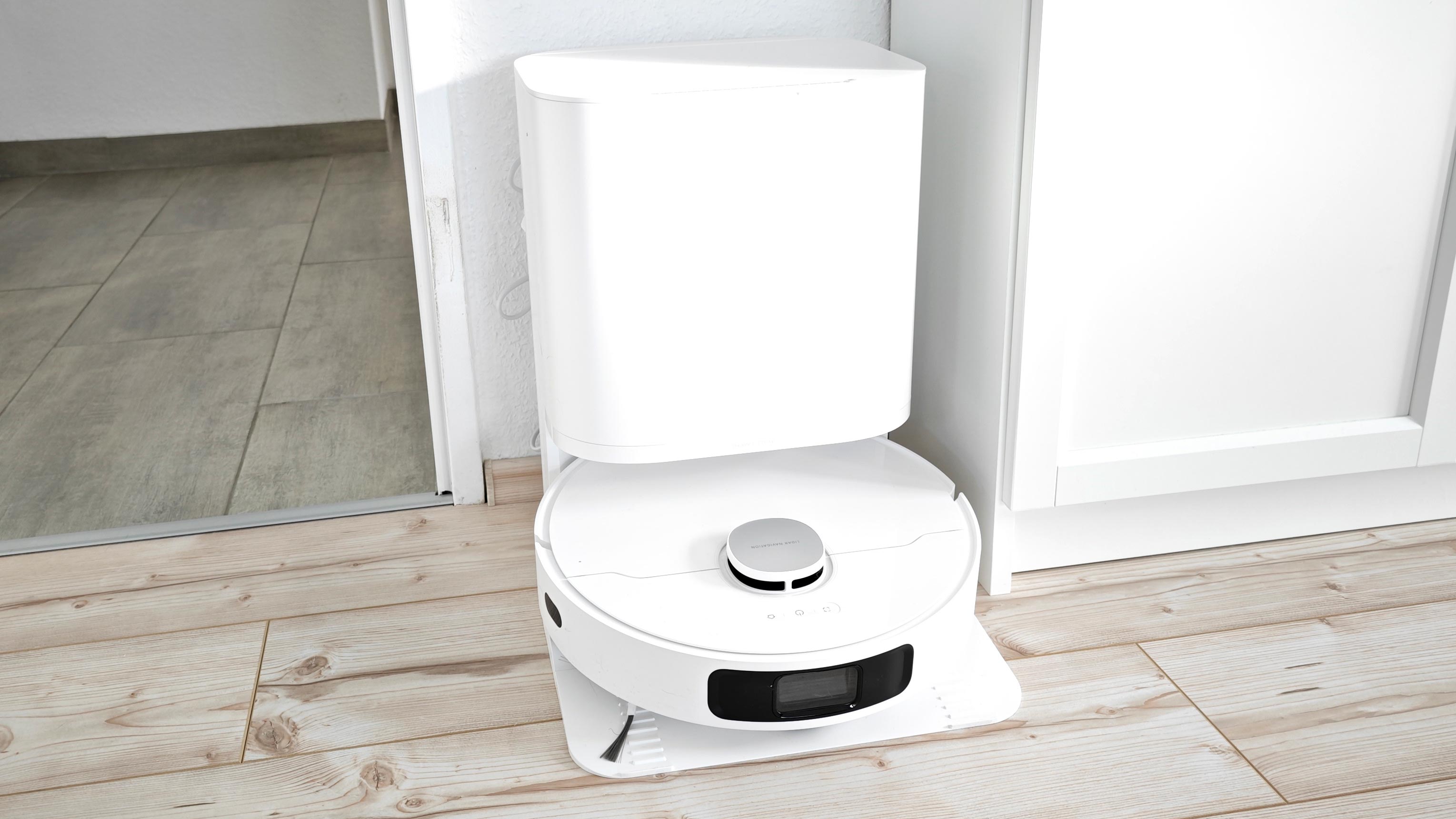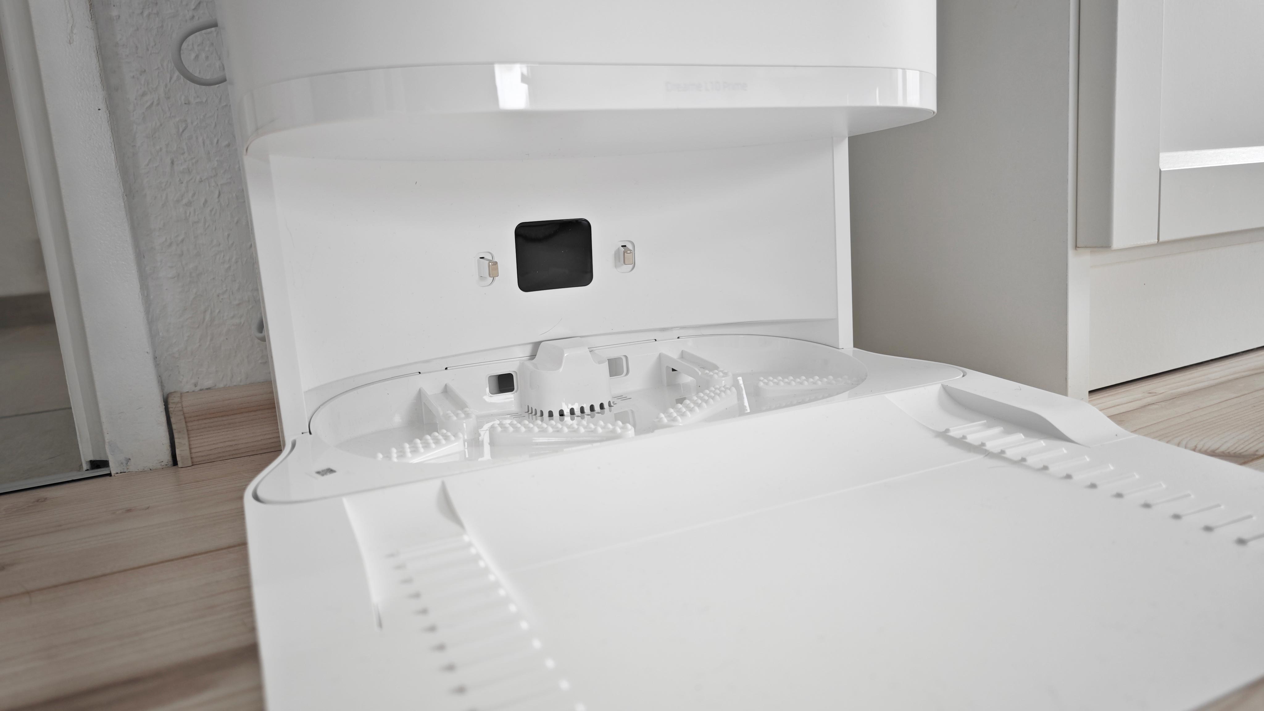 Leider bietet die Reinigungsstation des L10 Prime kein Kabelmanagement, sondern stattdessen lediglich eine kurze Kabelführung nach links oder rechts aus der Station. Wichtiger ist aber die Warmlufttrocknung, die sie Station für die beiden drehenden Mopps des Roboters bietet. Damit wird Stock- und Schimmelbildung durch zu langsames Trocknen effektiv unterbunden.