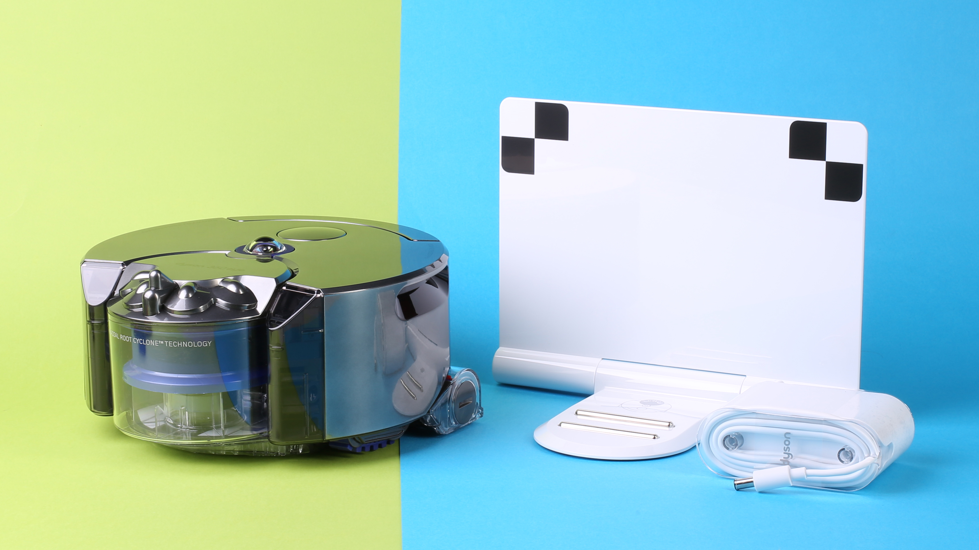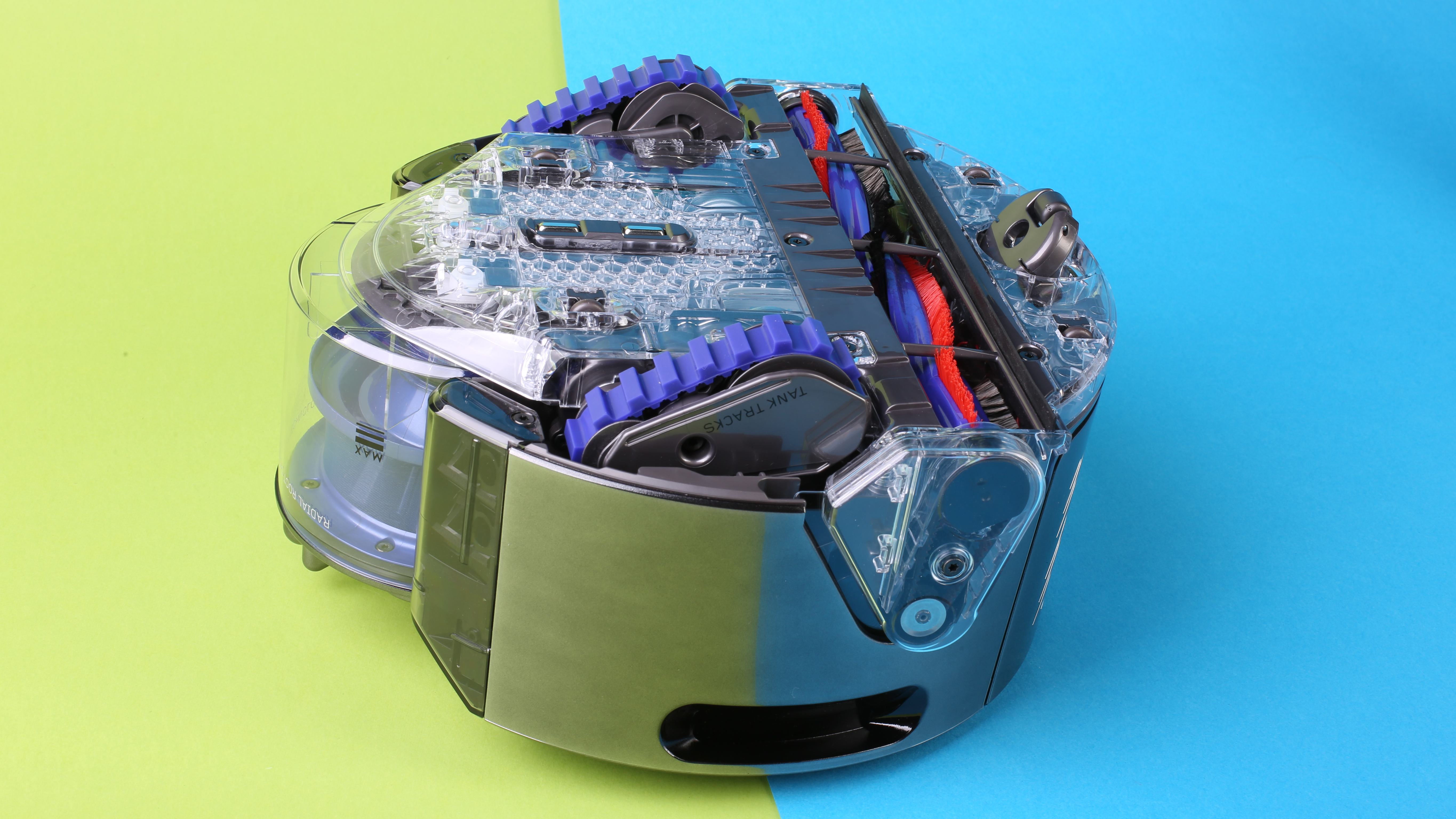 Zur Orientierung setzt Dyson auf IR-Sensoren und eine 360-Grad-Kamera. Diese befindet sich mittig auf der Oberseite des Saugers. Um Treppenstürze zu verhindern, nutzt der Dyson-Sauger Infrarot-Sensoren. Für Vortrieb sorgen zwei kleine Raupenantriebe. Eine berührungsempfindliche Leiste zur Hinderniserkennung ist nicht vorhanden. Zur Bedienung ist nur ein einzelner Taster auf der Oberseite vorhanden. Er ist beleuchtet und gibt Auskunft über den Betriebszustand.