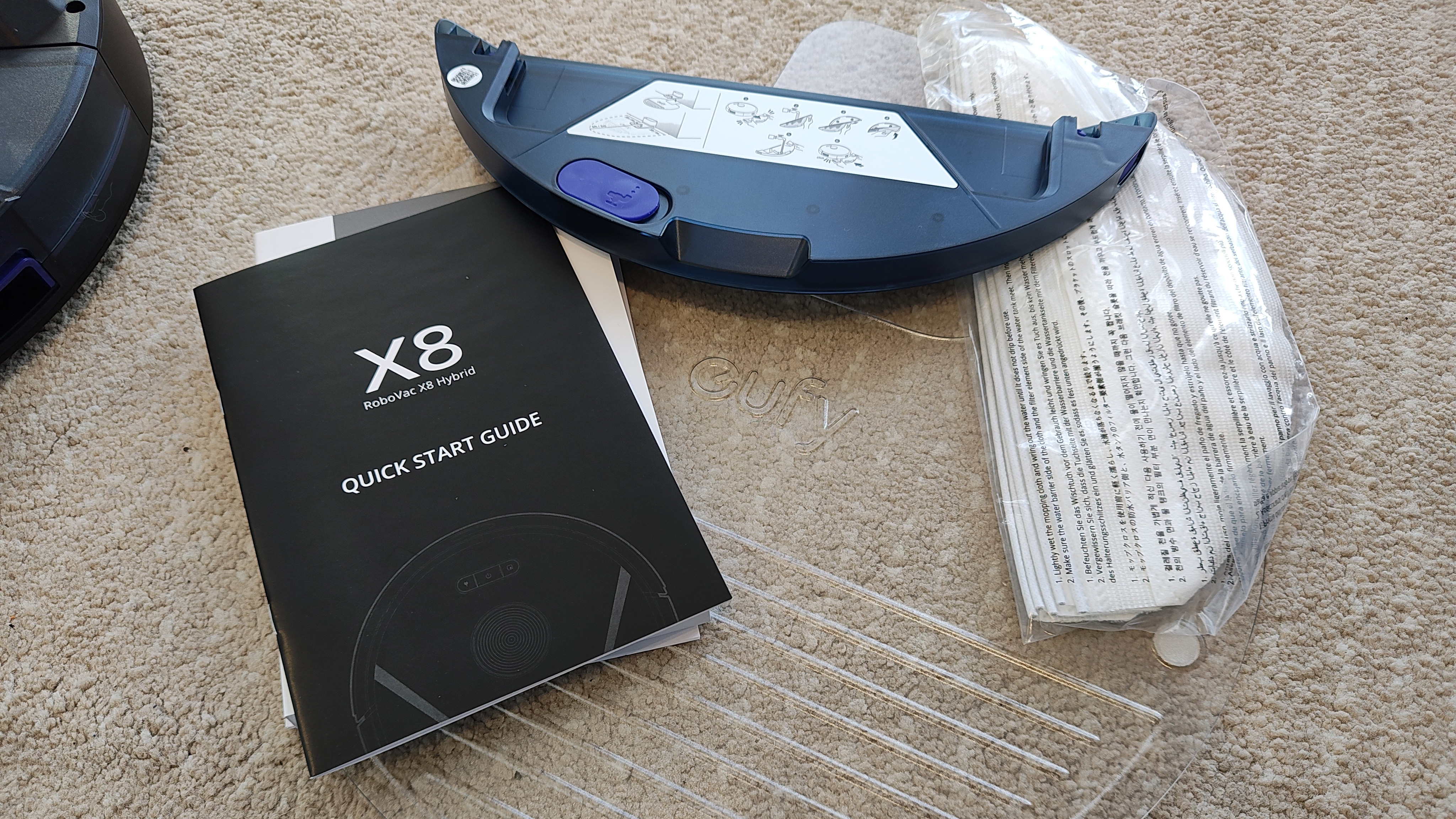 Das Außergewöhnlichste am Lieferumfang des Eufy Robovac X8 Hybrid dürften wohl die beigelegten Kabelbinder sein, um potenzielle Fallstricke (aka Kabel) in der Wohnung etwas entschärfen zu können. Ansonsten ist alles Standard: Sauger, Ladestation mit Kabelmanagement, Ersatz- Seitenbürste sowie -Luftfilter und etwas Papier zum Durchlesen. Außerdem sind noch einige Einmaltücher zum Wischen im Lieferkarton und eine Unterlegplatte soll davor schützen, dass der Saugroboter mit feuchtem Wischtuch den Boden an der Ladestation aufweicht.