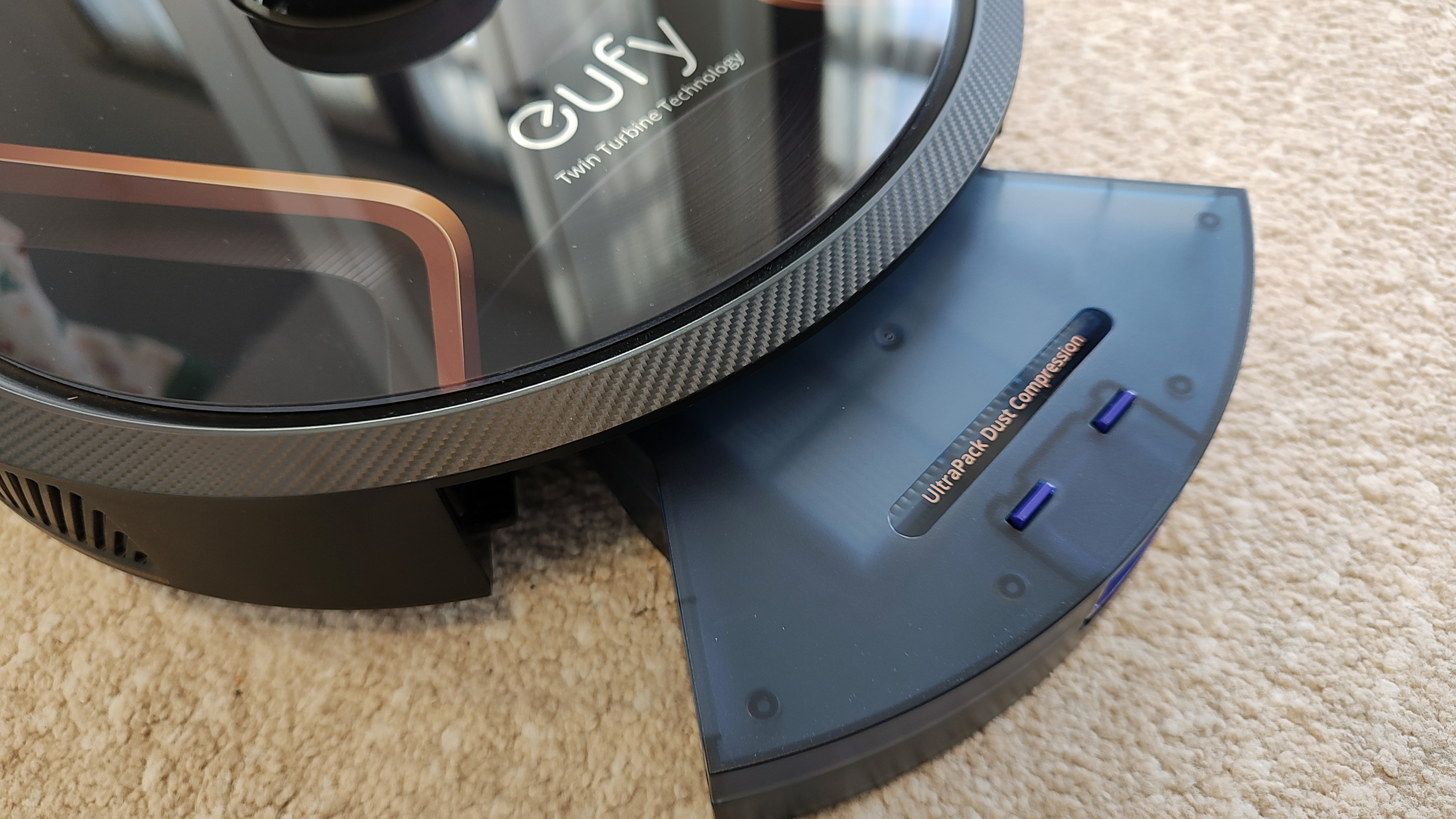 Das Entleeren des Schmutzbehälters geht einfach von der Hand. Etwas störend ist hier der Umstand, dass es keine Rückhalteklappe an der Einsaugöffnung des Behälters gibt – wer ihn auf dem Weg zum Abfalleimer nicht gerade hält, darf anschließend gleich noch einmal saugen (lassen). Die Wischleistung haben wir wie immer bei solch einfachen Wischtechniken (und die ist beim Eufy Robovac X8 Hybrid schon vor drei Jahren nicht mehr taufrisch gewesen …) gar nicht erst angeschaut. Für Allergiker kann sie dennoch hilfreich sein, denn zum Staubwischen dürfte das reichen. Achtung: Auch mit angebrachtem Wisch-Equipment fährt der Sauger auf Teppich.