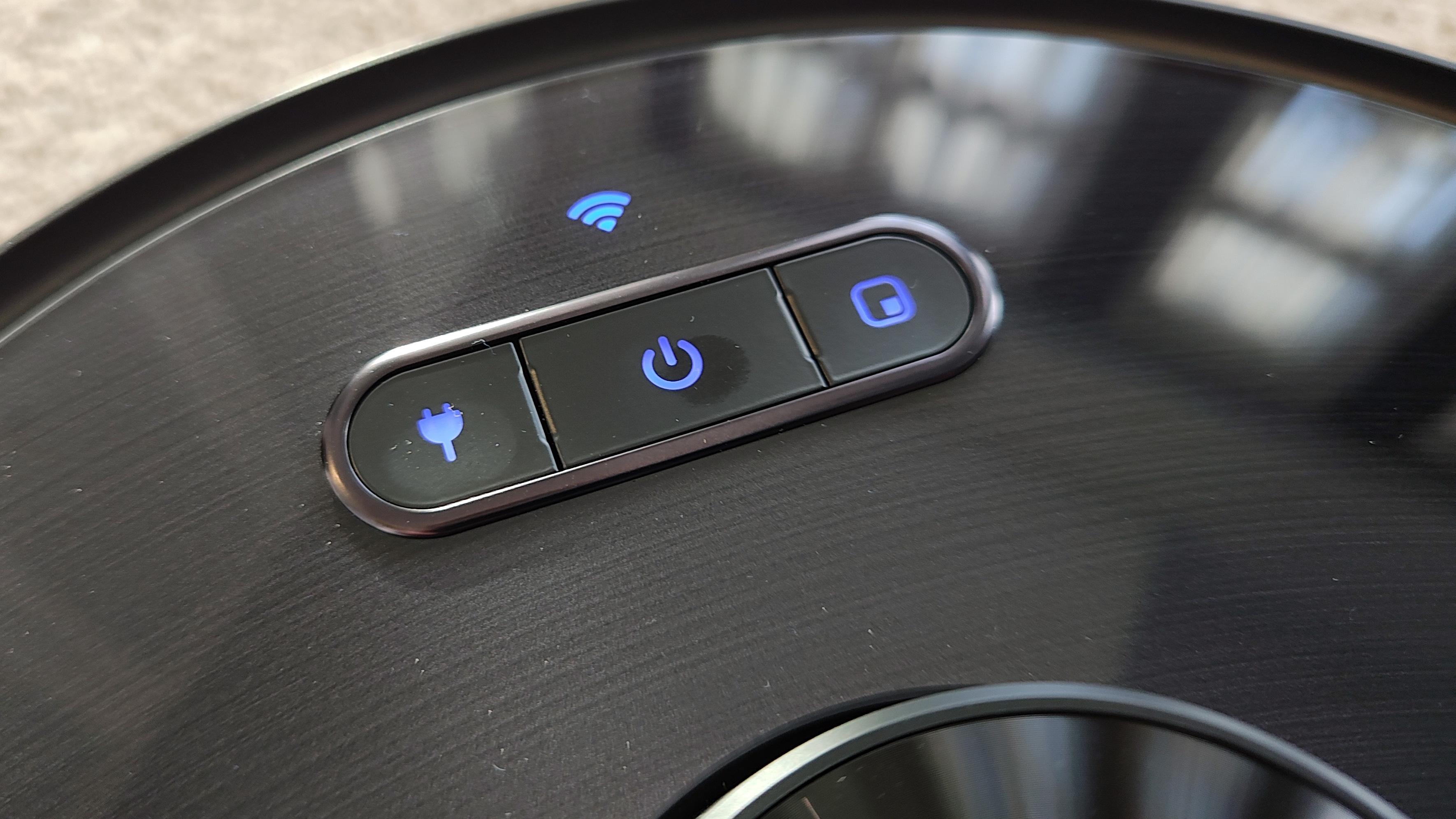 Im Gegensatz zu den meisten Konkurrenten kommt der Eufy Robovac X8 Hybrid nicht in Weiß oder reinen Schwarz zum Kunden, sondern mit Carbon-Look und goldenen Akzenten. Das sieht schick aus und ist mal etwas anderes. Der Rest ist typisch für den Hersteller: Rundes Gehäuse mit aus der Mitte leicht nach vorn versetztem Laserturm, davor drei Bedientasten, die Oberseite ist aus Glas. Entsprechend lässt sie sich nicht wie bei vielen anderen Modellen aufklappen, stattdessen sitzt der Staubbehälter mit seinen 400 ml Fassungsvermögen am Heck.