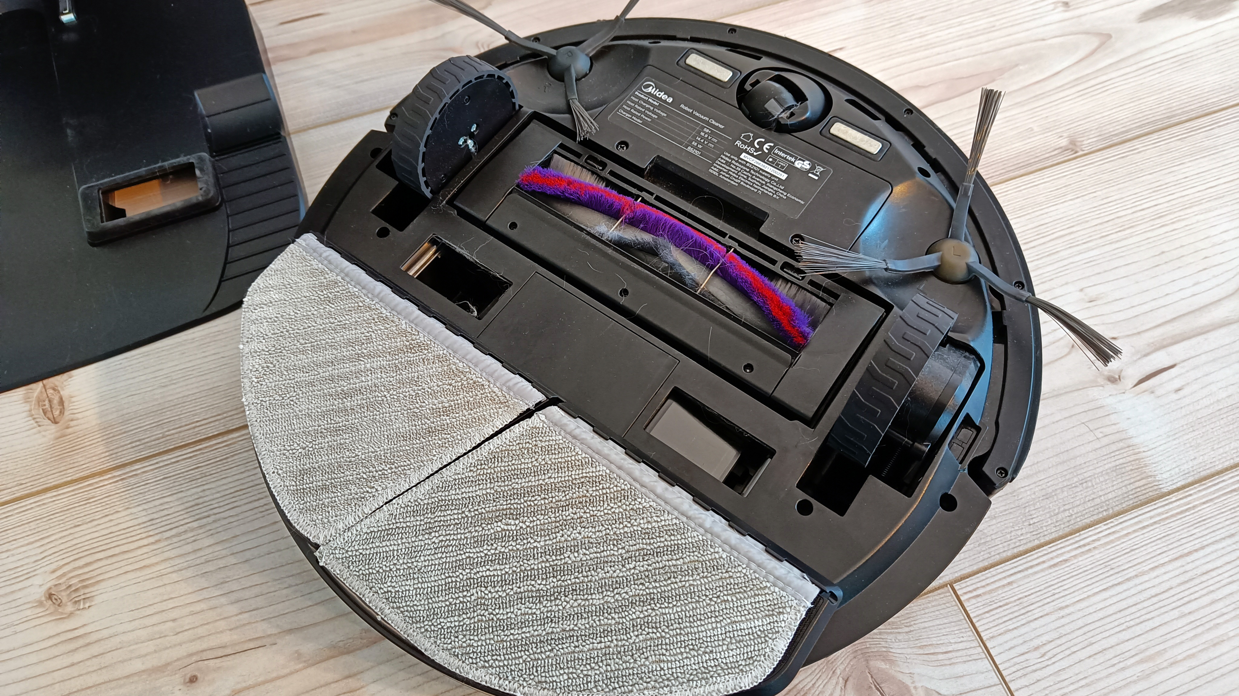 Zusatzelektronik im Bumper wie Kamera oder Kreuzlaser zur 3D-Hinderniserkennung bietet der Midea S8+ nicht, die Standardelektronik, damit das Gerät präzise an Wänden entlangfahren kann und an Absätzen nicht abstürzt, hingegen schon. Zudem gibt es zwei Seitenbürsten, die schwimmend gelagerte Hauptbürste besteht aus zwei gedrehten Borstenreihen unterschiedlicher Härte.