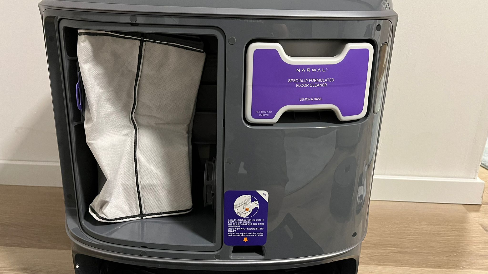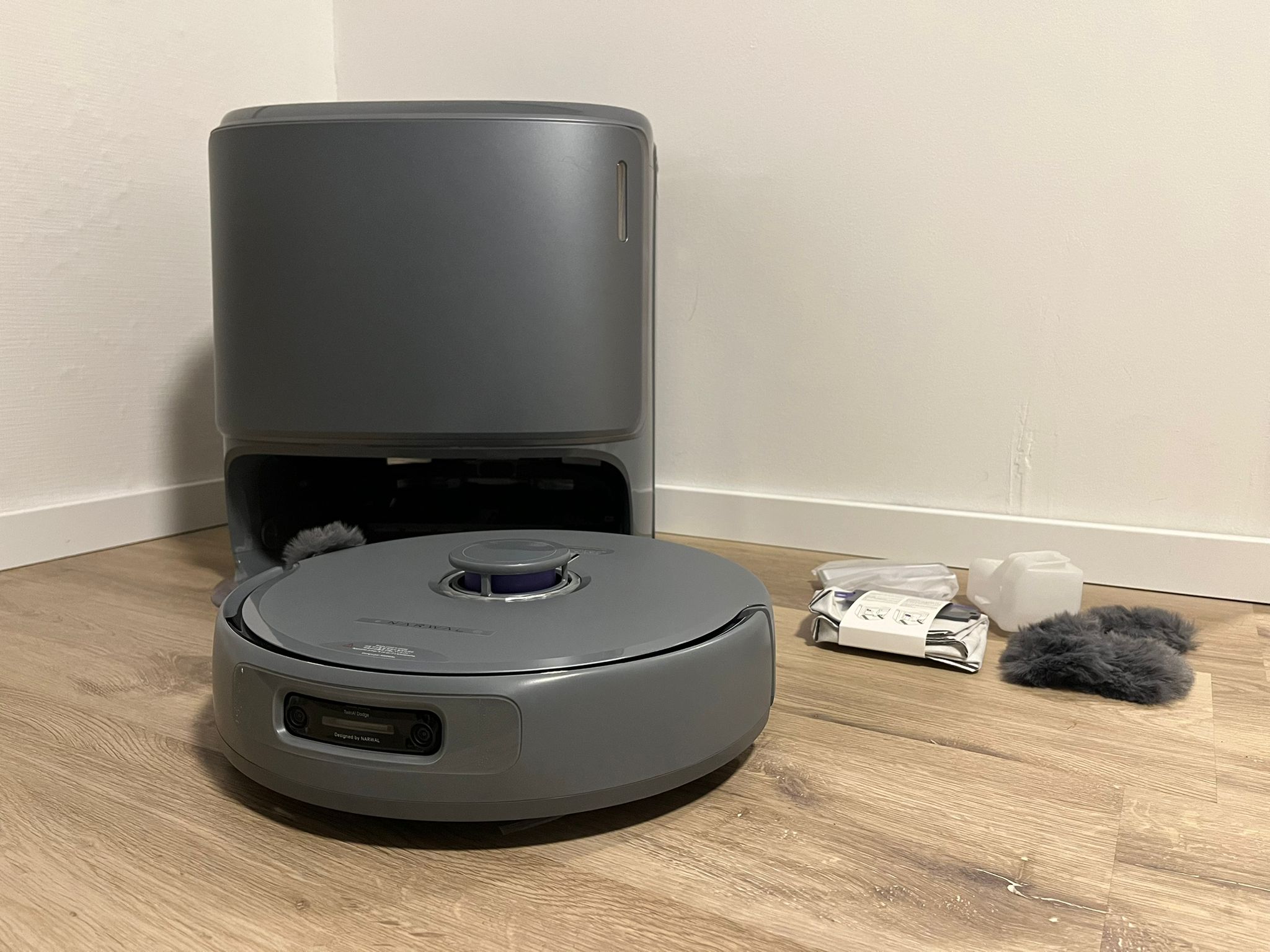 Da das Schmutzwasser in der Station analysiert wird, wischt der Roboter bei Bedarf Flächen erneut, um sie vollständig zu reinigen. Nach der Reinigung der Wischmopps trocknet sie die Station mit Heißluft. Dies ist hörbar, aber wirklich leise im Vergleich zu anderen Reinigungsstationen. Der Staub aus dem Roboter wird in einem Staubbehälter mit Beutel in der Station gesammelt. Der Beutel kann bei Bedarf einfach entsorgt werden. Damit verabschiedet sich Narwal von der Komprimierung des aufgesaugten Staubs, die die Vorgängermodelle nutzen, und tauscht sie gegen eine herkömmliche Absaugung wie bei der Konkurrenz. Damit soll nun ein Arbeitszyklus von 120 Tagen ohne Staubentleerung durch den Nutzer erreicht werden, zuvor waren es rund 50 Tage.