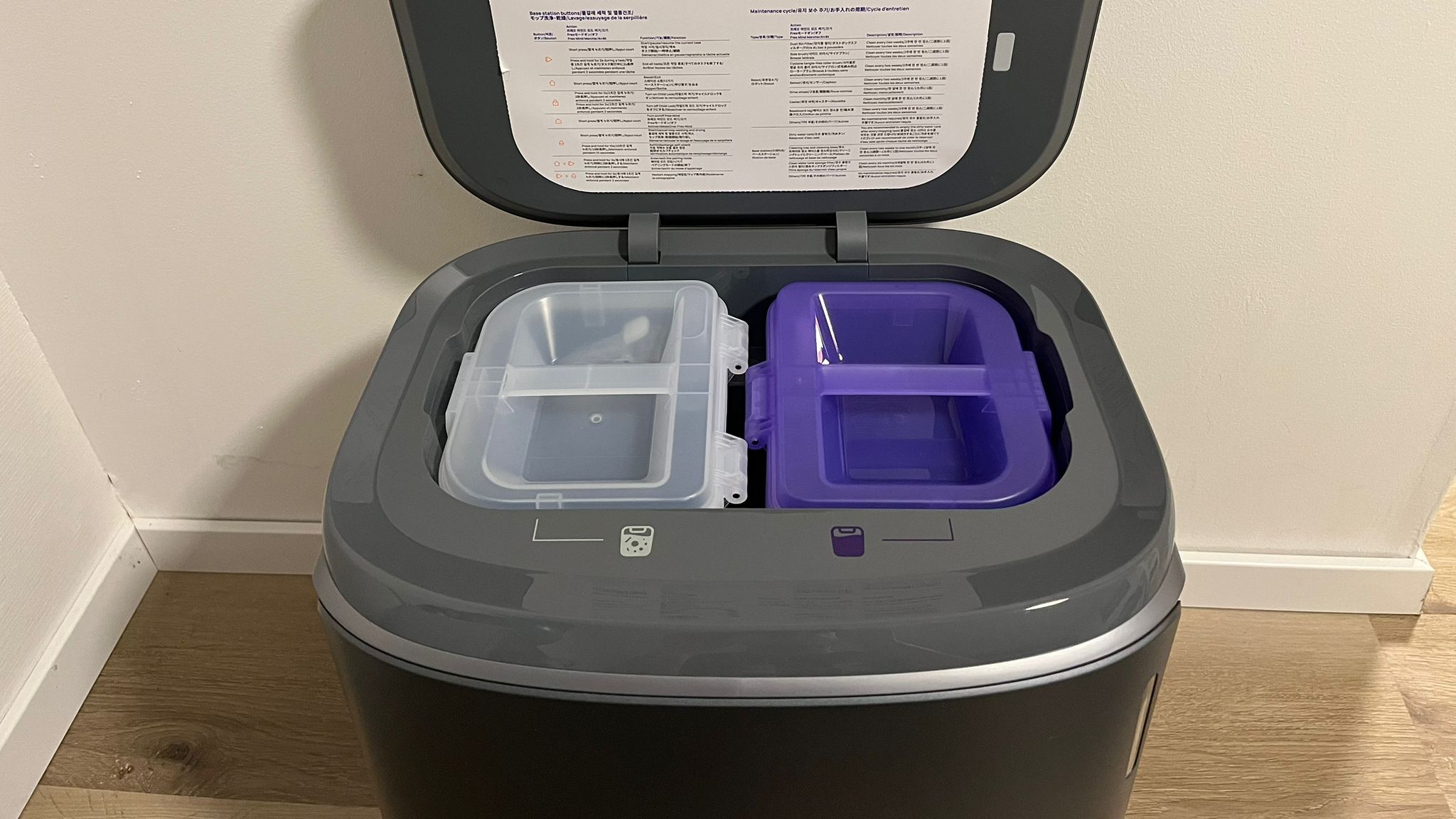 Die Reinigungsstation macht ebenso wie der Roboter selbst einen guten Job. Der Narwal Freo Z Ultra fährt die Station auf Wunsch nach jedem Raum zur Reinigung an. Durch einen Frischwasserbehälter in der Station bekommt er Frischwasser zum Wischen. In einem Schmutzwasserbehälter wird das Schmutzwasser gespeichert. Die Wischtücher werden mit heißem Wasser ausgewaschen. Zudem liefert Narwal ein spezielles Reinigungsmittel mit, welches in einer gesonderten Kartusche in der Station platziert werden kann. Das mitgelieferte Mittel riecht angenehm frisch und schmiert nicht.