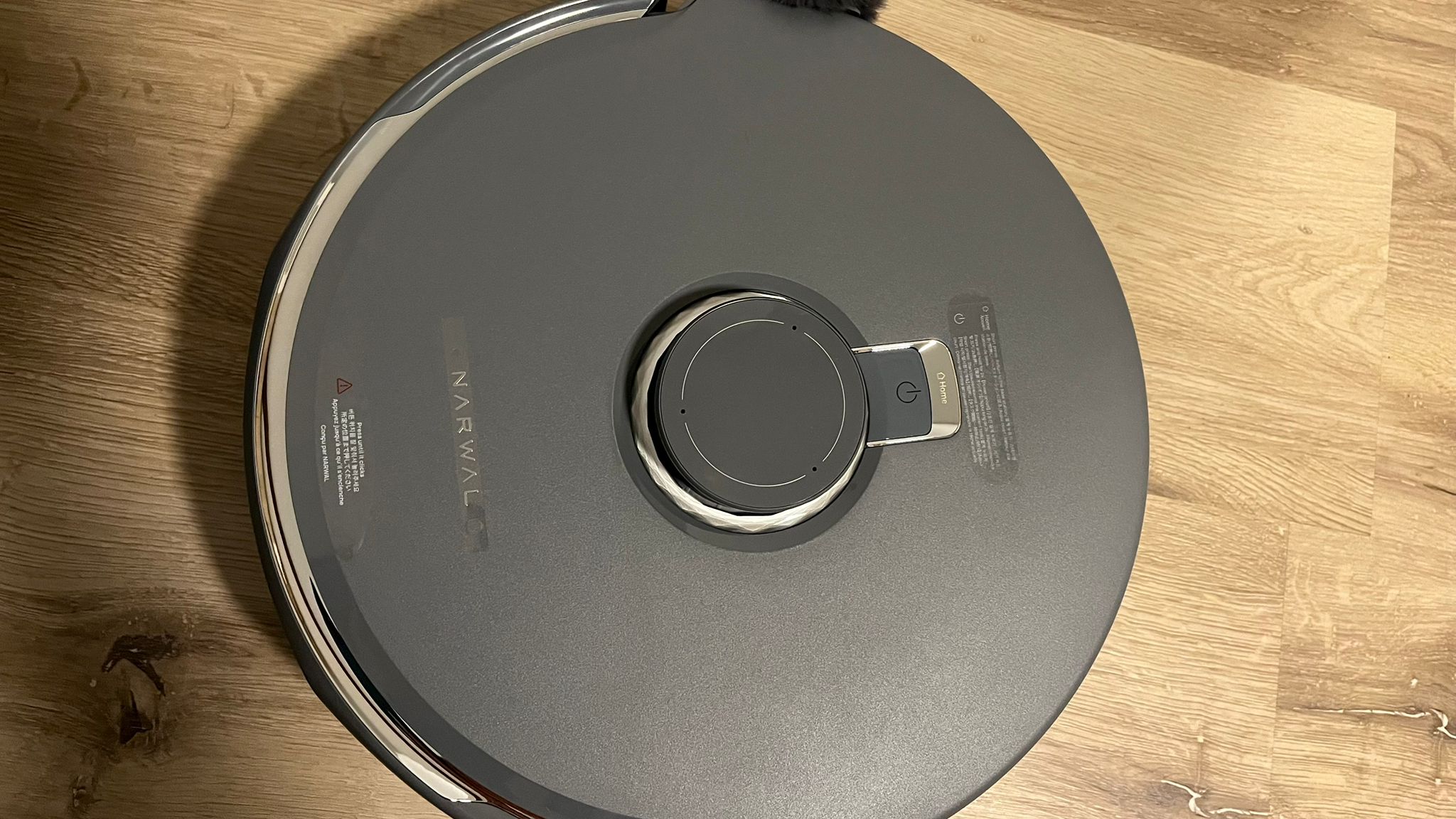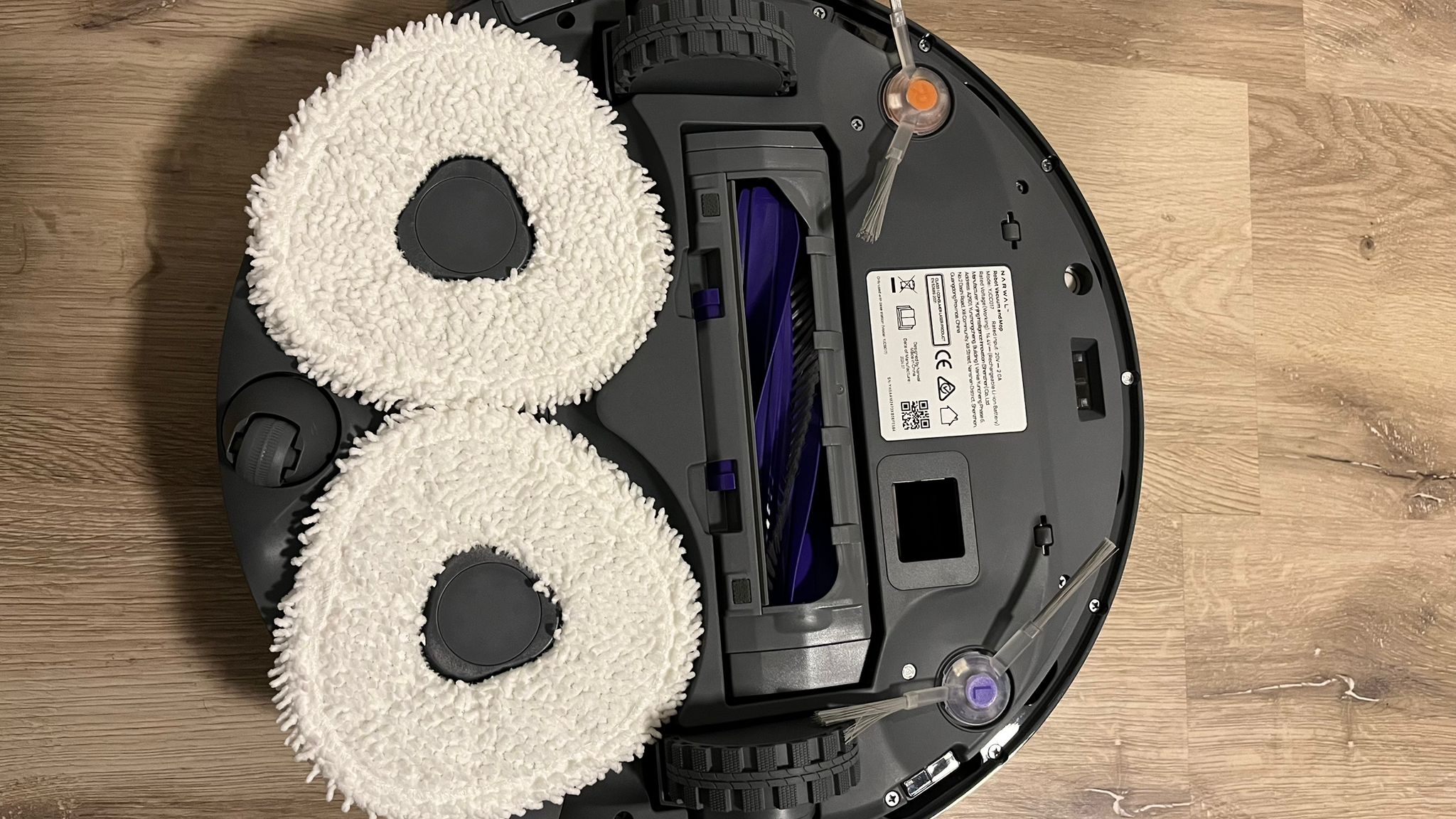 Die rotierenden Wischtücher an der Unterseite des Roboters drehen sich bei Bedarf mit Abwärtsdruck für eine noch präzisere und gründlichere Reinigung. Die Wischmopps sind mit Klett an den Rotoren befestigt und abnehmbar. Sie können problemlos in der Waschmaschine gereinigt werden. Durch eine intelligente Lift-Funktion werden die Wischtücher automatisch um 12 mm angehoben, wenn der Narwal vor sich festen Schmutz oder Teppichboden erkennt. Zudem erhöht er die Saugkraft. Bei nassem Schmutz hingegen wird der Druck der Wischmopps erhöht und die Rotation der Bürsten wird gestoppt. Dies gelingt ihm im Test gut.