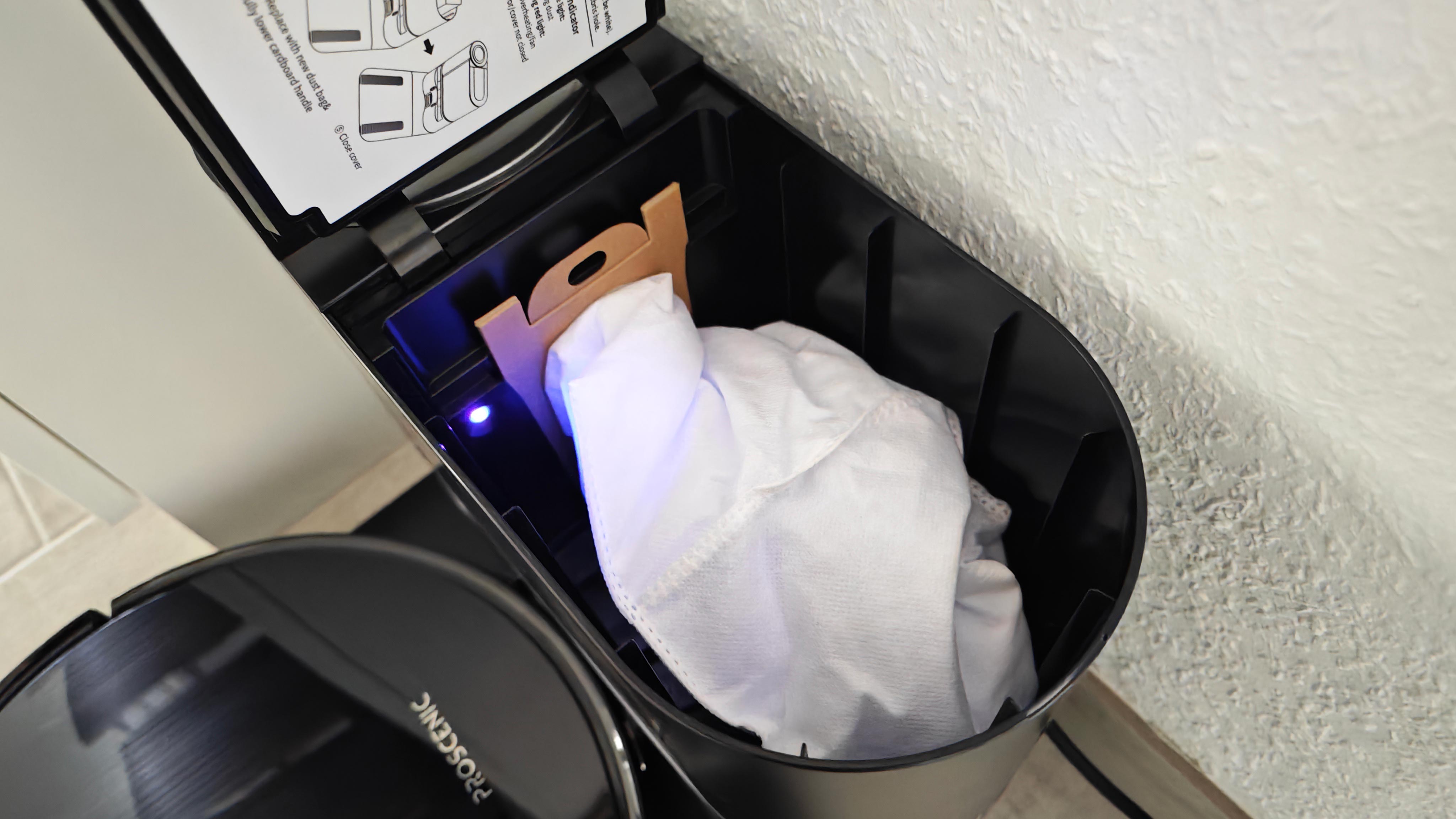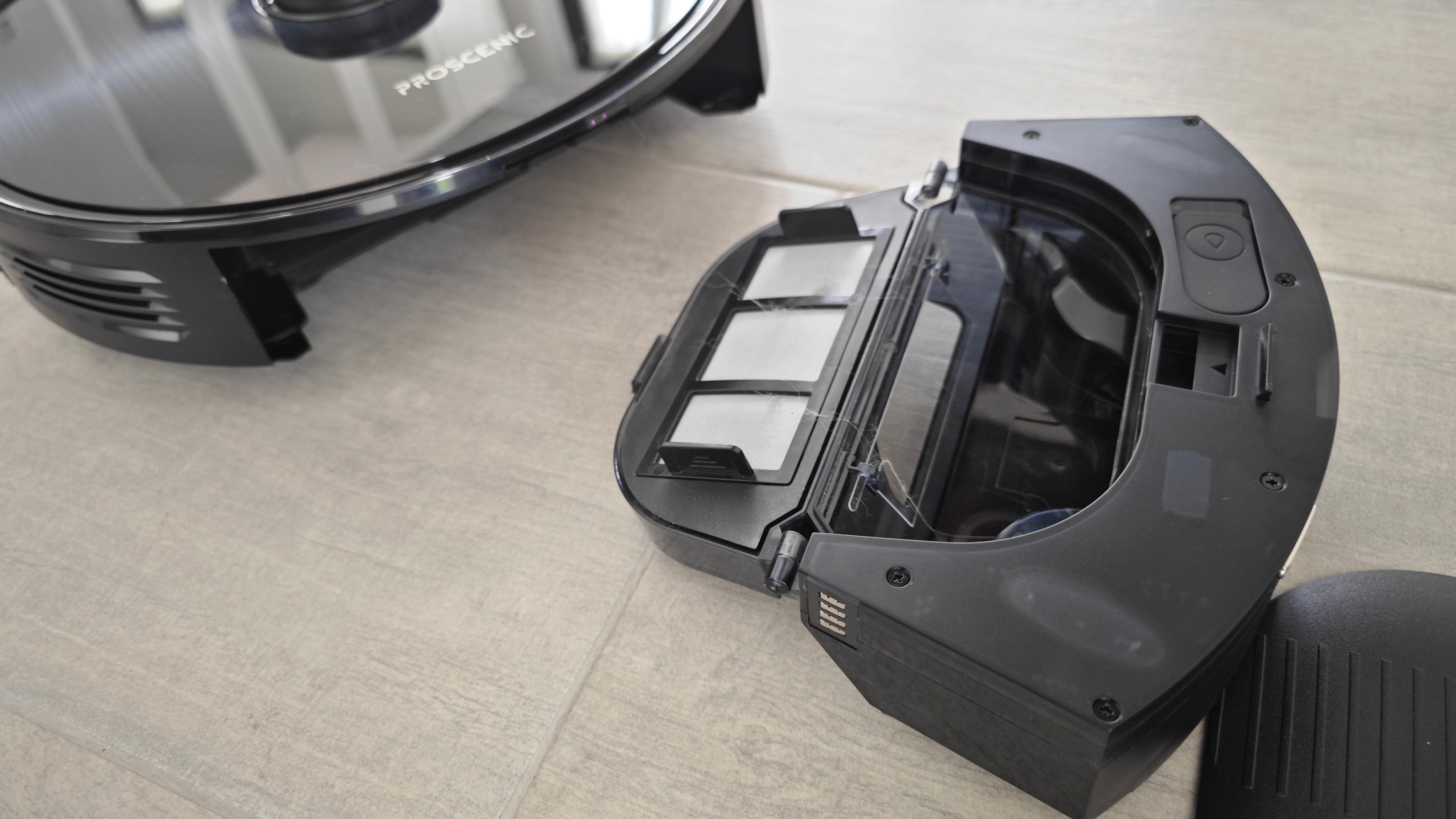 Entsprechend benötigt der Bot regelmäßige Eingriffe in Form von Reinigung und Nachfüllen von Flüssigkeit, denn der kombinierte Staub- und Wasserbehälter fasst jeweils nur 250 Milliliter. Die Absaugung nach dem Reinigungsvorgang ist wie immer laut, aber recht kurz und gründlich. Zusätzlich verspricht Proscenic eine Sterilisation von Bakterien und Allergenen per UV-Licht – das können wir nicht überprüfen, allerdings klingt das für uns auch nicht unbedingt nach einem Must-Have-Feature.