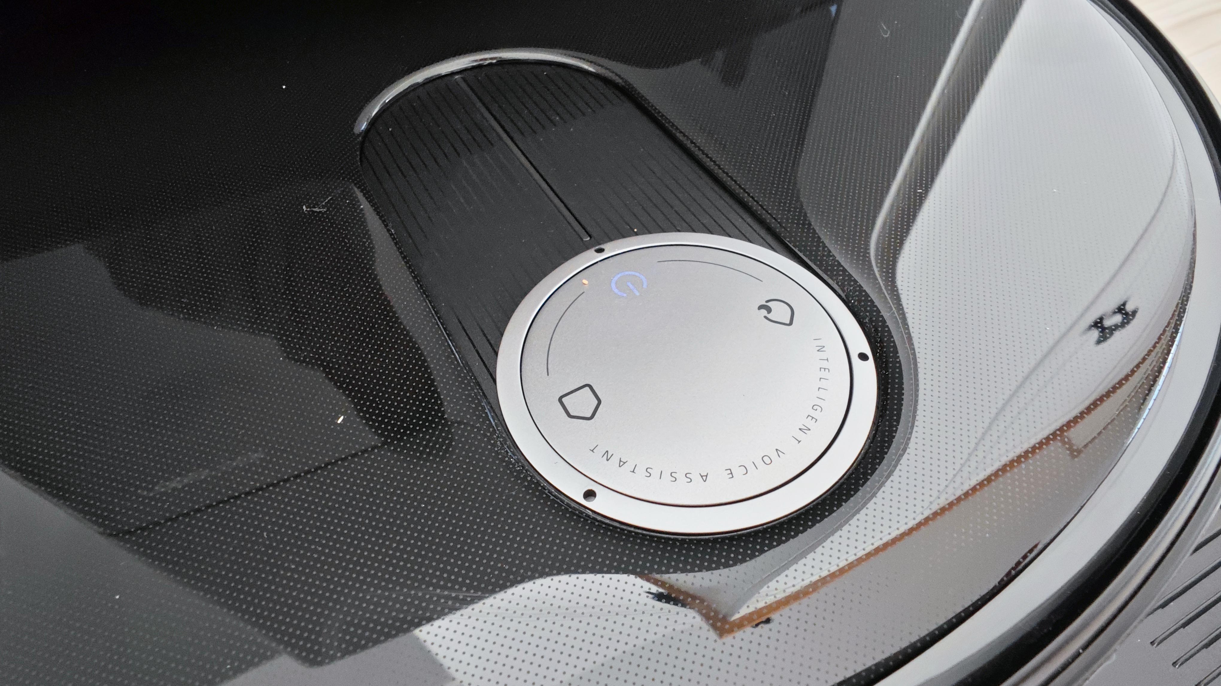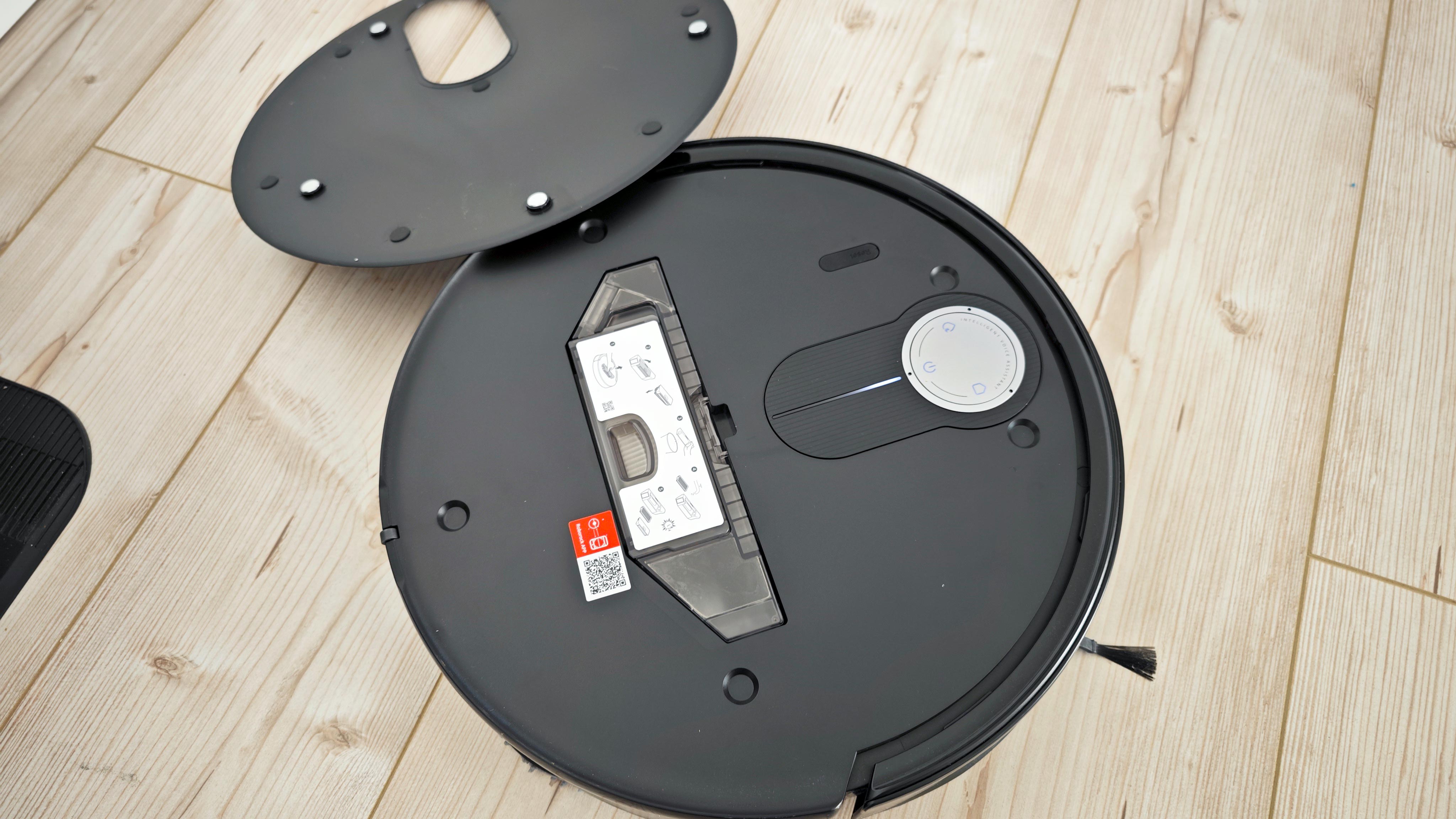 Beim Design macht der Hersteller ebenfalls alles richtig. Die drei Bedienknöpfe, die die meisten Saugroboter auf der Oberseite haben, sind beim Qrevo Slim in einem runden Element installiert – eine Reminiszenz an den sonst dort installierten Lidar-Turm. Dahinter erstreckt sich eine Öffnung im magnetisch gehaltenen und komplett abnehmbaren Deckel, sodass sich dort eine ovale Vertiefung ergibt. Darin integriert Roborock einen LED-Streifen, der im Betrieb weiß leuchtet.