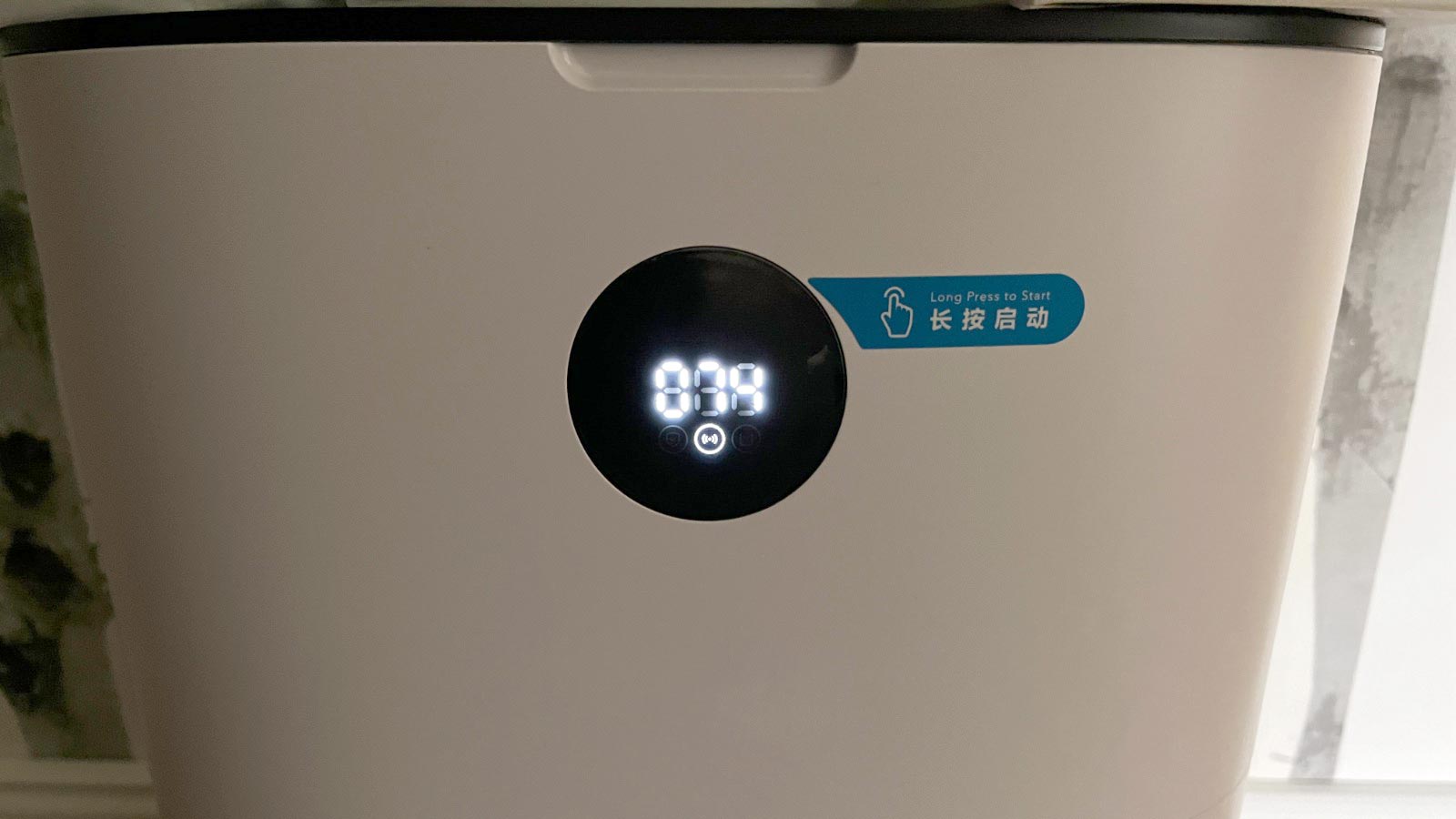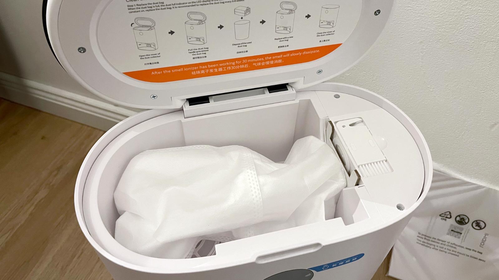 Die Absaugstation wirkt recht klein im Vergleich zu anderen Robotern aus unseren Tests und zudem dank ihrer Rundungen fast schon organisch. Oben auf der Station befindet sich ein Klappdeckel, um den Staubbeutel bei Bedarf zu wechseln. Vorne ist im oberen Bereich ein LED-Display zu sehen. Weiter unten befindet sich die Ladeaufnahme des Roboters mit den Ladekontakten und der Einrichtung der Staubabsaugung. Hinter der Absaugstation befindet sich der Ladeanschluss.