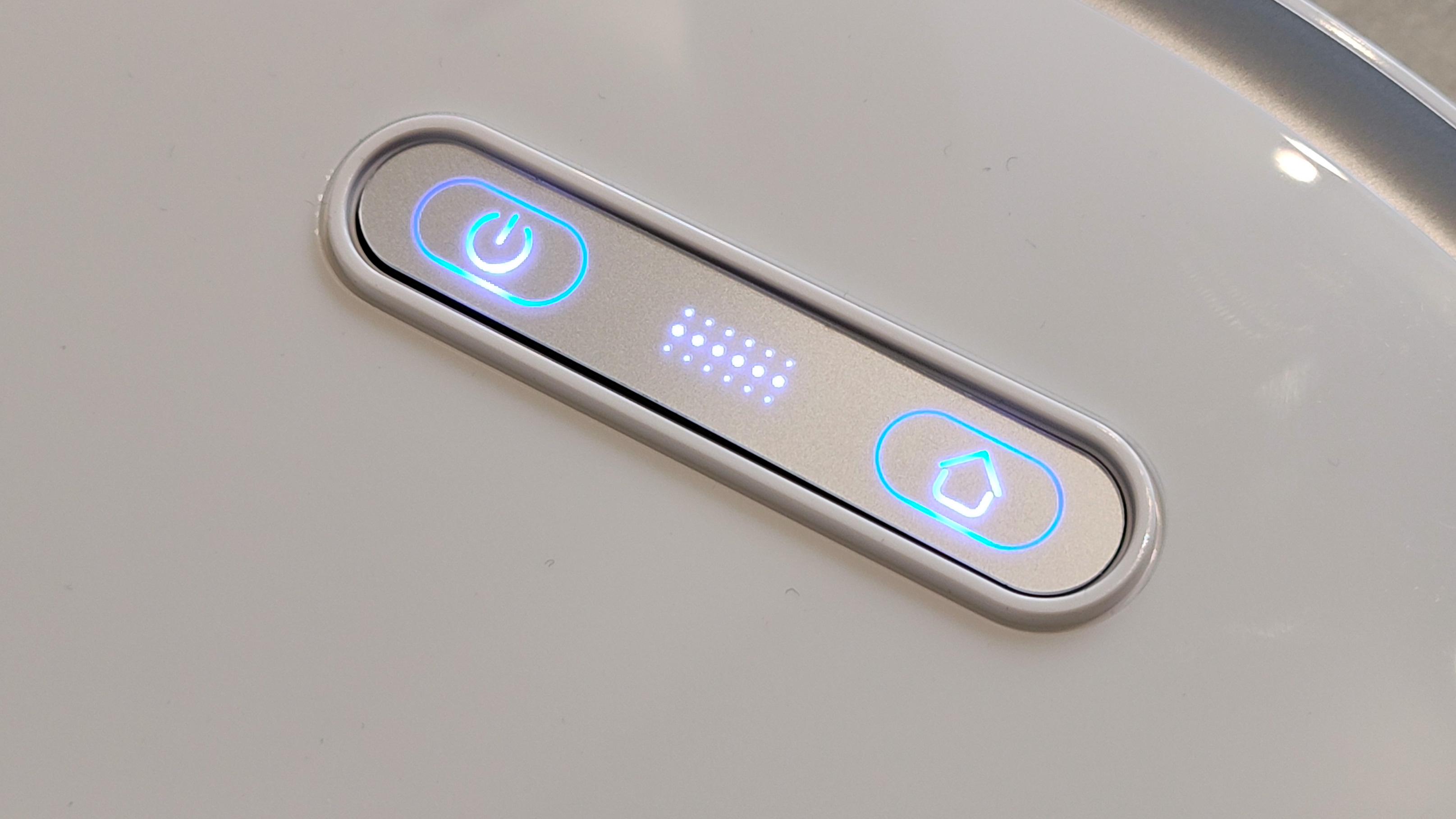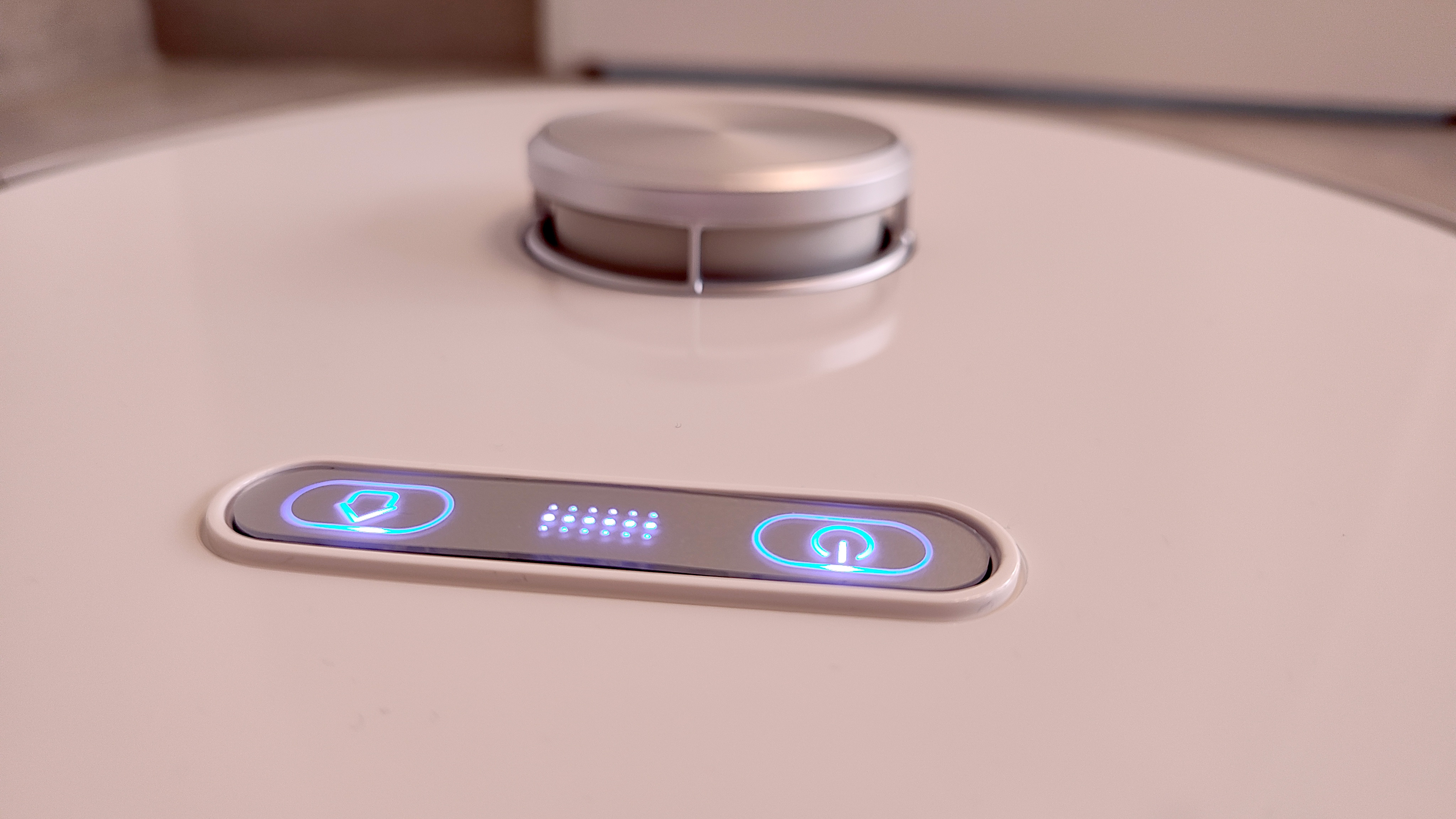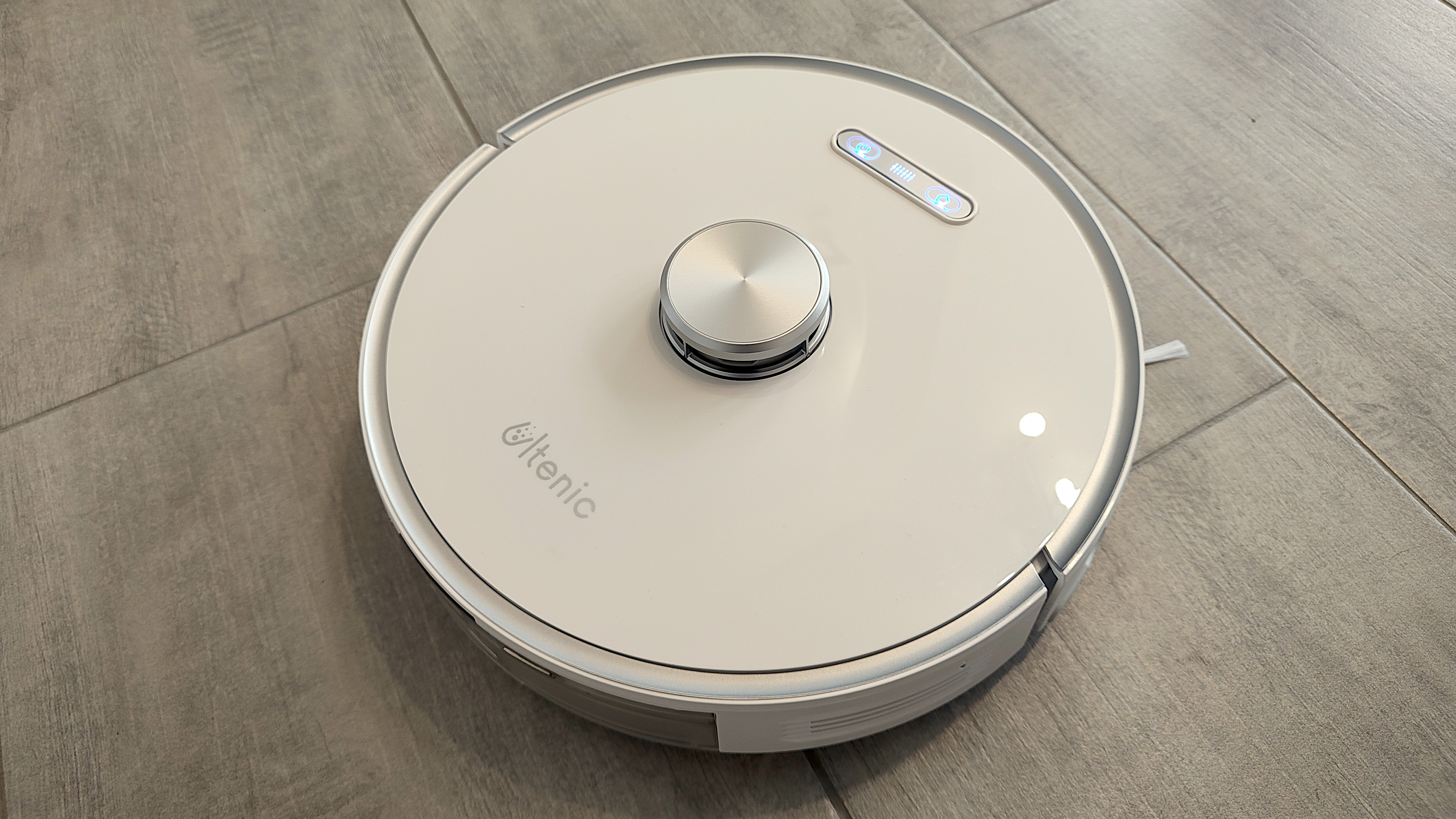 Weiß und rund ist er, der Ultenic T10. Das ist heute keine Überraschung, die Mehrheit der Saugroboter auf dem Markt ist so aufgebaut. Das trifft auch auf die einzelne Seitenbürste vorne links, die Hauptbürste mit Bürstenreihen und Gummilamellen und den Laserturm mittig auf der Oberseite des Roboters zu. Etwas groß und klobig geraten sind die drei mechanischen Bedienelemente vorn auf der Oberseite, die in intensiven Farben leuchten und blinken.