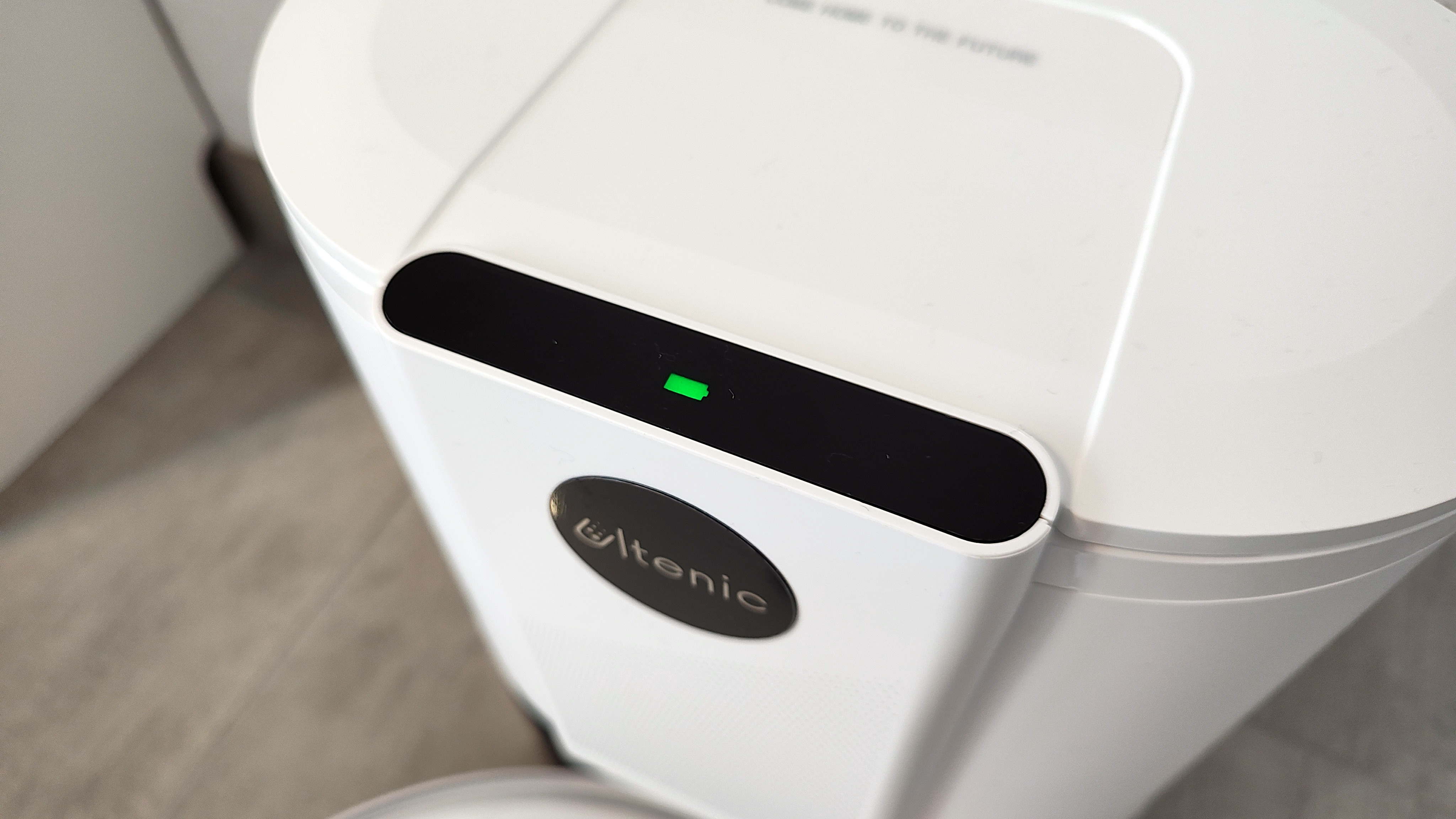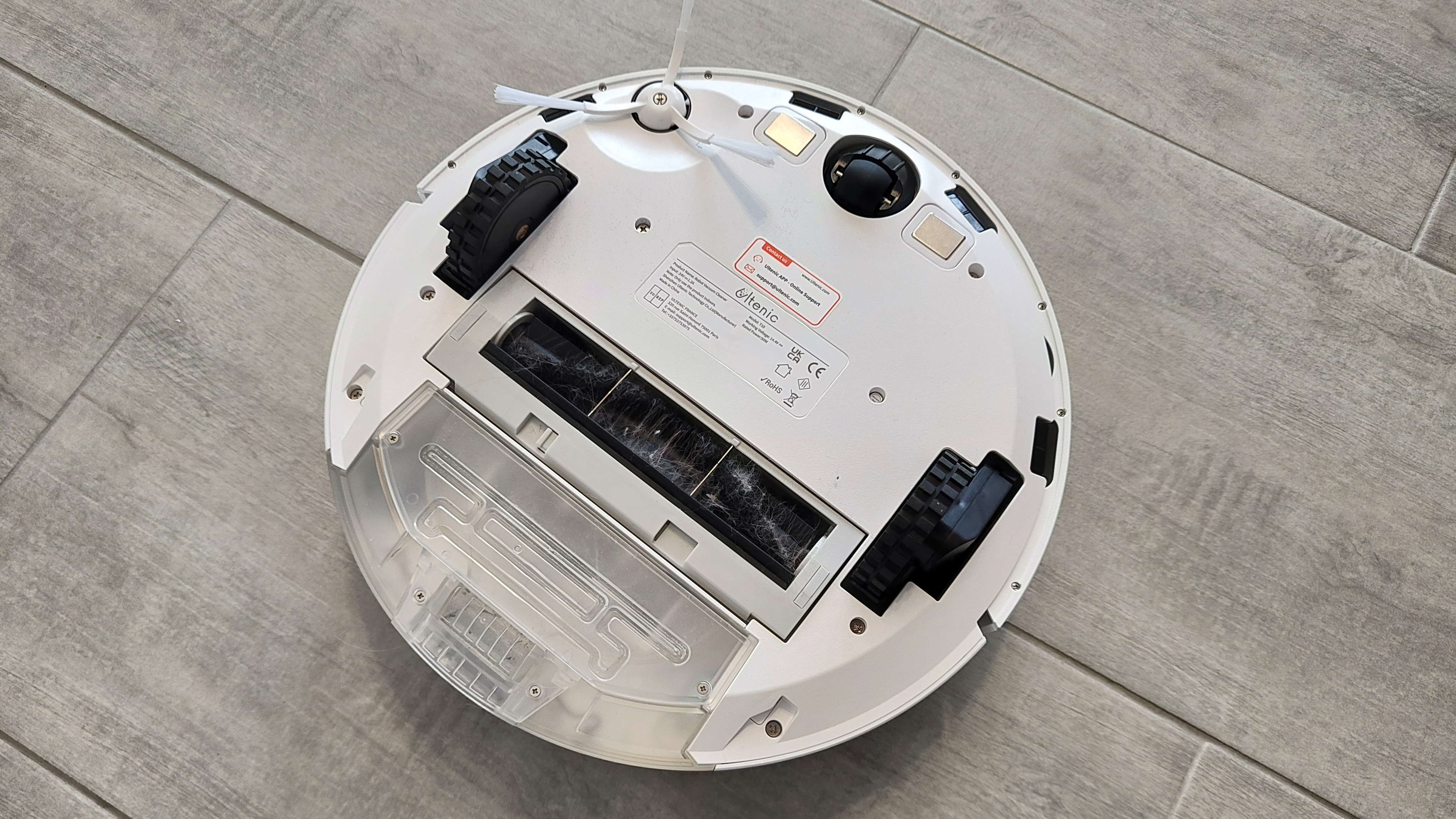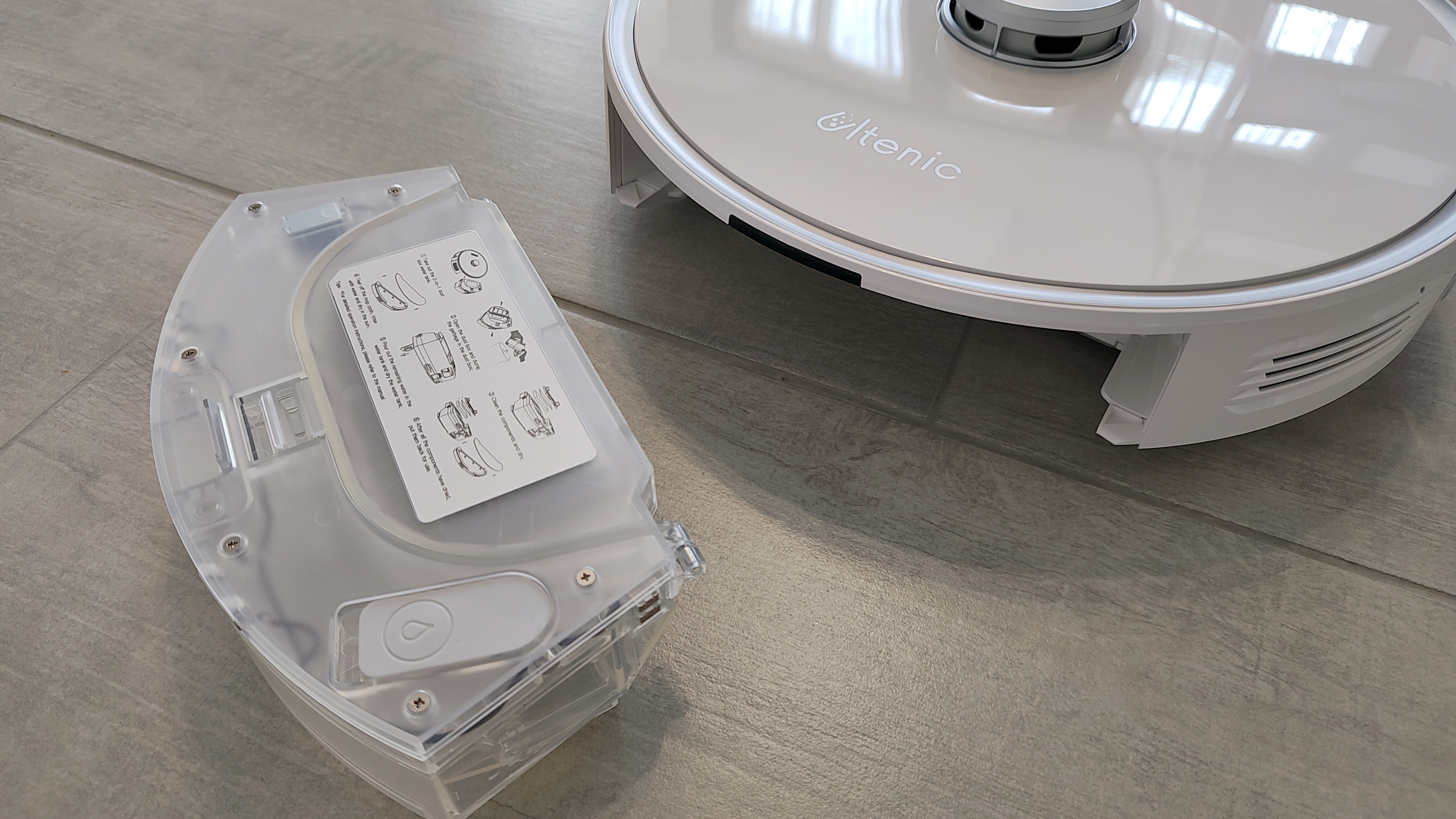 Hochwertig wirkt die Verwendung von Glas auf der Oberseite, hier setzen die meisten anderen Hersteller auf Kunststoff. Nachteil: Glas ist schwerer und die Oberseite lässt sich bei solchen Modellen nicht aufklappen. Stattdessen wird der Staubbehälter, der gleichzeitig auch Wassertank ist, hinten in das Gerät eingeschoben. Auch wenn die Glasplatte oben edel erscheint, trifft das auf die silbernen Kunststoffapplikationen nur bedingt zu. Der durchsichtige Staubbehälter passt ebenfalls nicht so recht ins Bild. Insgesamt wirkt der Ultenic T10 aber alles andere als billig und hinterlässt einen ausreichend guten Wertigeitseindruck.