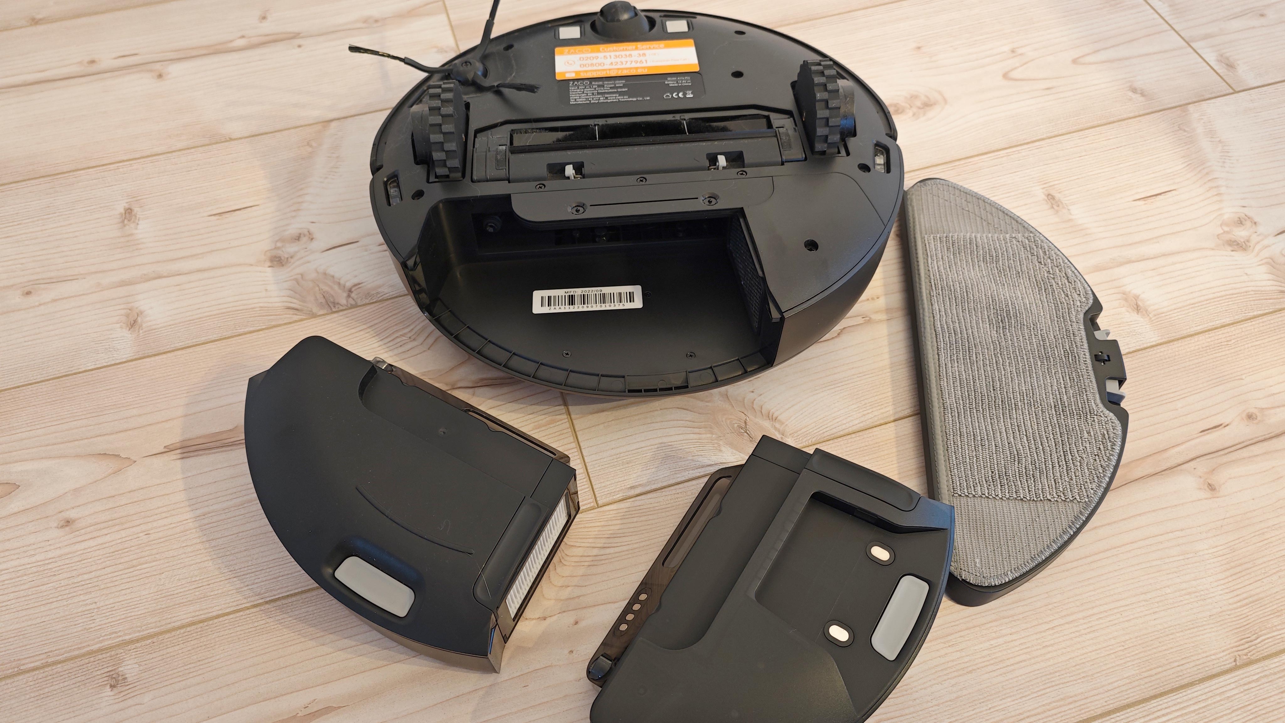 Beim Wischen macht der Roboter eigentlich eine ziemlich gute Figur, zumindest bezogen auf die reine Reinigungsleistung. Dass letztlich zu Spitzenmodellen trotzdem ein recht großer Abstand bleibt, liegt an anderen Dingen. Gemeint ist nicht allein die Wischleistung, denn die ist dank bis zu 10.000 Vibrationen pro Minute in etwa auf dem Niveau von Roborock oder Dreame. Allerdings verlangt das Zaco-Modell dafür zuvor den Wechsel des mit 550 ml ziemlichen großen Schmutzbehälters auf einen Kombibehälter mit 300 ml für Schmutz und 250 ml für Wischwasser. Nur er bietet die Vibrationsfunktion und eine Wischtuchaufnahme.
