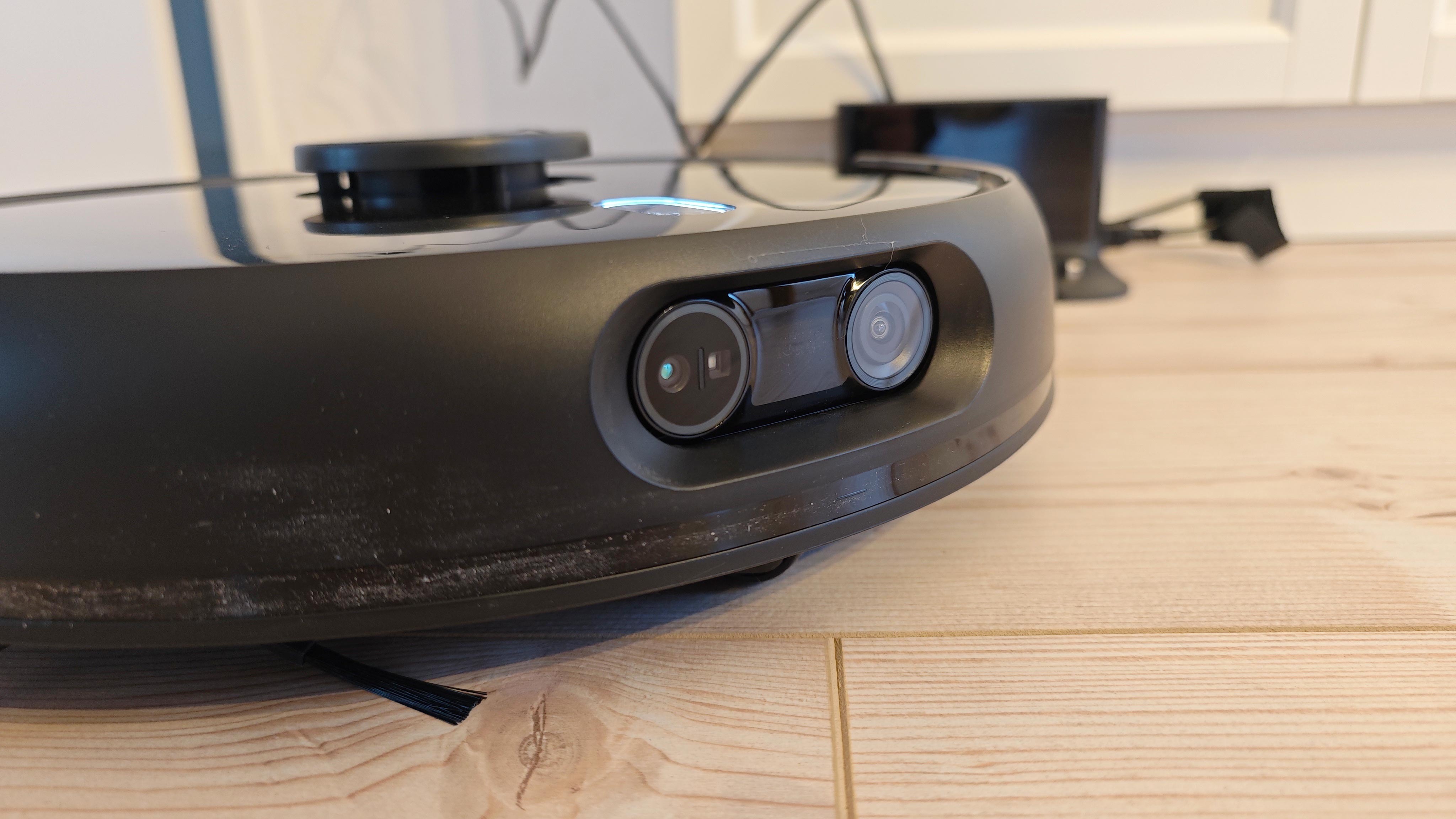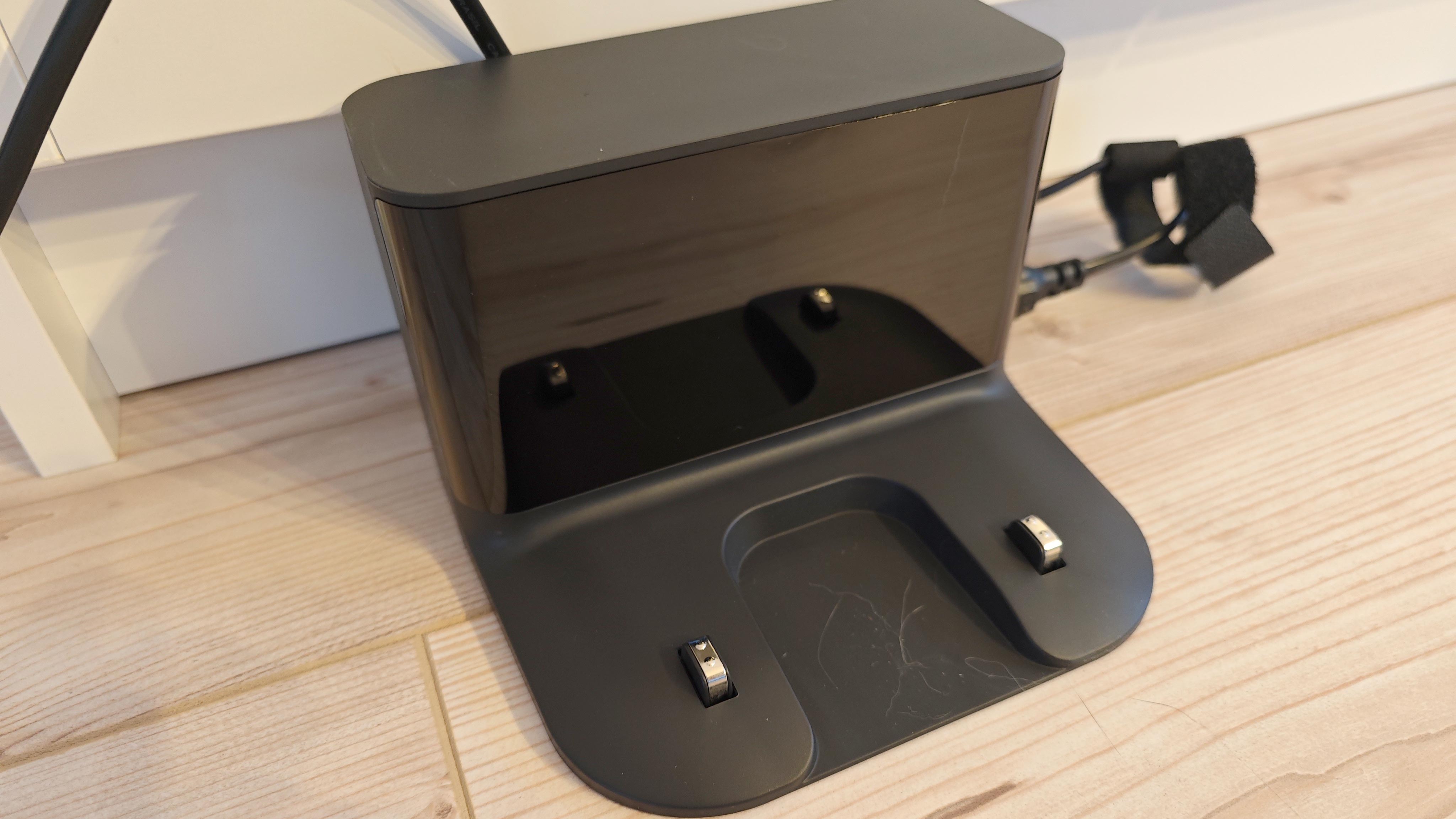 Der Laserturm sitzt omnipräsent mittig auf dem Modell. Rechts vorn gibt es eine Seitenbürste und das auffälligste Merkmal – wenn man es wegen der schwarzen Farbgebung erst einmal gesehen hat – ist die Doppeloptik im Front-Bumper, mit der der Roboter Hindernisse in seinem Fahrweg erkennen soll. Die Ladestation ist einfach und funktional, leider entbehrt sie aber eines Kabelmanagements und das Stromkabel lässt sich nur auf der rechten Seite anschließen. Das kann die Aufstellung theoretisch je nach Ort etwas erschweren.