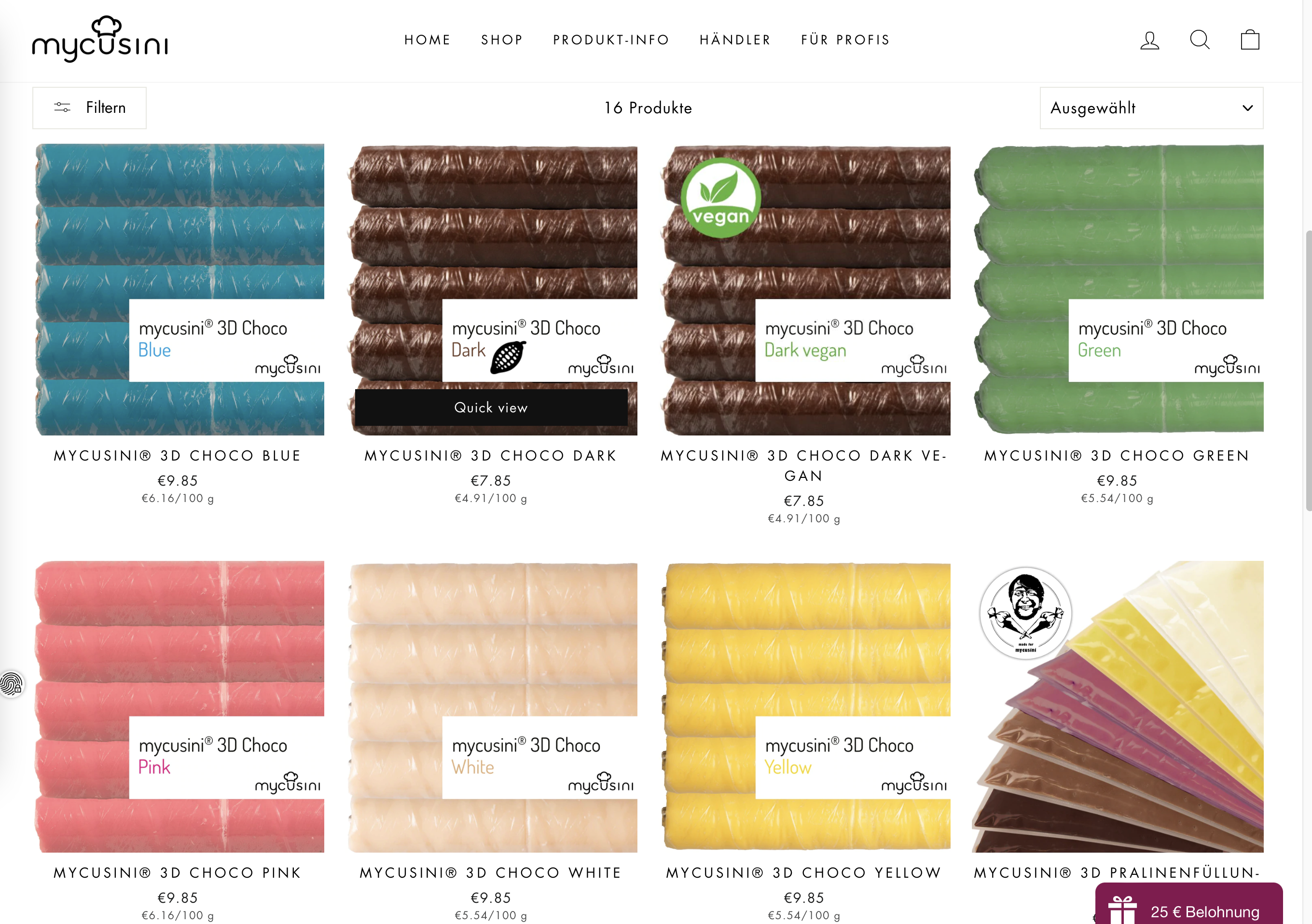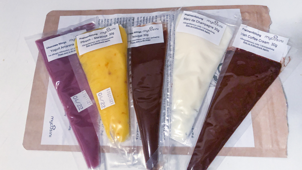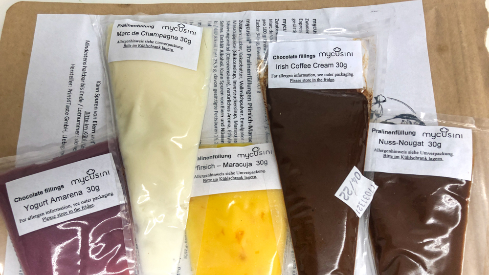 Der mycusini 2.0 arbeitet mir echter Schokolade, die in unterschiedlichen Farben und verschiedenen Geschmacksrichtungen beim Hersteller erhältlich ist. Selbst eine vegane Schokolade findet sich im Repertoire des mycusini 2.0.