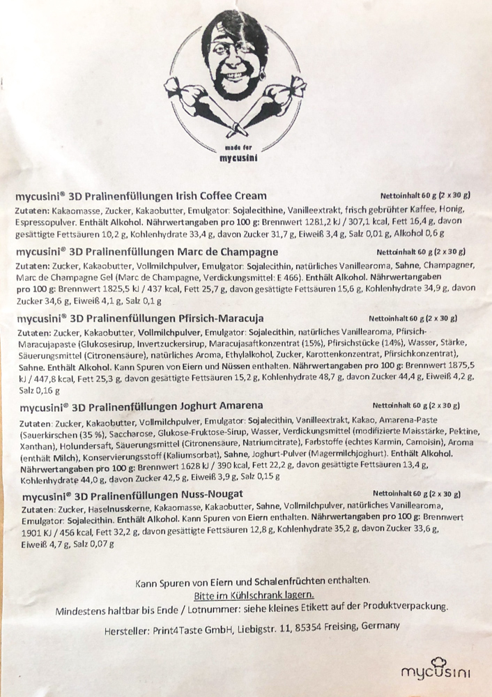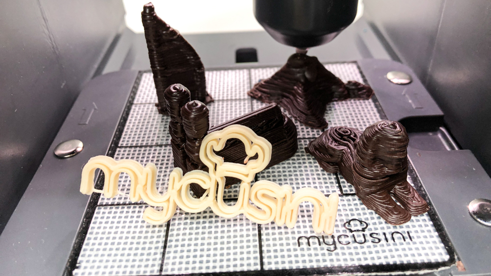 Neben diversen Selbstbaulösungen gibt es für süßen 3D-Druck mittlerweile auch einen offiziell zertifizierten Lebensmitteldrucker, der so am Markt erhältlich ist: den mycusini 2.0. Dieser wird in Deutschland vom Freisinger Unternehmen Print4Taste entwickelt und hergestellt.