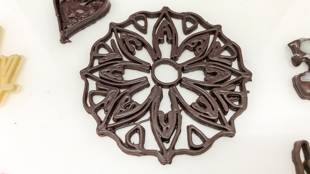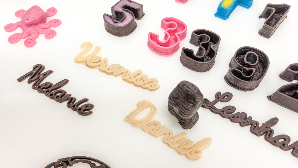 Im Großen und Ganzen sind wir sehr begeistert von den Druckergebnissen. Um ein professionelles Meinungsbild zu bekommen, haben wir unsere Ausdrucke einer Konditormeisterin gezeigt. Bei manchen Teilen musste sie natürlich schmunzeln, geschwungene Schriftzüge sind das Alltagsgeschäft in einer Konditorei. Auch werden Pralinenhohlformen in einer Konditorei in Serie schneller hergestellt als mit dem 3D Drucker. An dieser Stelle hätten wir uns gewünscht, dass man mehrere Drucke in einem Druckvorgang durchführen könnte. Dies ist aber mit dem mycusini 2.0 baubedingt und materialtechnisch nicht möglich. Doch auch die Konditorin hat anerkannt, dass Drucke mit vielen geraden Linien wie bei den Ornamenten oder den eckigen Buchstaben mit der Hand so nicht möglich sind.